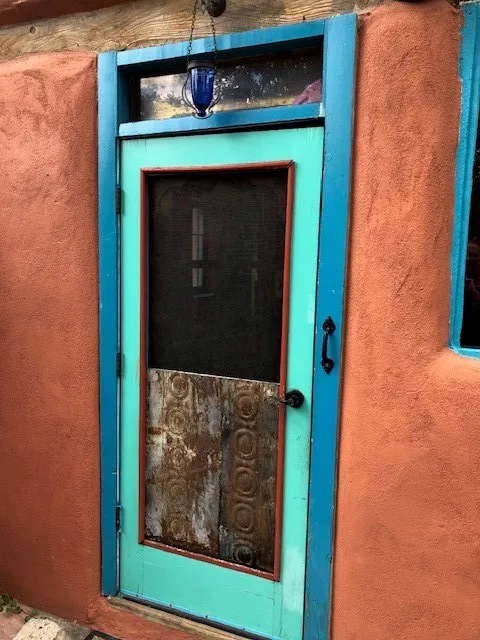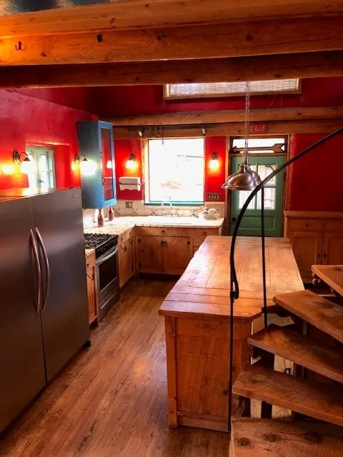 This one-of-a-kind adobe house has a fascinating history. It was built as a “bounty house” after the Civil War: soldiers could have a piece of land for free if they built a certain minimum size house on it. The bounty house is the living room of this house – a large room with wood floor and high ceiling made of vigas and latillas. With a red enamel gas stove at the far end, a built-in bookcase near the front door, and Mexican light fixtures, it is a charming entry to the house. The rest of the house was built onto this structure later and includes a bathroom with walk-in tub, a laundry area, and a large homey kitchen downstairs. The kitchen has a large 5-burner gas stove and large matching refrigerator and freezer. A spiral staircase leads upstairs to the bedroom, which has bathroom facilities in it (sink, toilet, and claw-foot tub), and a walk-in closet. The lot is 0.29 acres, green and lush and graced with large old trees. There is a large storage shed with slab floor and a couple of patios off the house. The whole property is walled or fenced, and there is an electric gate. Truly a special property.