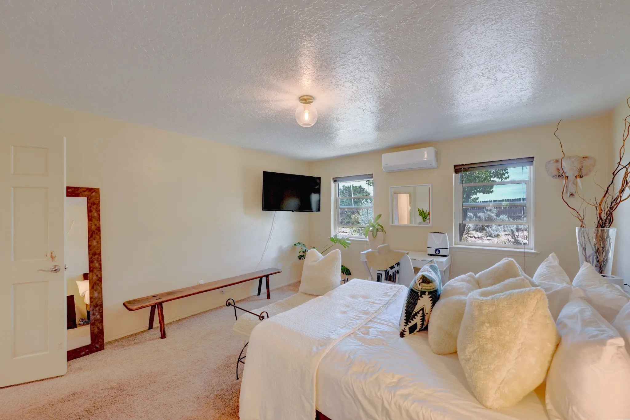 The heart of the home features a beautiful Kiva-style fireplace with its own intimate sitting area, perfect for cozy evenings or entertaining guests. Stay comfortable year-round with five newly installed mini-split systems ensuring optimal climate control in every corner of your home.