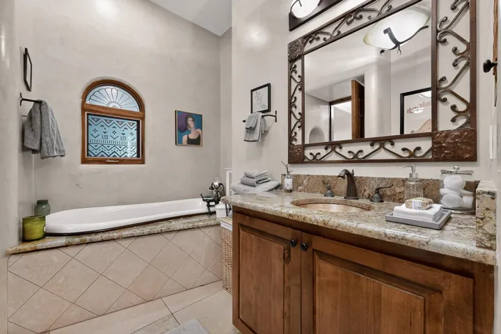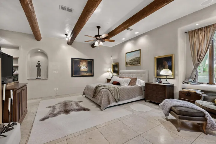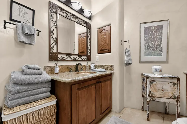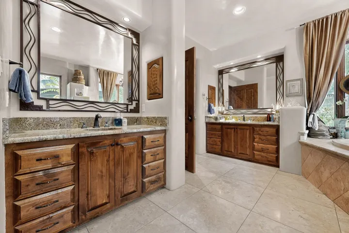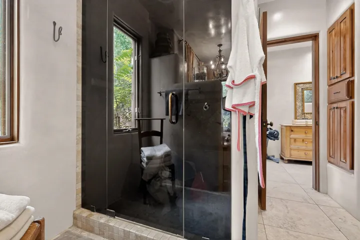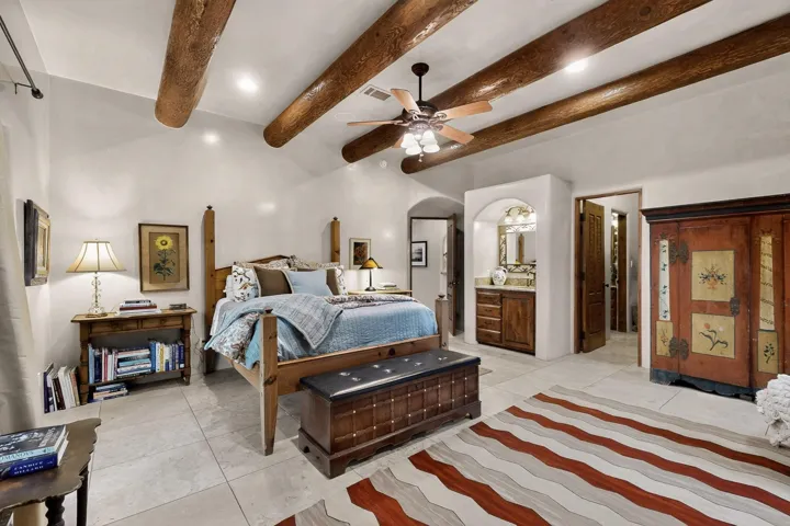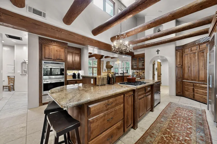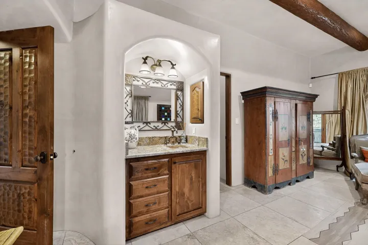 Step through a stunning carved wood door into a dramatic entry hall where marble floors, troweled plaster walls, and soaring ceilings with hand-carved vigas and beams establish a sense of warmth and authenticity. Rich details like custom cabinetry, forged copper sinks, graceful nichos, and artisan ironwork define the home’s character.