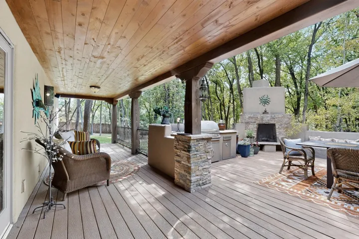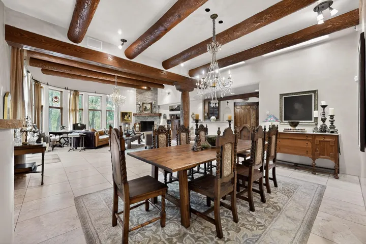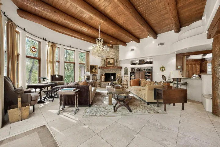 Outdoor living is just as refined: wraparound portals, an expansive deck with outdoor fireplace, a fully equipped kitchen, built-in bancos, and mature landscaping create a serene setting for gatherings or quiet reflection.