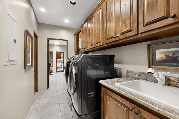 The luxurious primary suite is a true sanctuary, complete with a romantic fireplace, private patio with hot tub, and a spa-like bath featuring granite countertops, dual vanities, a travertine steam shower, and a deep jetted tub. A custom walk-in closet connects directly to the laundry room and a private home gym.