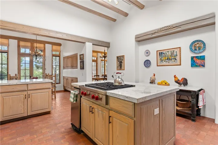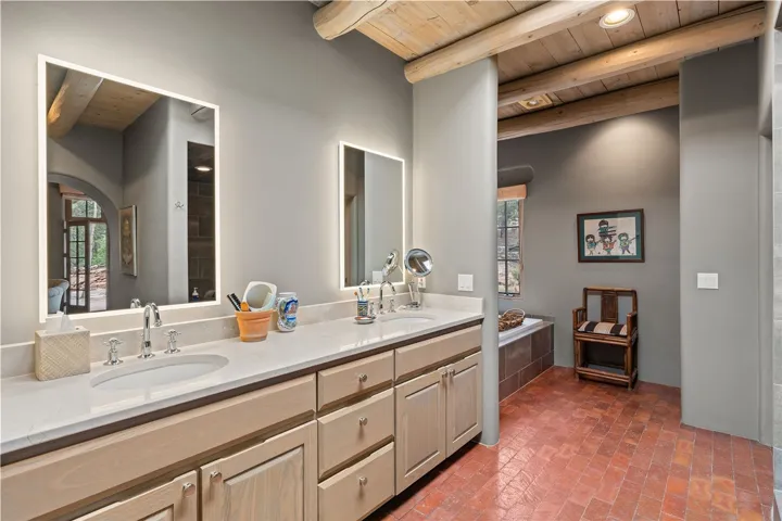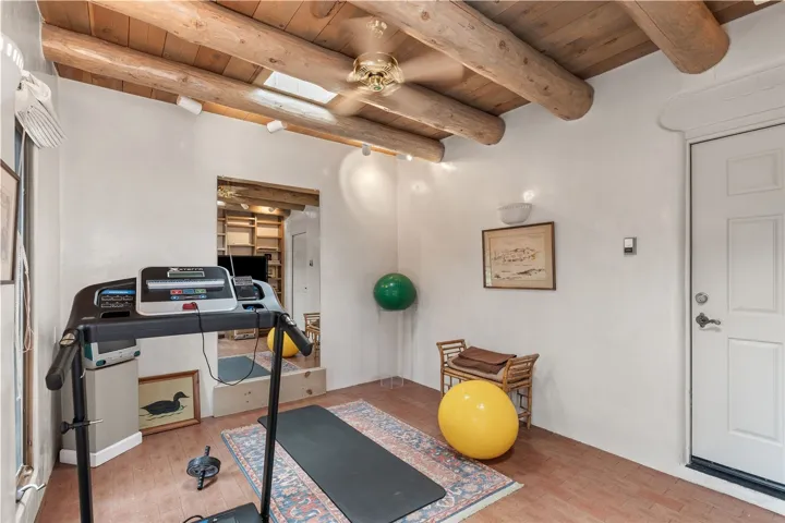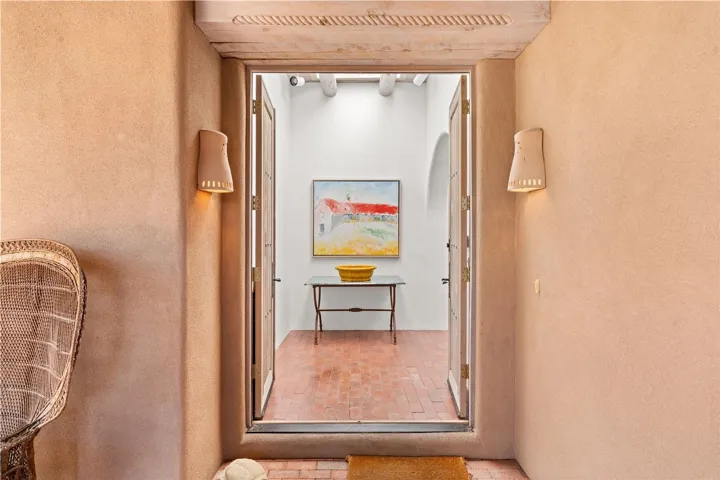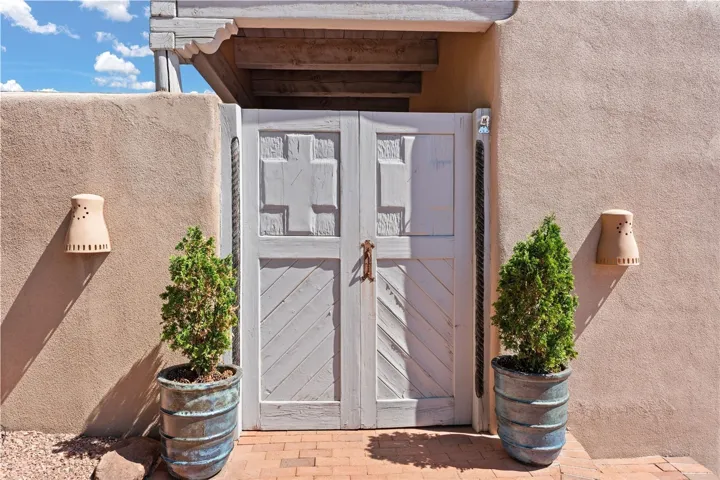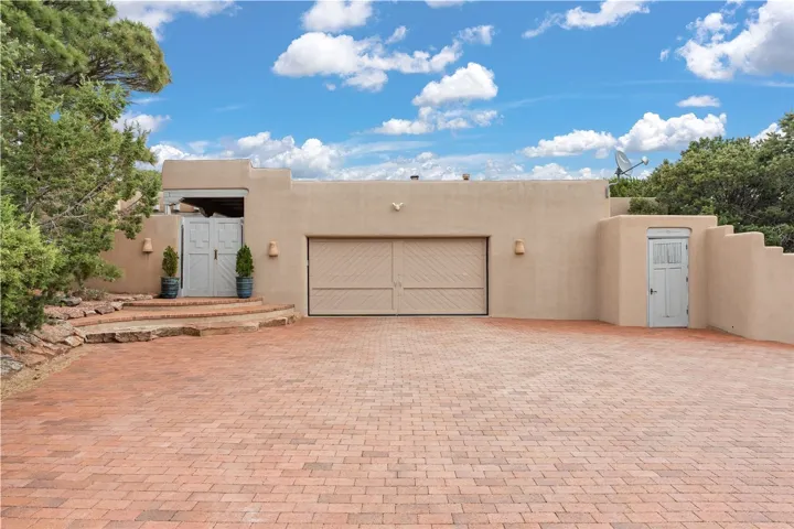 Gated Sangre de Cristo Estates 3 bedroom, 3.5 bath, single level, custom-built home with spectacular Sangre de Cristo Mountain views. Quality design features throughout include high ceilings, spacious rooms, vigas and beams, wood and brick floors, diamond finish plaster walls and arched doorways. Many recent improvements such as new (2023) membrane roof, completely renovated kitchen and baths, and brick driveways. Light and airy living room with stately fireplace. Spacious gourmet kitchen with high-end Bosch appliances, center island with Wolf gas range top, plentiful cabinetry and an informal breakfast room. Dining room with French doors and built in cabinetry. Dedicated personal library with a wood burning kiva fireplace and French doors to the outside in addition to a second living area or media room. There are 3-bedroom suites set apart from one another. Primary suite includes a kiva fireplace, sitting area and a wall of doors to the outside. Bonus flex space can be a personal gym or office. 2-car attached garage. The deep portals provide space for large events or leisurely relaxation in a secluded setting among mature piƱons and aspens, established landscaping, and sweeping mountain views. Conveniently located with easy access to 84/285 and only minutes away from the Santa Fe Opera and the historic downtown Plaza.