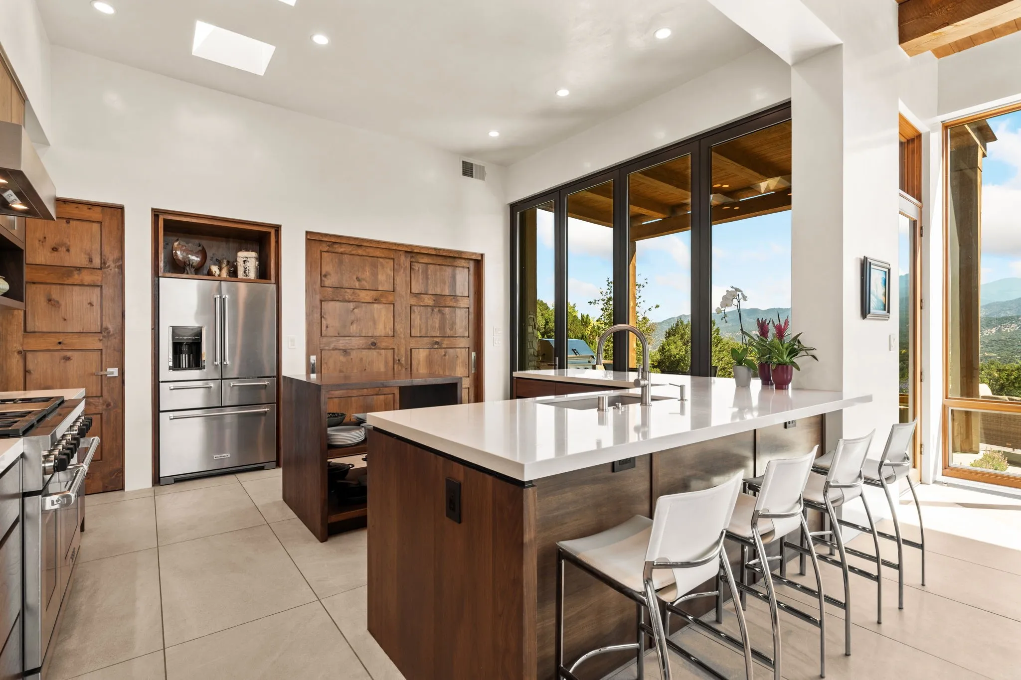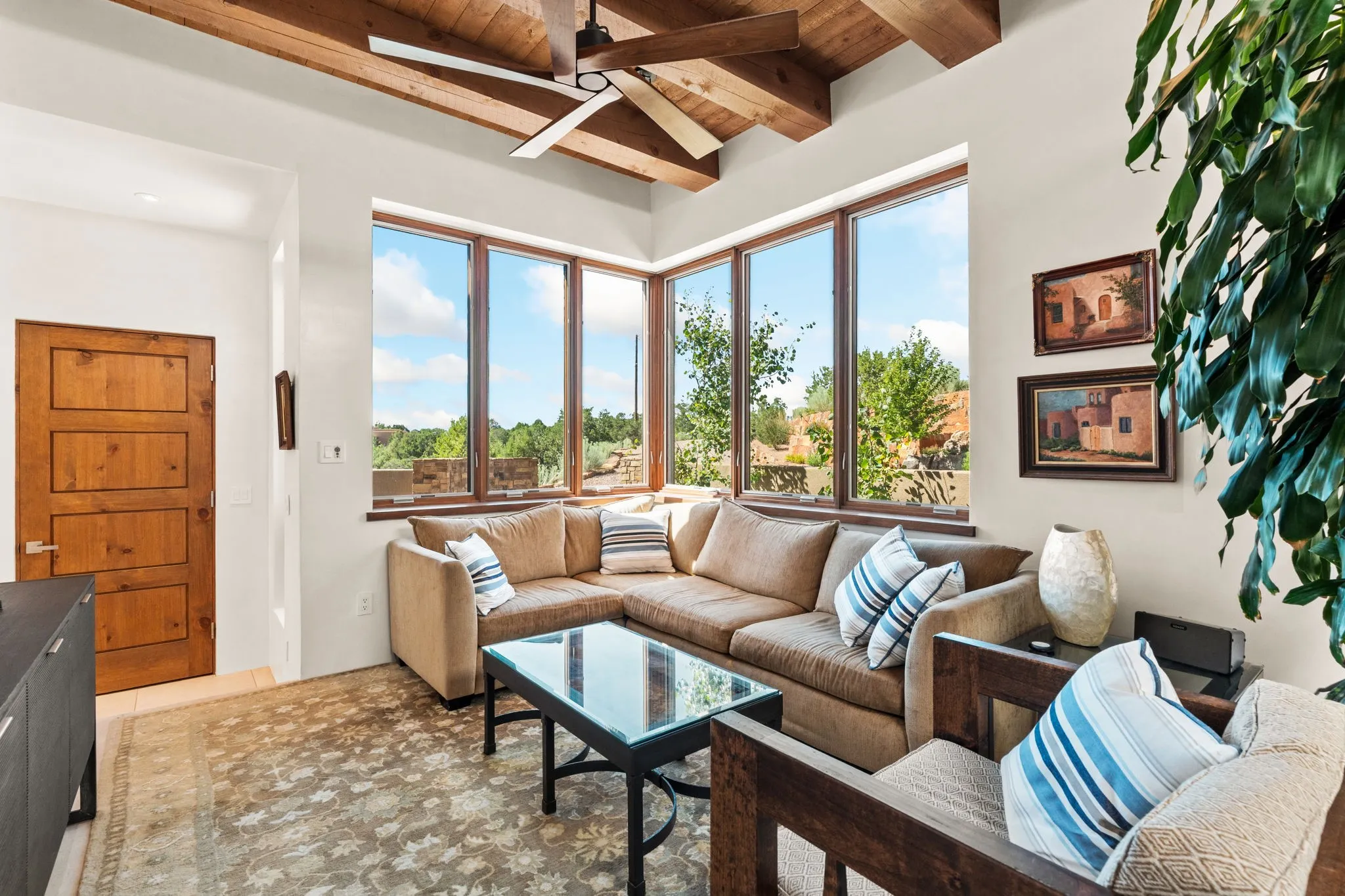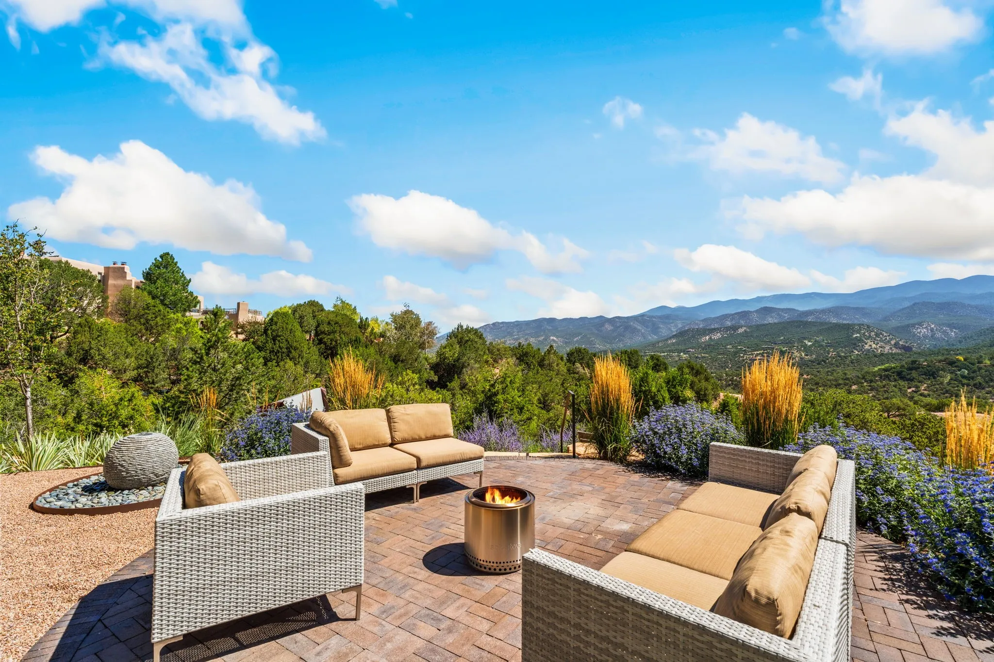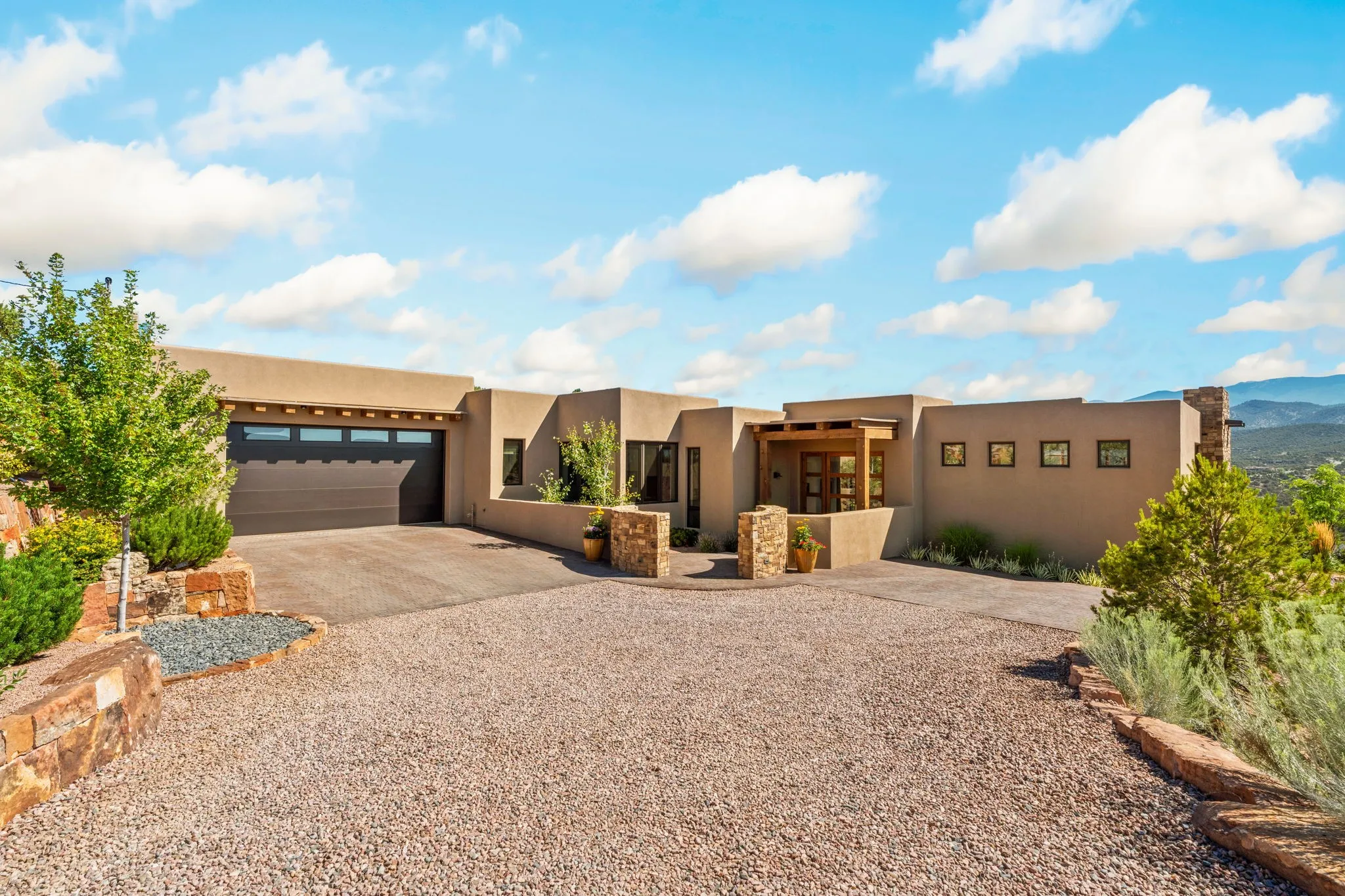 The Best Views in Santa Fe? Please come and judge for yourself! This relatively new home, designed and built by one of the owners of Tierra Concepts construction company, is a delight to live in. Owner is the Listing Broker of this property. We never tired of the changing views…watching the rainbows over the mountains, the snow plow lights at the ski basin, the deer wandering by, or the changing mountain colors! This 3 BR, 3 Bath home with a Great Room and a Den is well laid out and appointed. With many built in interior shades, the multi-opening Kitchen doors, drop down screen, and drop down wall mounted LR TV, it is easy to entertain of just cozy up and watch the grand view. The home has radiant floor heating as well as central heat and air. Hope you will love the home as much as we have!