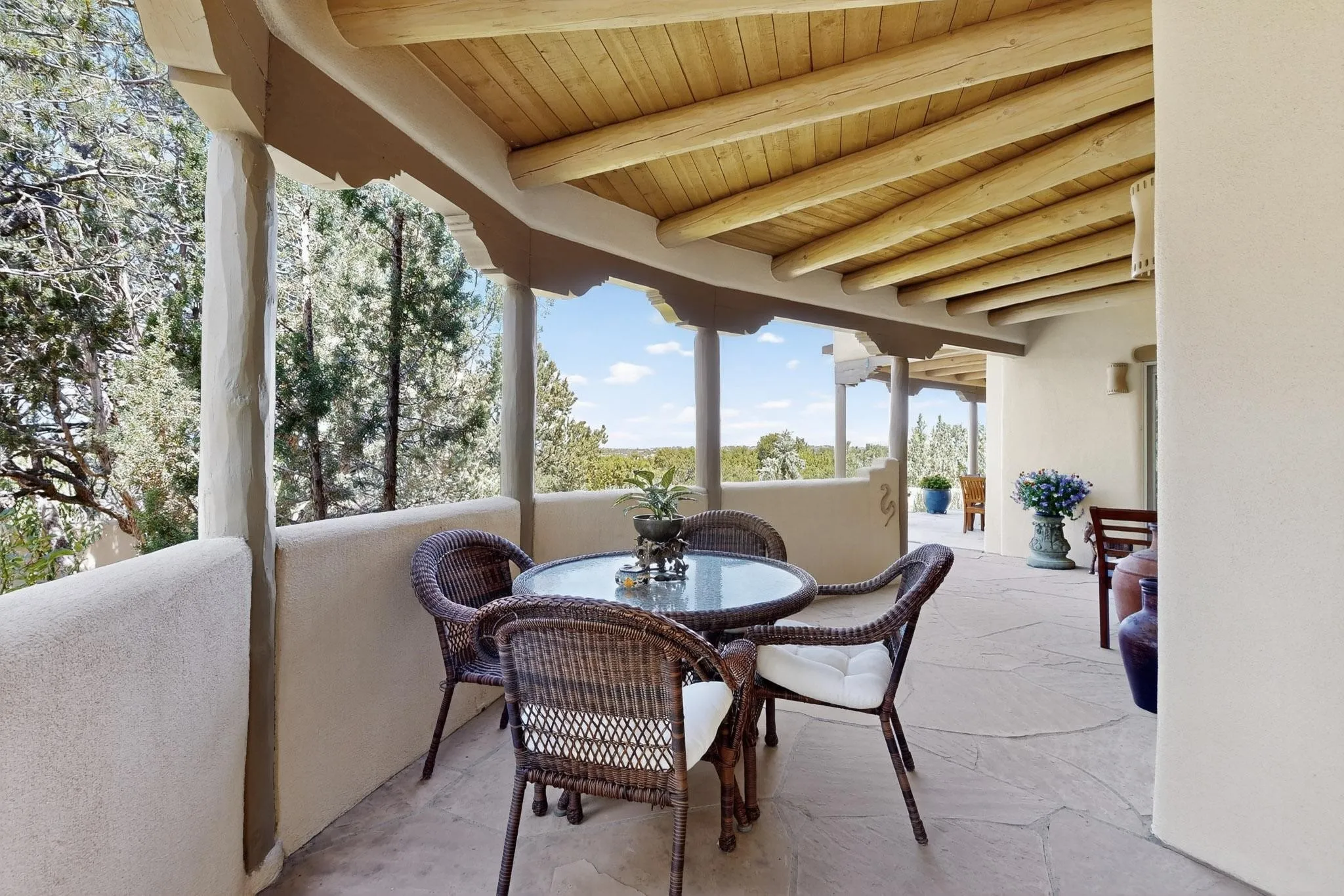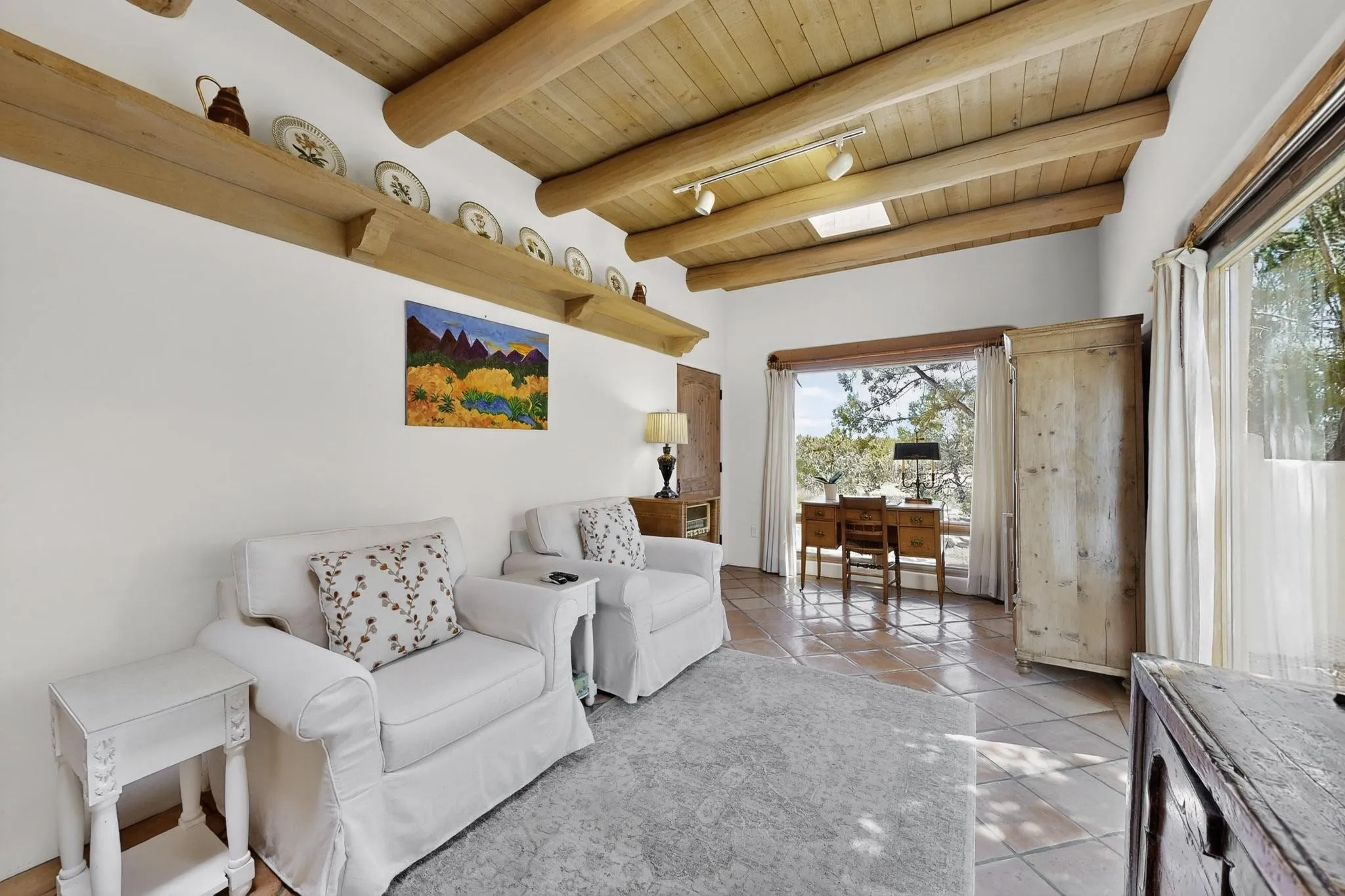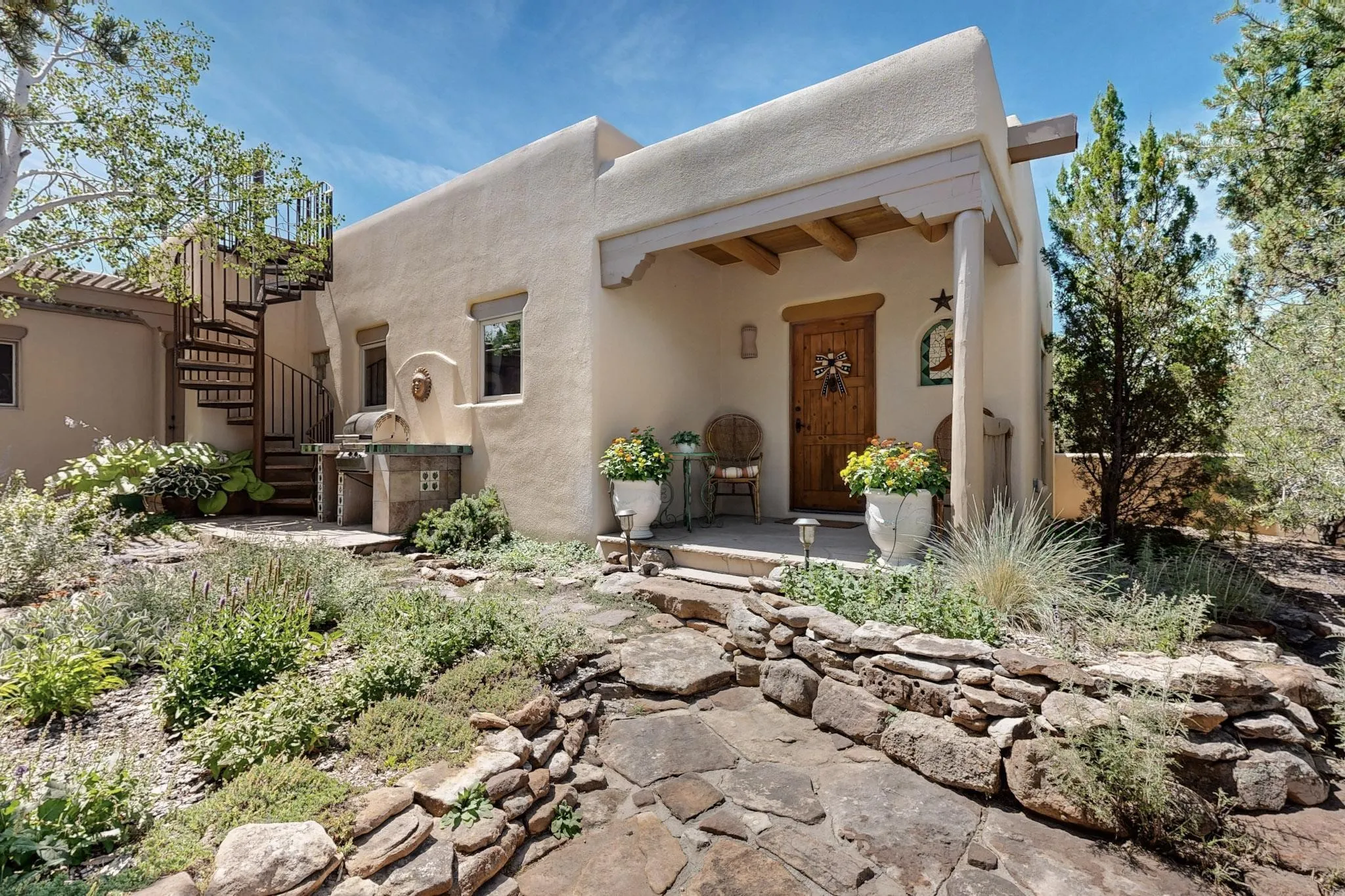 Vast sweeping panoramic western views define this exceptional property. The main house includes a primary bedroom suite with a fireplace, comfortable sitting area and a spa bath for relaxation. Large windows showcase the expansive western vistas, and doors lead to the portal. An additional room serves as either a TV room/office or bedroom and features its own fireplace and stunning views of the Sangres. The open floor plan seamlessly connects the living room, dining room, and kitchen, all centered around the fireplace. A unique and charming casita complements the main residence, equipped with a kitchenette, bath, and a cozy fireplace, making it ideal for guests or extended living. The wraparound portal, featuring a fireplace, showcases sweeping western views, offering the ideal setting to enjoy breathtaking sunsets. Relax to the soothing sounds of the stone fountain and enjoy watching the birds and butterflies in the fragrant colorful garden. A large patio area including a built-in grill, features additional space for relaxing and entertaining. The rooftop deck offers spectacular 360-degree views and the gated and walled property offers privacy.