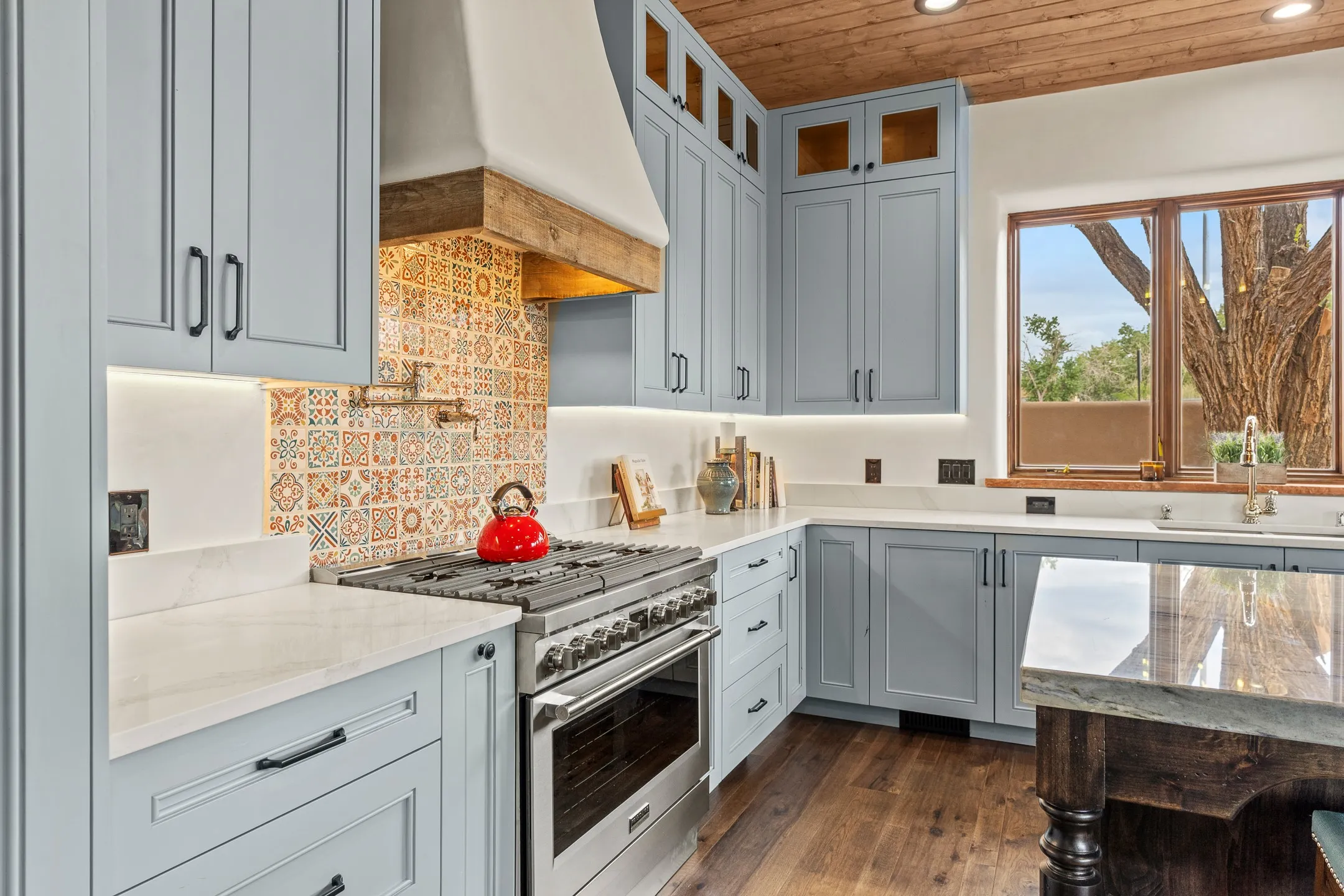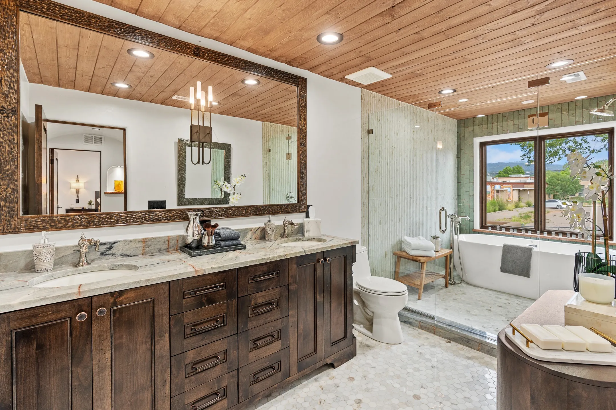 suitesāone on each levelāoffering flexibility and privacy. Entire second floor is dedicated to a primary suite with spa like bathroom with views of the Sangre De Cristo Mountains, an extra large closet and oversized suite with roof topĀ access and dry bar with wine fridge. The attached studio, on the main level has its own private entrance, which is perfect for guests, extended family, or a dedicated creative space. The open-concept kitchen is a true showpiece, featuring new stainless steel appliances, a custom hood, hand-painted tile backsplash, and a stunning mix of Cambria and Quartzite countertops. Custom cabinetry, artistic lighting of hand forged steel and alabaster fixtures add a refined touch throughout. Nearly every room includes an ensuite bath with marble or quartzite countertops, premium Kohler plumbing fixtures, and exceptional craftsmanship in the tile showers. Rich, hand-scraped hickory wood floors flow seamlessly throughout, completing this designer-inspired remodel where no detail was overlooked. A rare opportunity to own a timeless Santa Fe treasureājust moments from world-class restaurants, galleries, and boutique shopping Santa Fe has to offer. The house appears to be permit eligible for an STR permit subject to change should someone new apply.
