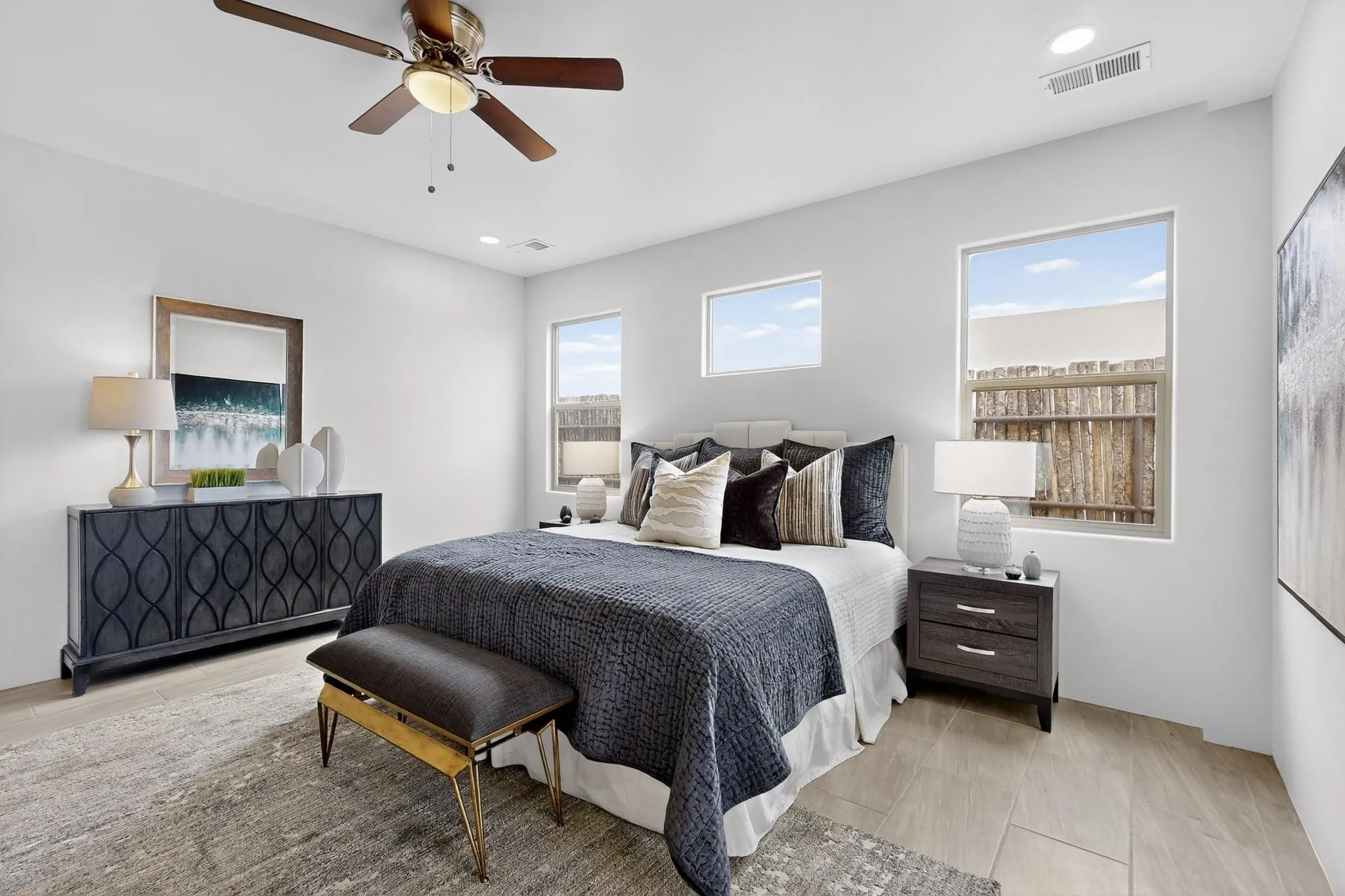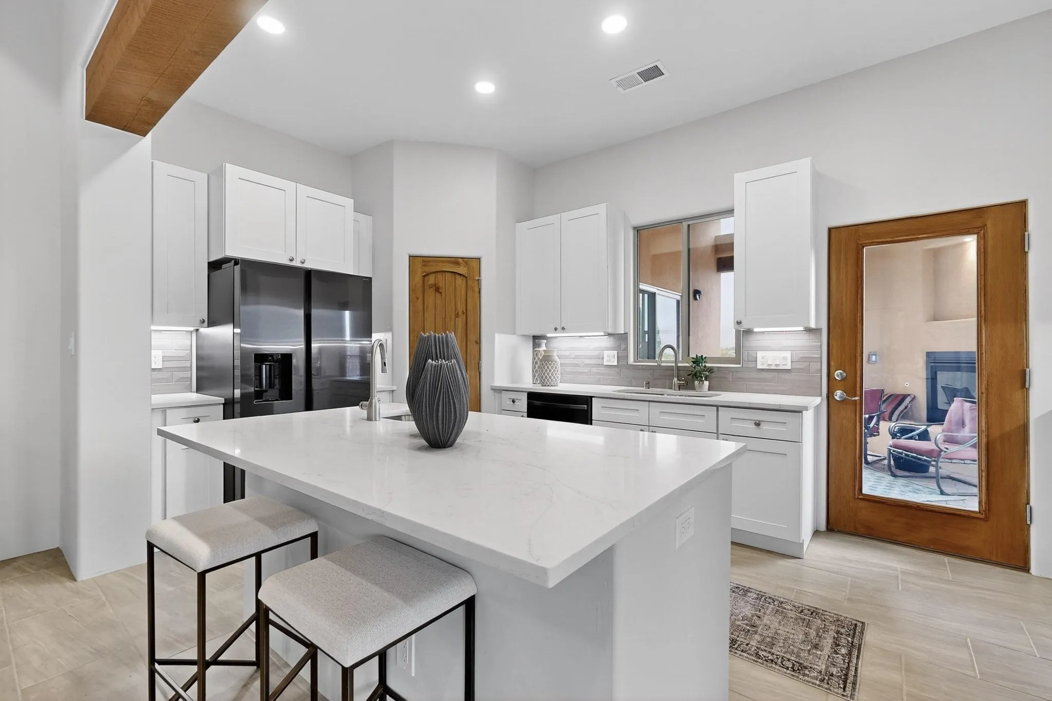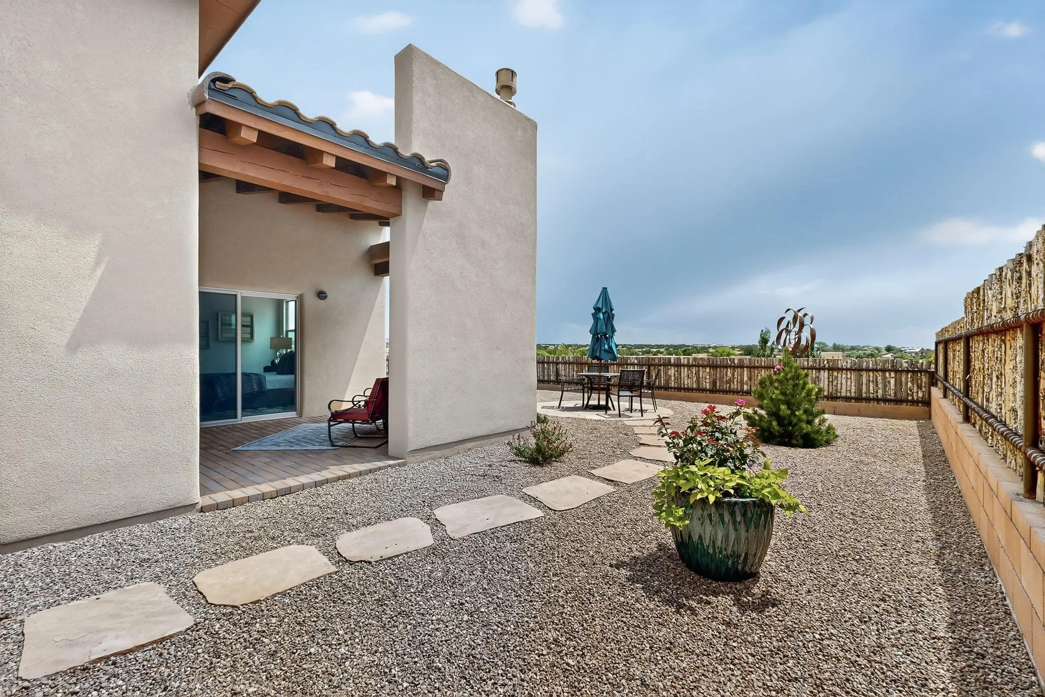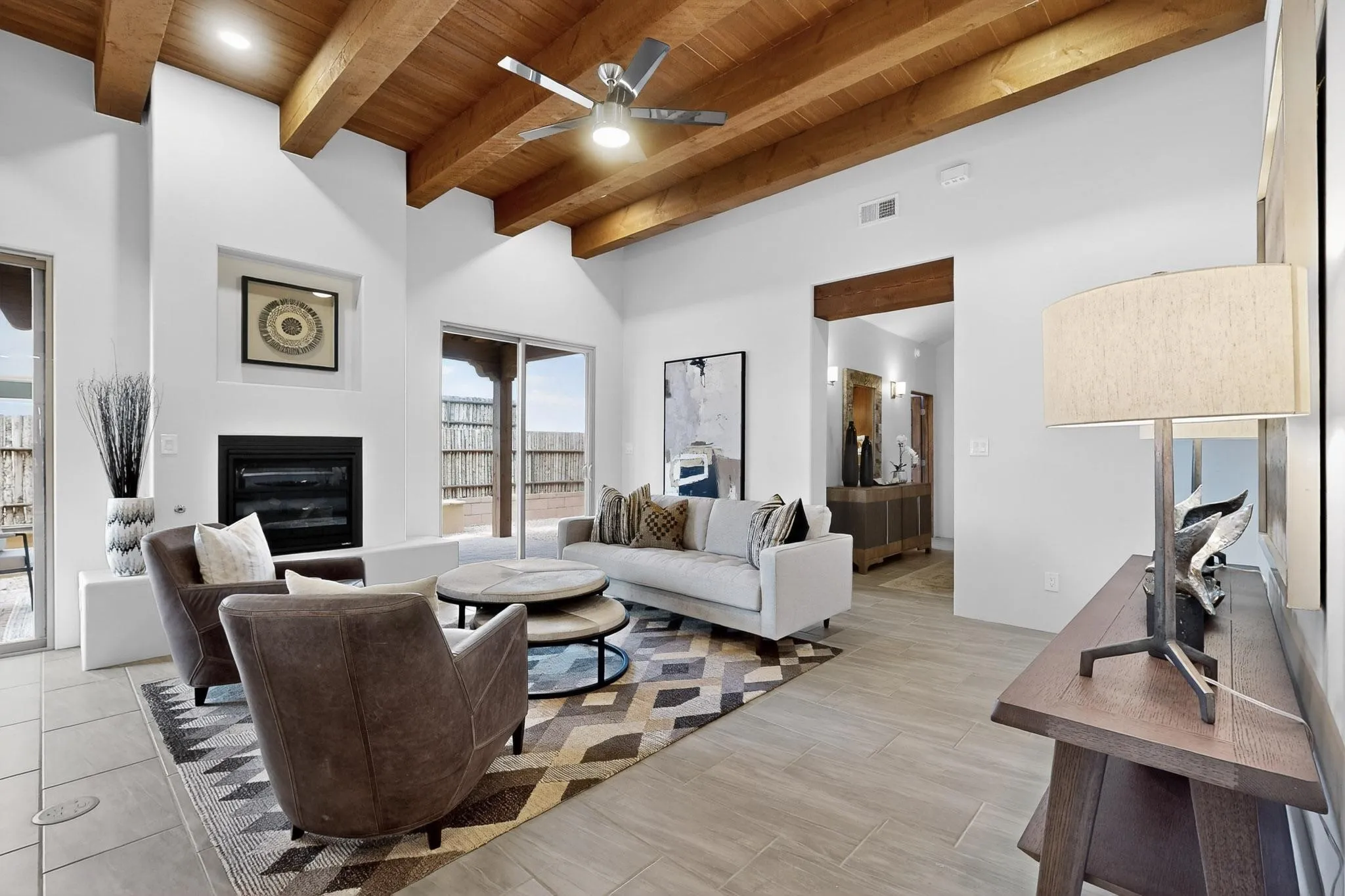 Enjoy breathtaking 180-degree scenic views from this distinctive Santiago Plan with 2239 sq. ft. Located in the La Pradera Subdivision. The property backs up to open space. This residence features three bedrooms and three and a half bathrooms. Each bedroom includes its own ensuite bath. There are three fireplaces throughout the home.Arrive through an impressive 8-foot-tall entry door, stepping into a foyer highlighted by a 13-foot boveda ceiling. To the left, a powder room and an adjacent closet provide convenience, while to the right, a versatile study or bedroom features a cozy gas-fired kiva fireplace. The spacious living room is distinguished by a 12-foot ceiling, rich brown-stained wood beams with tongue-and-groove trim. Porcelain floor tiles in a Bianco-White wood-like style add elegance throughout the home. The open kitchen is equipped with Shaker-White cabinets. The kitchen and the guest bedroom open out to a covered portal with a gas-fireplace and brick pavers, perfect for entertaining or relaxation. The ownerās suite features an expansive walk-in closet of approximately 100 square feet. The luxurious bathroom offers a skylight, a spacious walk-in shower with Euro-style fixtures, and an overhead rain shower head. Designed in a classic Spanish style, the home showcases a pitched roof with clay-concrete tiles, covered portals with substantial wood beams, and brick paver accents. The colored stamped concrete driveway enhances the propertyās curb appeal. The property also boasts a three-car insulated garage with two storage closets and an epoxy-coated floor.