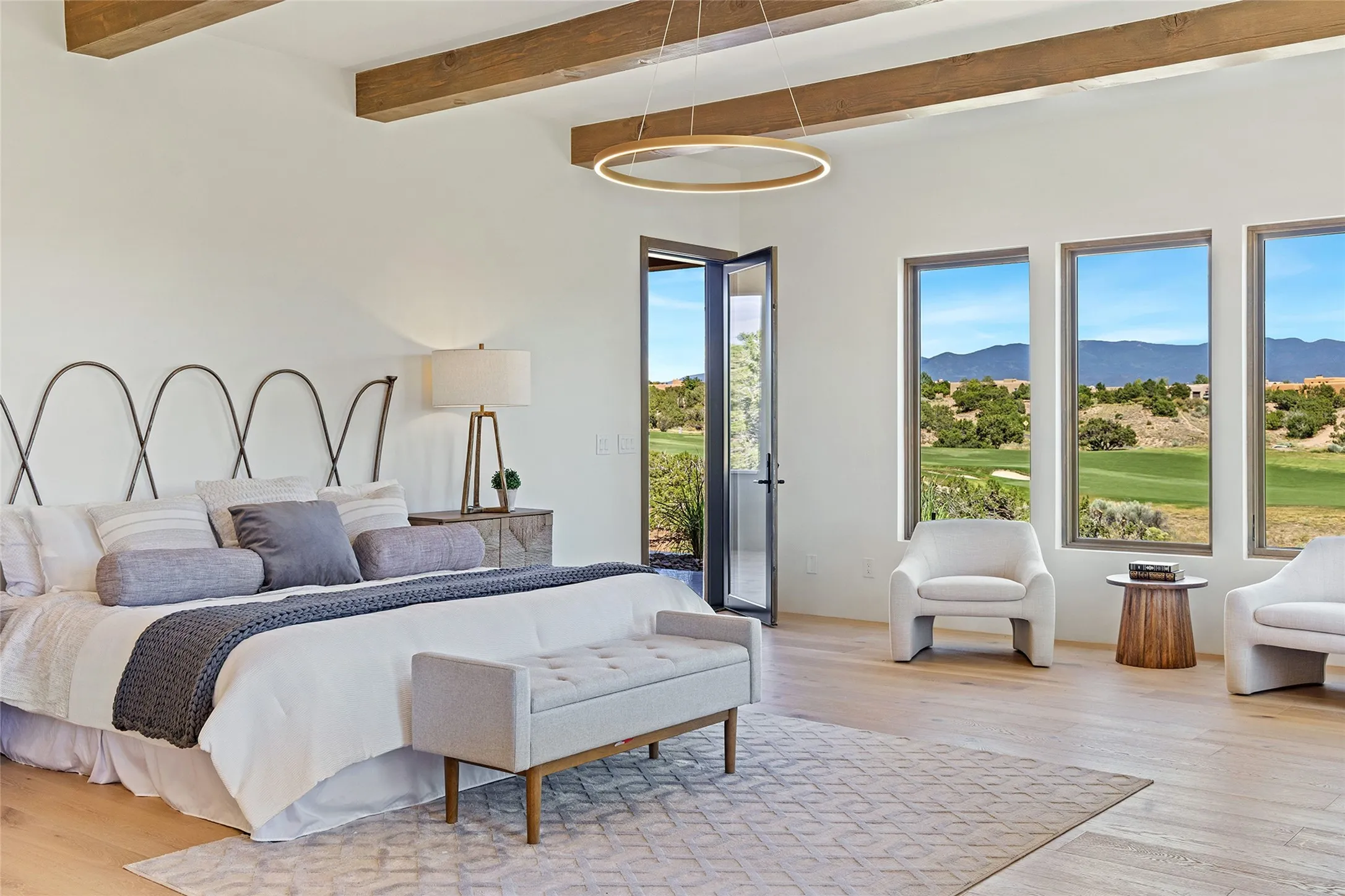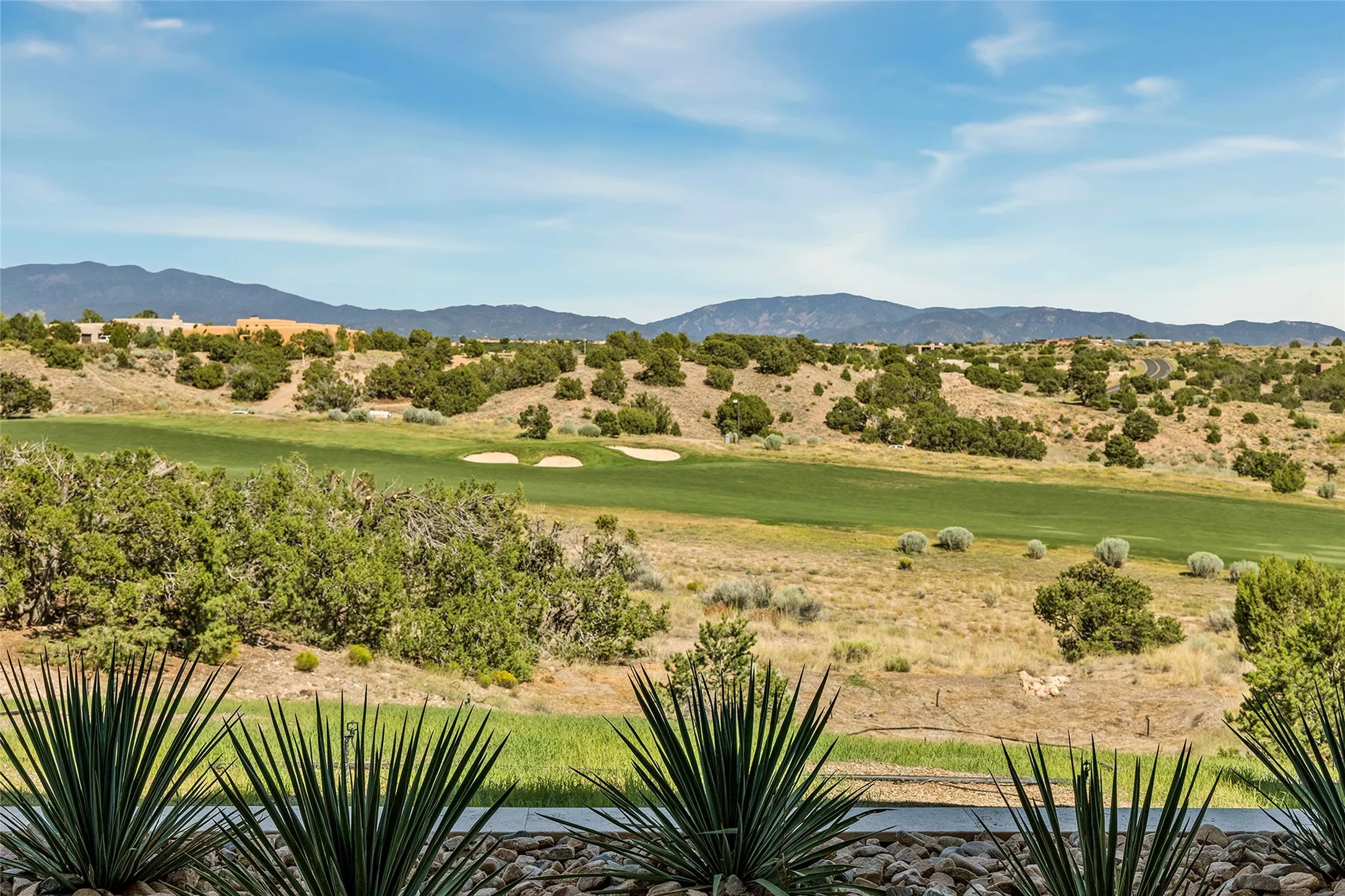 Welcome to 10 Calle Arbusto, an exceptional 2025-built custom contemporary masterpiece by the renowned builder, Clay Custom Homes. Recently completed and featured in the 2025 Haciendas Parade of Homes, this tranquil retreat is perched high above it all, offering breathtaking views of the 17th fairway at Sunset Golf Course and stunning Sangre de Cristo Mountain views. This rare offering showcases striking architecture paired with high-end designer finishes. Located within the famed community of Las Campanas, within close proximity to The Club at Las Campanas, (2) Jack Nicklaus golf courses, Spa, Swim, Tennis & Fitness Center, this home is designed to provide the ultimate indoor-outdoor living experience, ideal as a primary residence or a luxurious secondary retreat. The single-level, open-concept layout features a spacious living room with a wet bar and wine cooler, gas fireplace, sliding glass doors and a spacious dining area that seamlessly extends to outdoor living spaces, including a covered portal with an outdoor fireplace. The state-of-the-art island kitchen boasts expansive mountain and golf course views, rich cabinetry, tambour wood accents, a walk-in pantry, and top-of-the-line Dacor appliances and (2) dishwashers. The generously sized ownerās suite delights with views, portal access and a spa-inspired bathroom with a glass walk-in shower, soaking tub, and a large walk-in closet. The separate guest wing includes two ensuite bedrooms and a versatile living room, perfect for accommodating guests, or a media room. Additional features include a private dedicated office, built-in BBQ/grilling station and outdoor kitchen, wood flooring, exotic stone countertops, abundant natural light, rich beam accents in the living room, and an oversized 2 car garage. This home exemplifies the pride and craftsmanship that embody the true Santa Fe lifestyle. Membership to The Club at Las Campanas is optional and by invitation only, though required to access all Club amenities.
