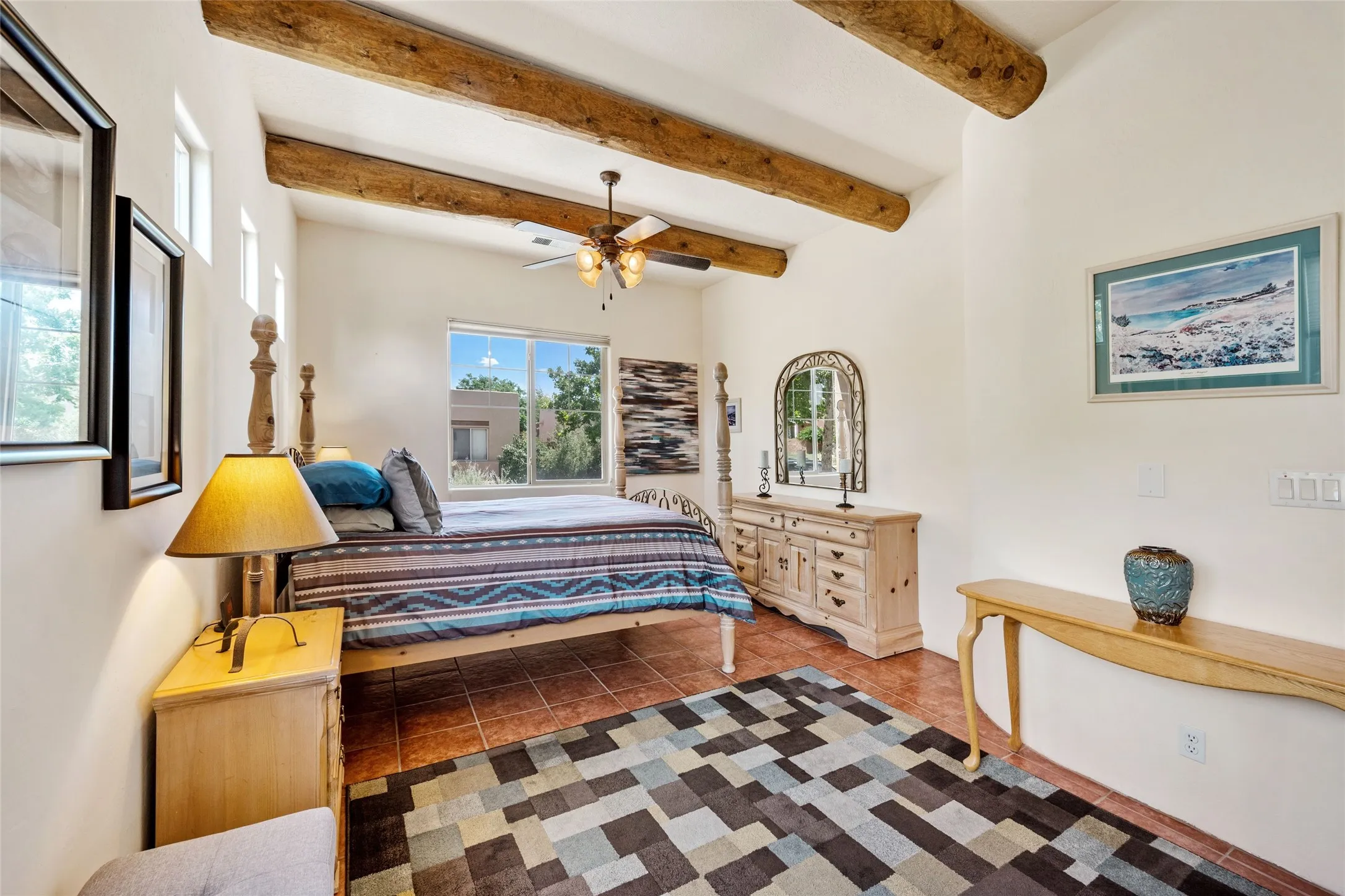 The private primary suite includes custom lighting, window treatments, and professional closet organizers. Architectural highlights include viga & beam ceilings, solid alder doors, a gas kiva fireplace, and insulated windows.