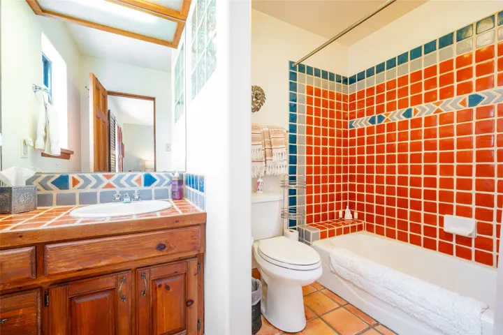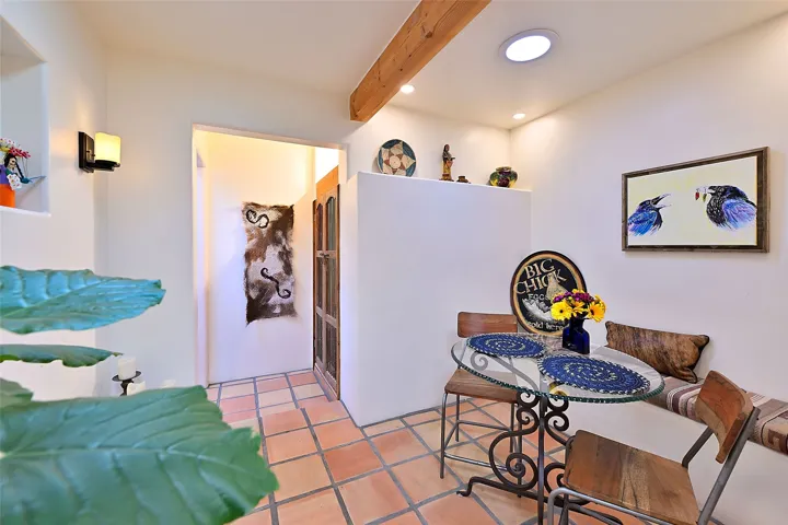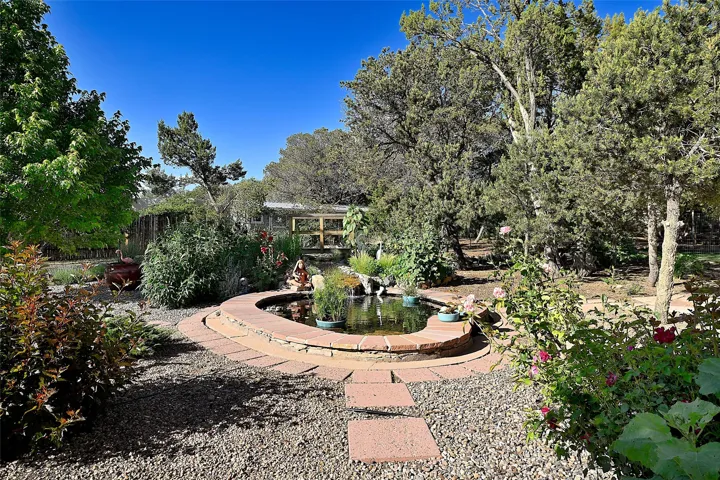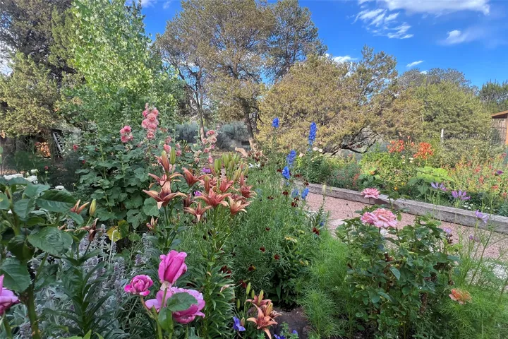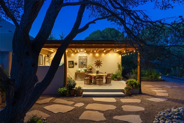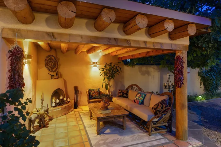 High ceilings with large vigas, artisanal finishes, and multiple kiva fireplaces, indoors and out, infuse the home with timeless Santa Fe warmth and charm. Outdoor living is equally inviting, with shaded portals, peaceful patios, and lush gardens featuring mature trees, a small orchard, and beautifully crafted gathering spaces.