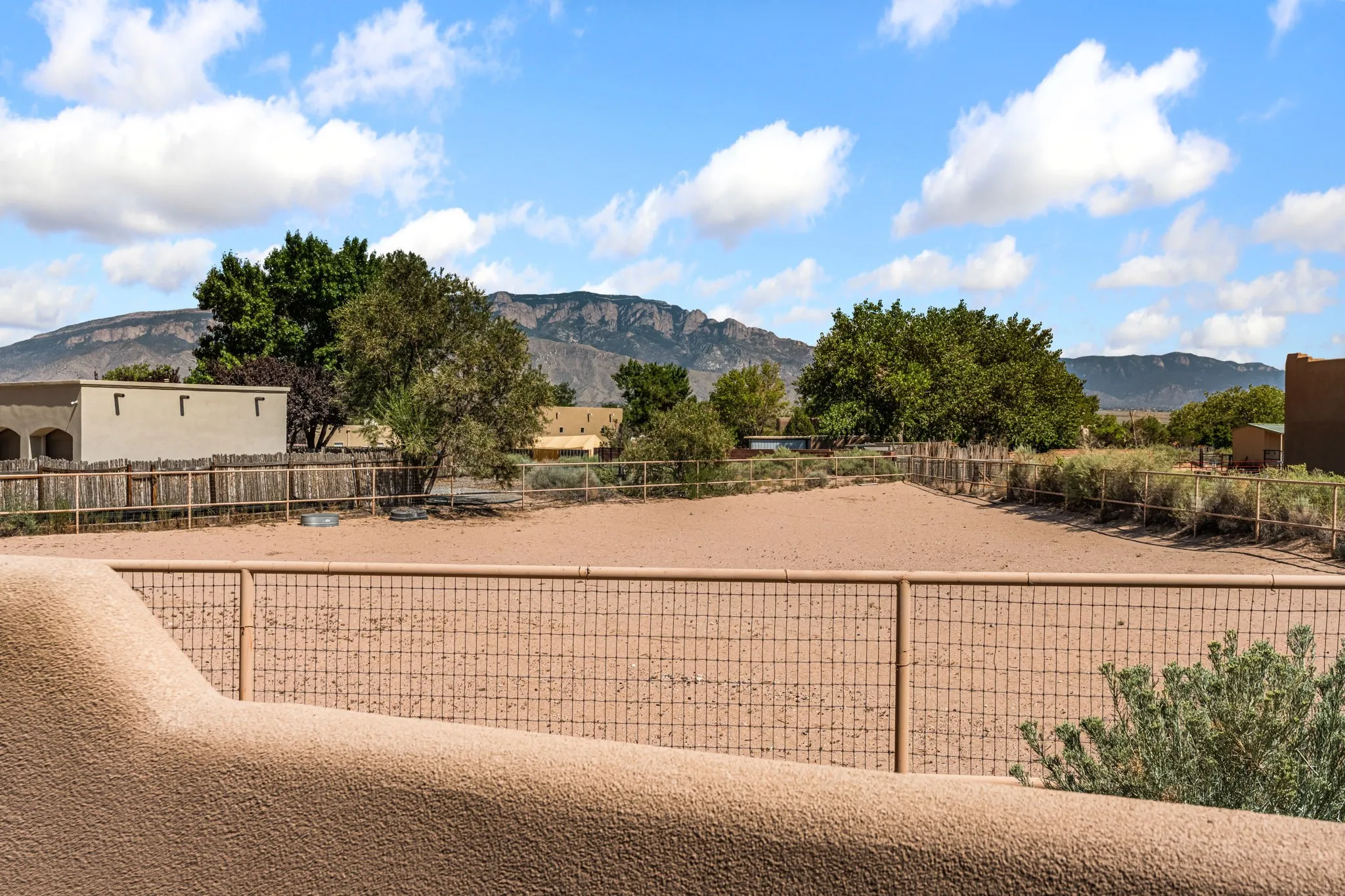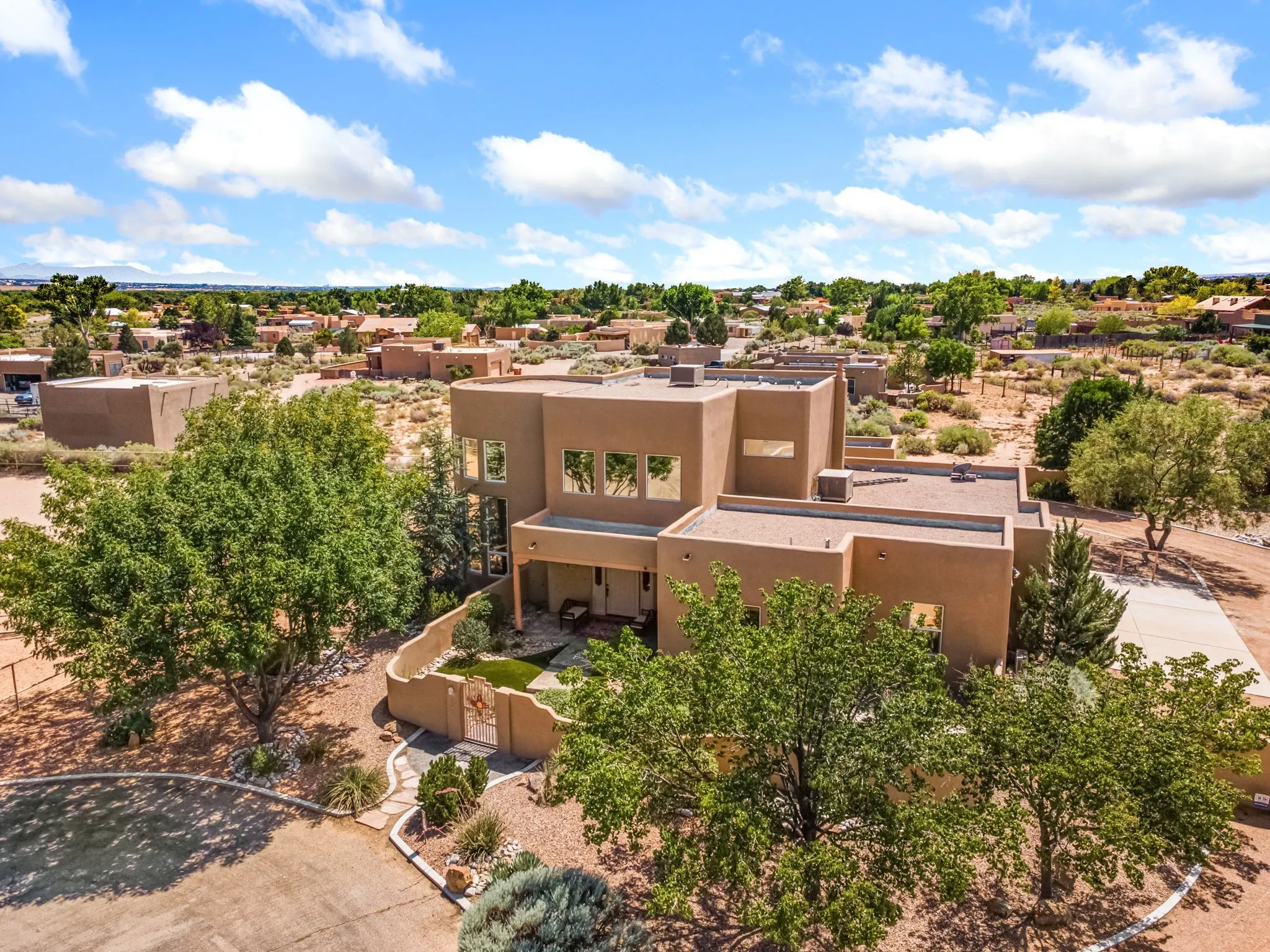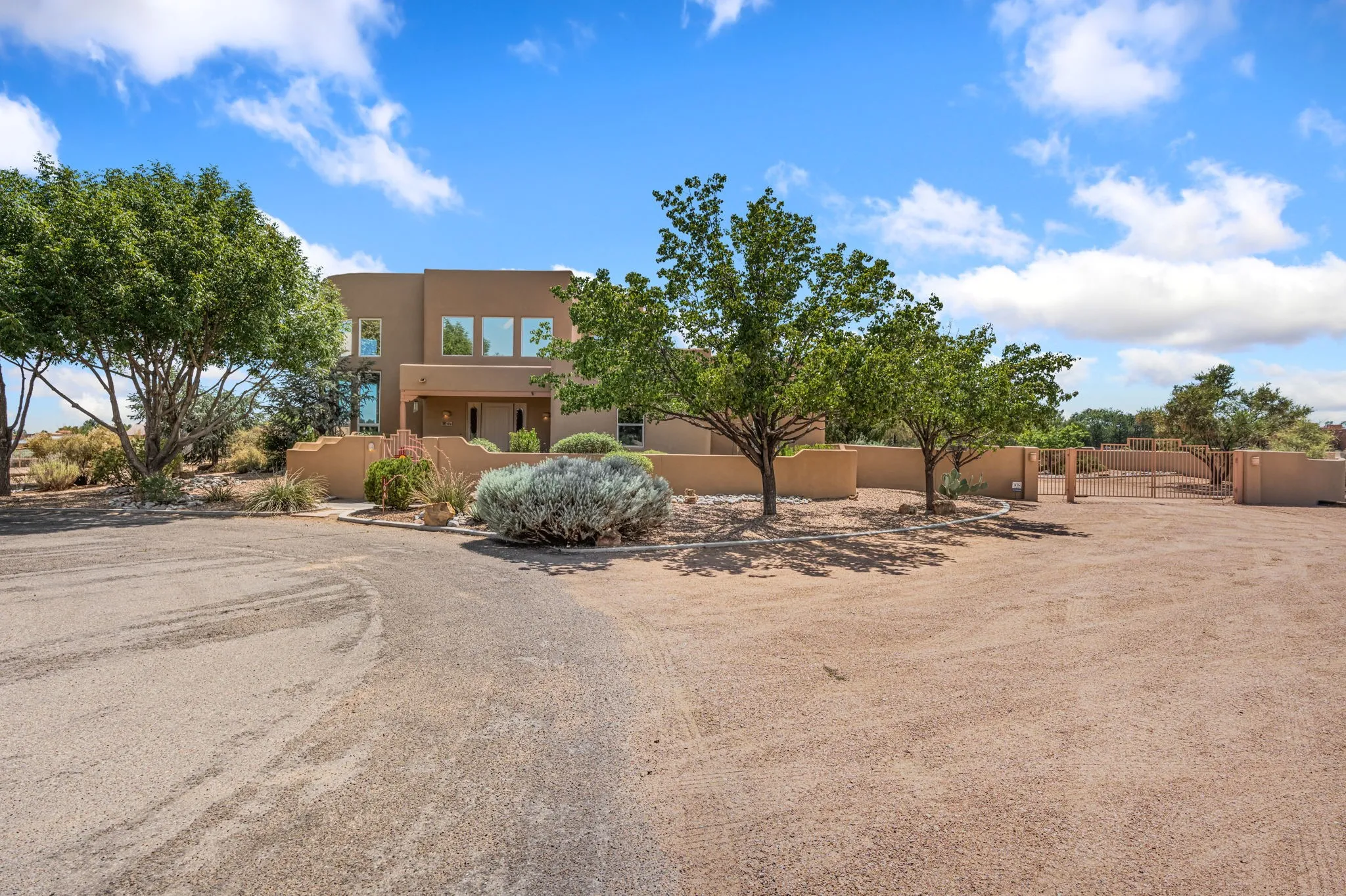 An absolutely stunning southwest sytle pueblo custom home. Hidden culdesac location, completely gated with a courtyard entry. This stunning home captivates you from the moment you walk in. High dramatic ceilings capture the views of the sandia mountains. The open concept floor plan flows seamlessly from the entrance through the greatroom w/fireplace. Gourmet kitchen w/an octagon island, custom cabinetry, SS appliances, & a walk-in pantry flows into the dining area w/access to the east patio. Retreat to the primary bedroom upstairs featuring a sitting area, dream closet, garden bath, & a private balcony to enjoy the unbelievable views. Two bedrooms downstairs w/ a full bath. Service room w/sink conveniently located near the three car garage w/ plenty of built in storage. Property is piped fenced, perfect for the equestrian, dog agility, or animal lover. Property is laid out well for a truck & trailer, & easy maintenance. A great place to call home.