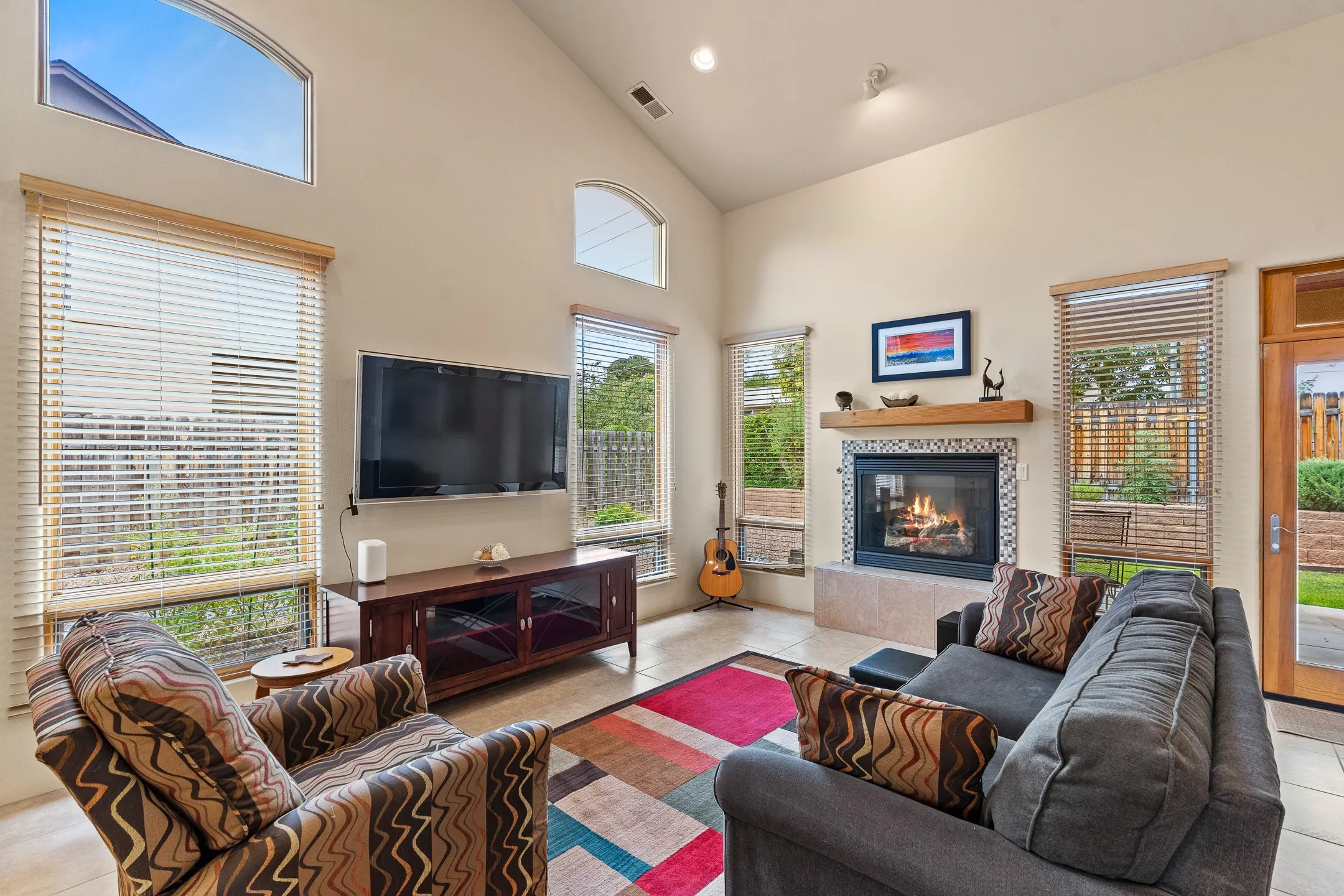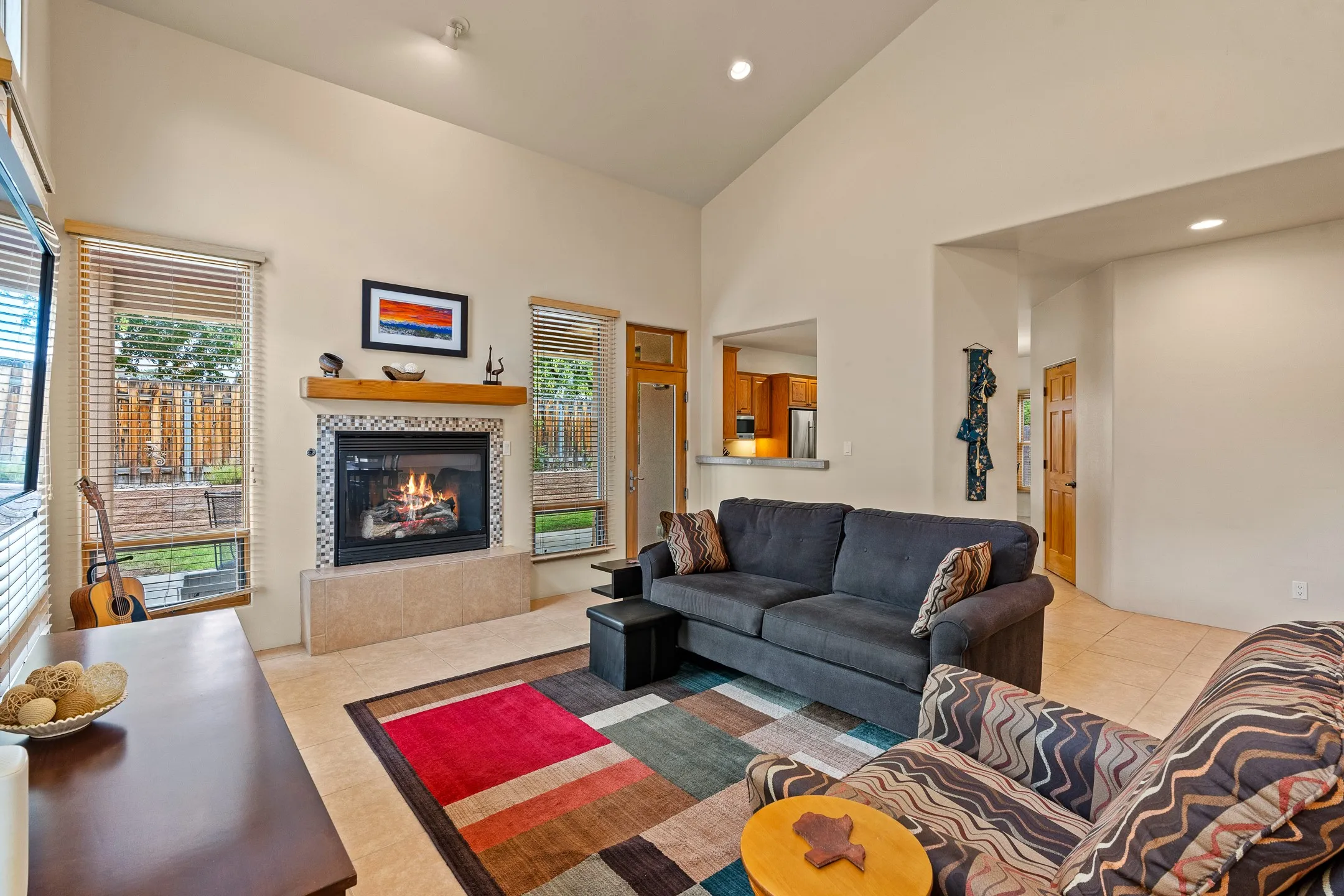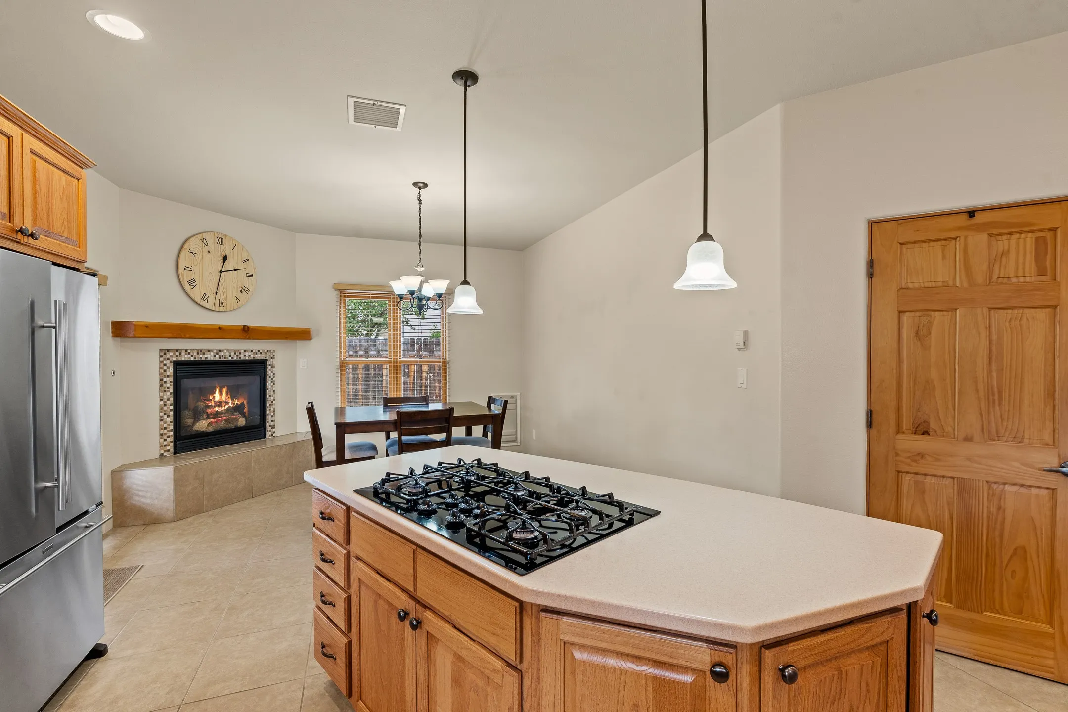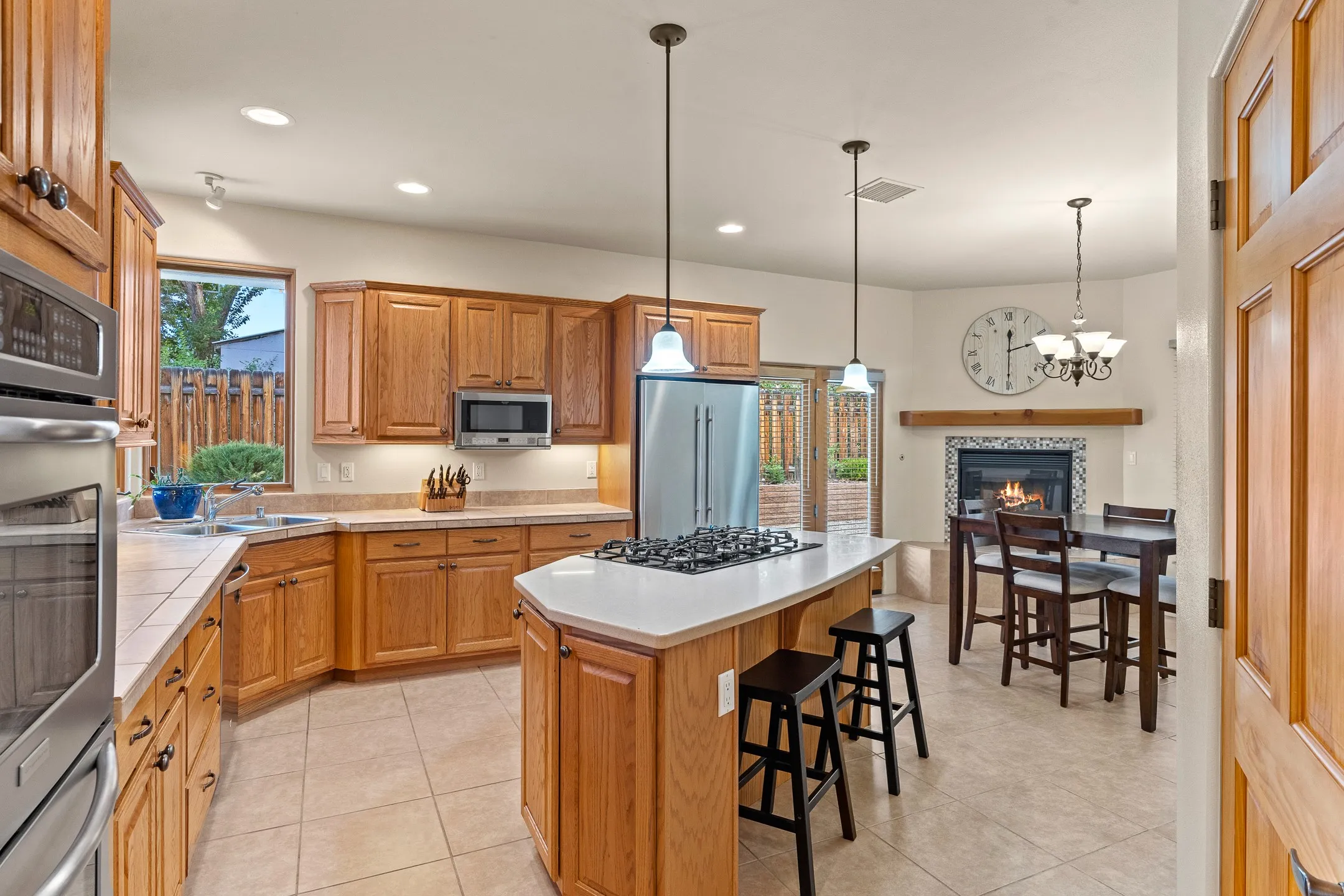 This inviting 4-bedroom, 3.5-bath home blends thoughtful design, quality finishes, and versatile living spaces to fit a variety of lifestyles. Step through the open foyer into a spacious living room where vaulted ceilings, a cozy fireplace with a wood mantle, and expansive windows create a warm, light-filled atmosphere. An open pass-through connects the living room to the gourmet kitchen, making conversation easy while entertaining. The kitchen and casual dining areaāwarmed by a second gas fireplaceāboast a large island with a 5-burner gas stove, dual ovens, under-cabinet lighting, a pantry, and newer stainless-steel appliances. For more formal occasions, a separate dining room offers the ideal setting for holiday meals and special gatherings.