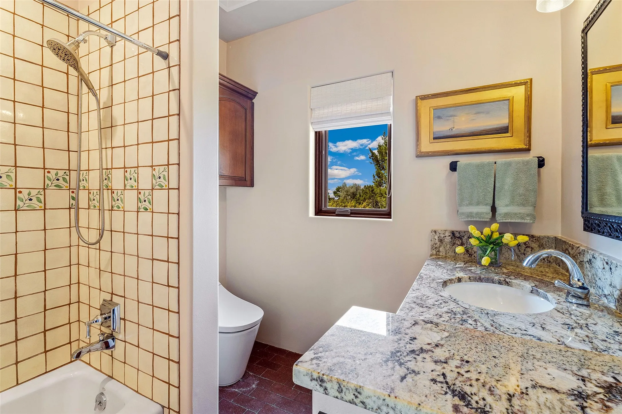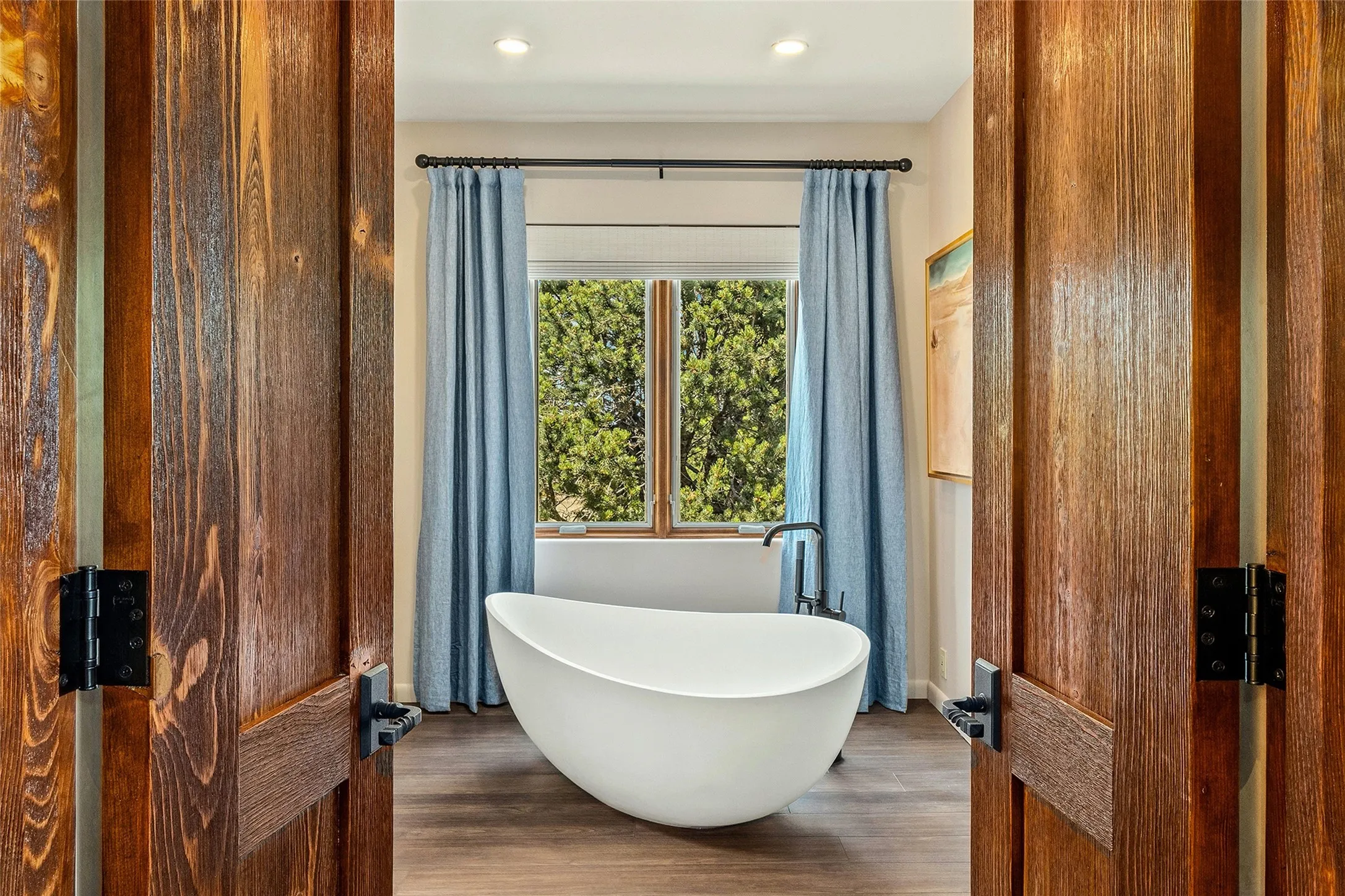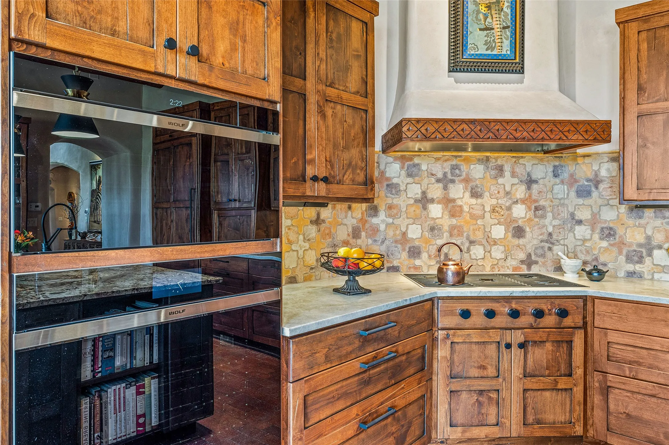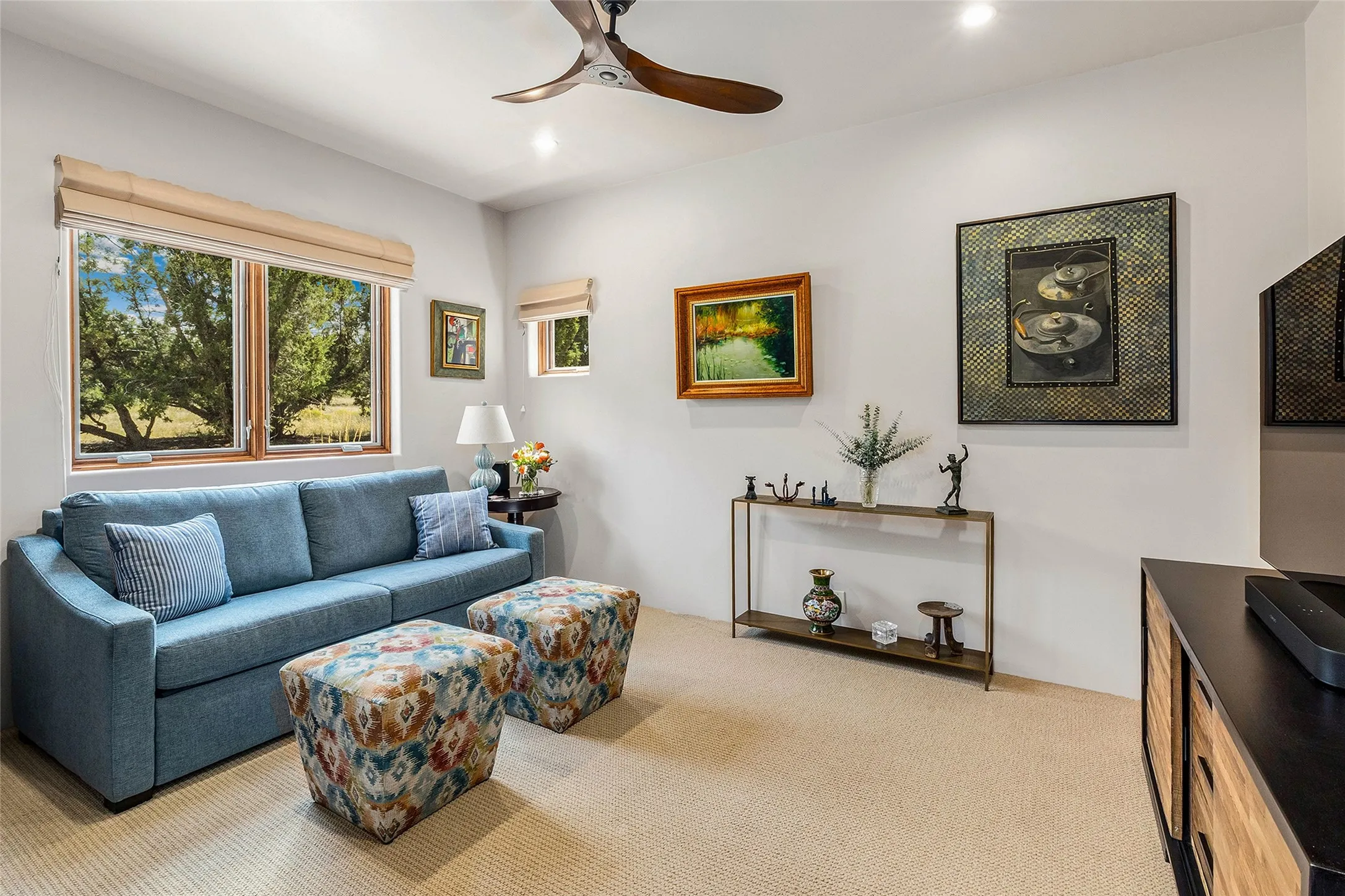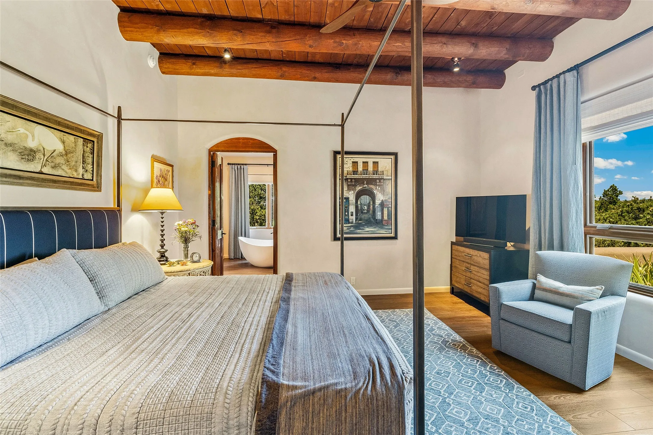 Experience the ultimate Santa Fe lifestyle in this stunning Las Campanas residence showcasing sweeping views of the Sangre de Cristo Mountains and newly updated luxury finishes throughout. Built by award-winning builder Tierra Concepts, this exceptionally designed single-level home features four bedrooms and embraces the essence of quintessential Santa Fe architecture, paired with a seamless indoor-outdoor lifestyle. Just minutes from both the historic Plaza and The Club at Las Campanas, this home welcomes you with a beautifully landscaped front courtyard adorned with vibrant landscape. The fully enclosed back portal, complete with a cozy fireplace and built-in BBQ, offers the perfect setting for year-round entertaining and a secure retreat for pets. The newly designed chef’s kitchen, by the acclaimed designer David Naylor impresses with a natural stone island and breakfast bar, newly installed custom cabinetry, abundant storage and premium state-of-the-art appliances, all of which opens to a casual dining or living area, with its own fireplace and direct portal access. From there, the space flows effortlessly into the expansive great room, with a spacious formal dining area, fireplace and dramatic picture windows which frame the breathtaking Sangre de Cristo mountain views. The luxurious, private ownerās suite is a serene escape, boasting a kiva-style fireplace, mountain views and a tranquil spa-like modern bath complete with a stand-alone soaking tub, walk-in shower, dual vanities with natural stone counters and dual walk-in closets. Guests enjoy complete independence with a spacious ensuite which offers a full bath and large walk-in closet, plus two additional guest bedrooms which share a well-appointed full bath, offering privacy and flexibility. Additional updates include a newly updated roof and ductless cooling and heating system, plus an updated boiler for radiant heating. A full updated features list is available upon request. This home is not to be missed!