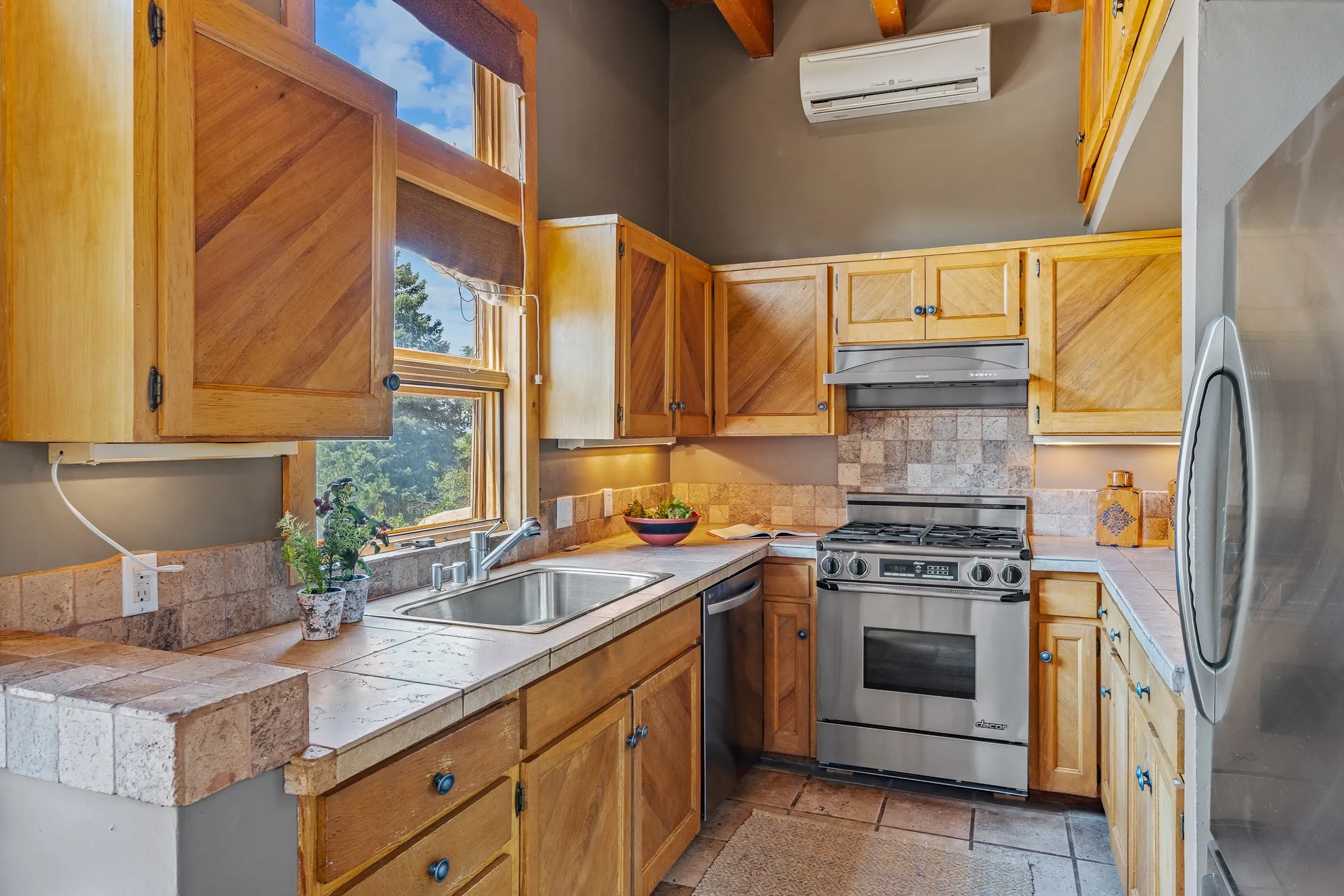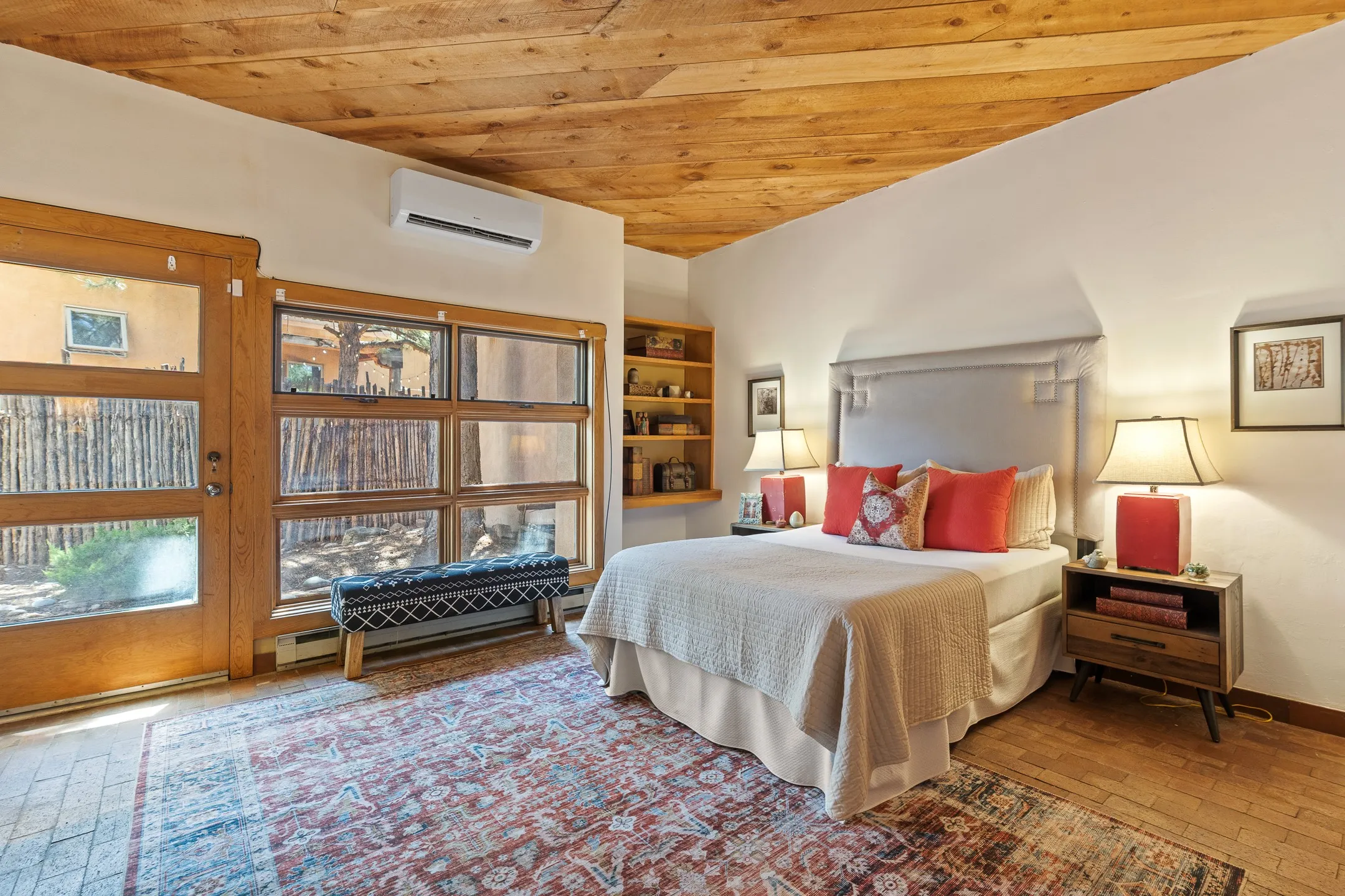 Located down a little lane in Santa Feās Historic Eastside! With walking easement to Canyon Road, is this beautiful 2145 sq. ft. 3-bedroom, 2 1/2-bath light filled home. Architectural features are floor to ceiling windows of both East and West views featuring Picacho peak, trees and garden views, wood floors, beams, authentic talavera tile, and brick floors. Upstairs, a sunlit living area flows seamlessly into a dining room and kitchen, complete with custom cabinets, stone tile, stainless appliances, stunning wood floors and a half bath. Two decks provide serene views, while a central wood-burning fireplace and cushioned bancos create a lovely environment to entertain.