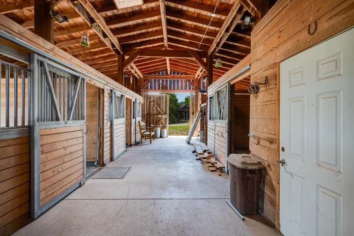 Horse enthusiasts will appreciate the six-stall, barn, tack room, workshop, covered hay storage, electric, and hot water, and protected outdoor runs. An insulated chicken coop provides the perfect setup for fresh eggs, while a private well with a large storage tank ensures a reliable water source.