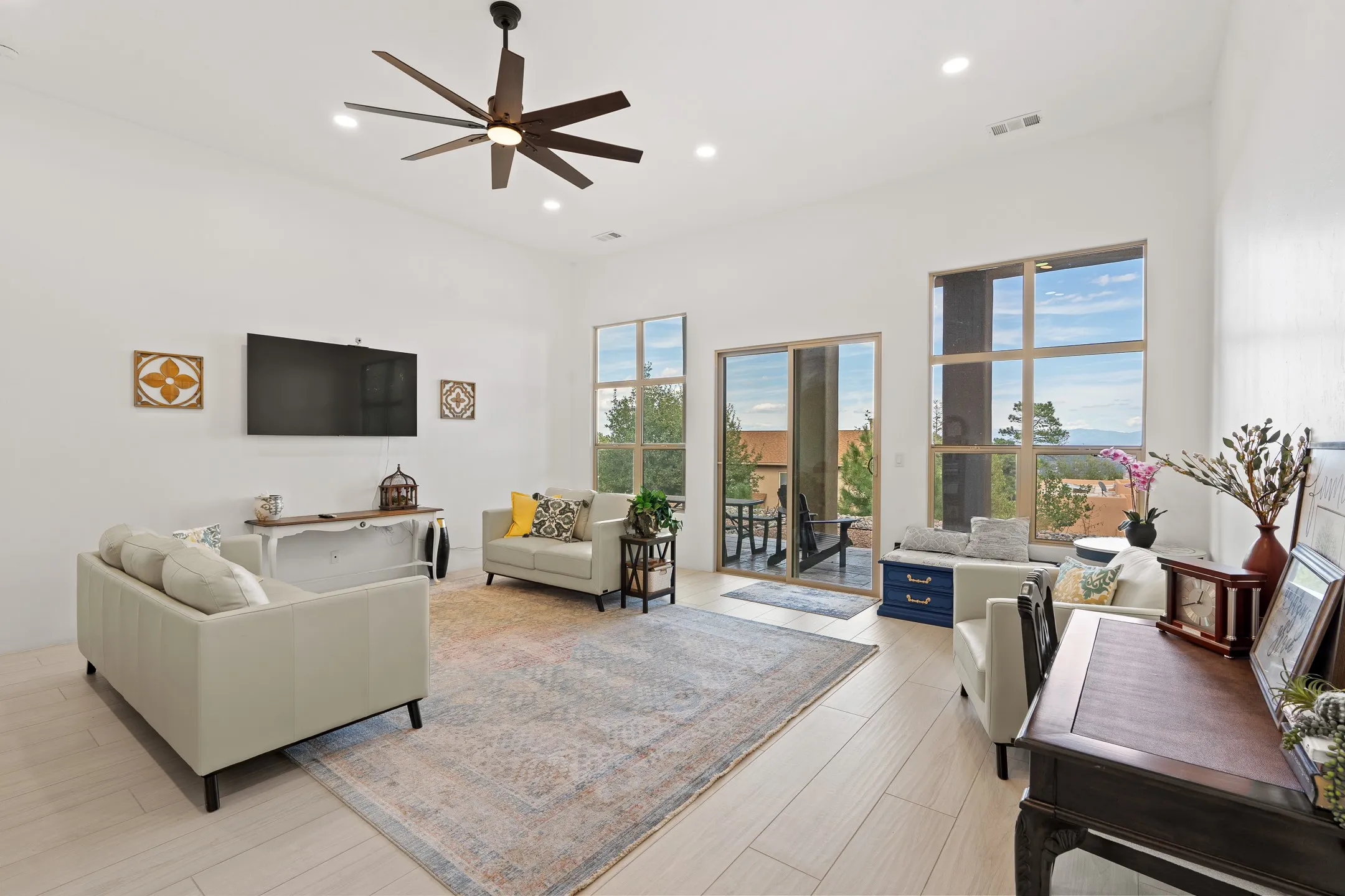 As you enter the front door, the tall ceilings and views through the living room windows will captivate you and draw you inside, where you are free to explore the open floor plan of the main living space. Grab your favorite beverage from the chefās kitchen, and make your way onto the balcony to enjoy spectacular views of the Sangre de Cristo range to the east while looking straight down Los Alamos Canyon.