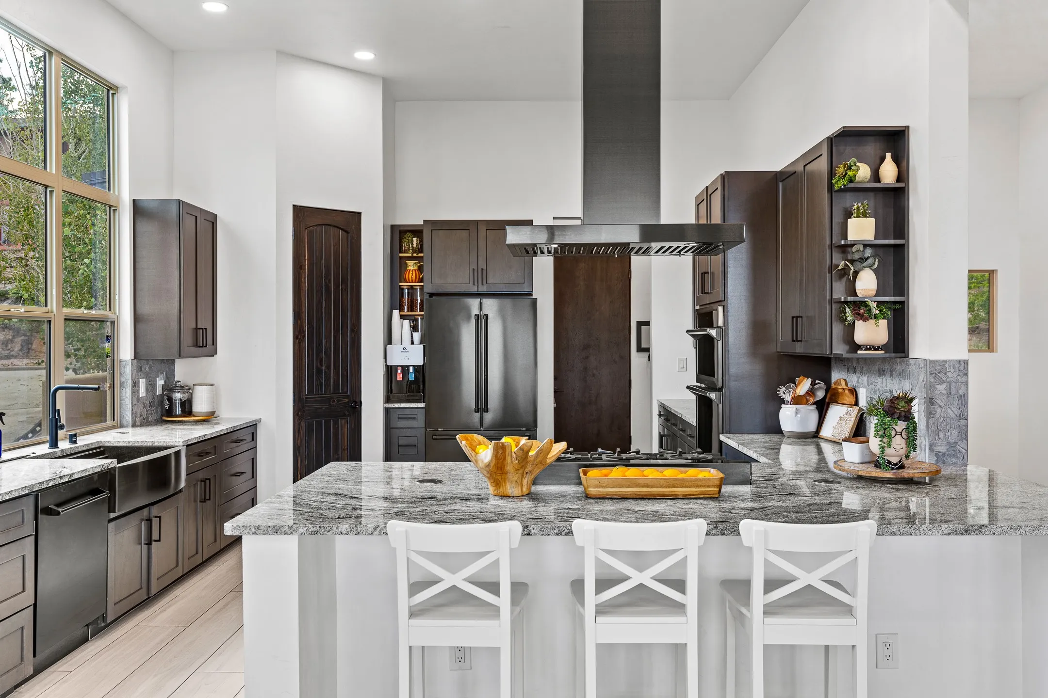 The living room features a custom gas fireplace to keep you warm on those cool fall evenings and sliding glass doors to the covered balcony. The chefās kitchen includes ZLine appliances, granite counter tops, barstool seating, a farmhouse sink, and a wall of windows allowing the chef to enjoy natural light while preparing meals.
