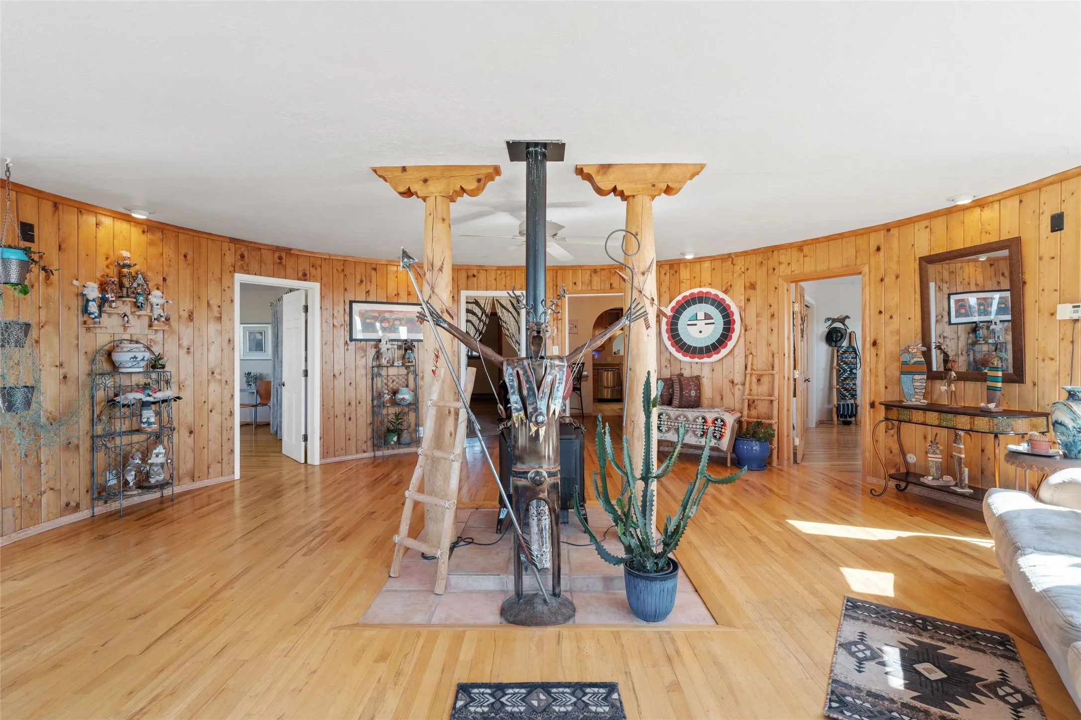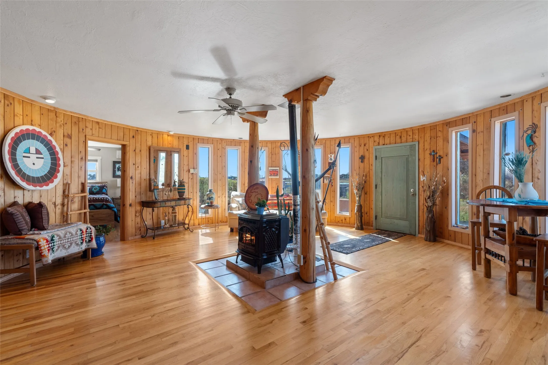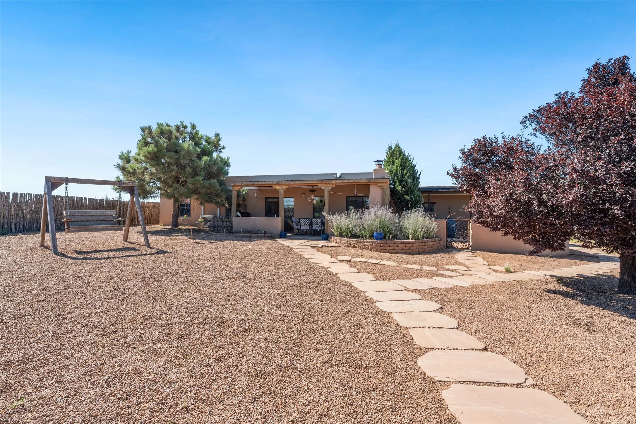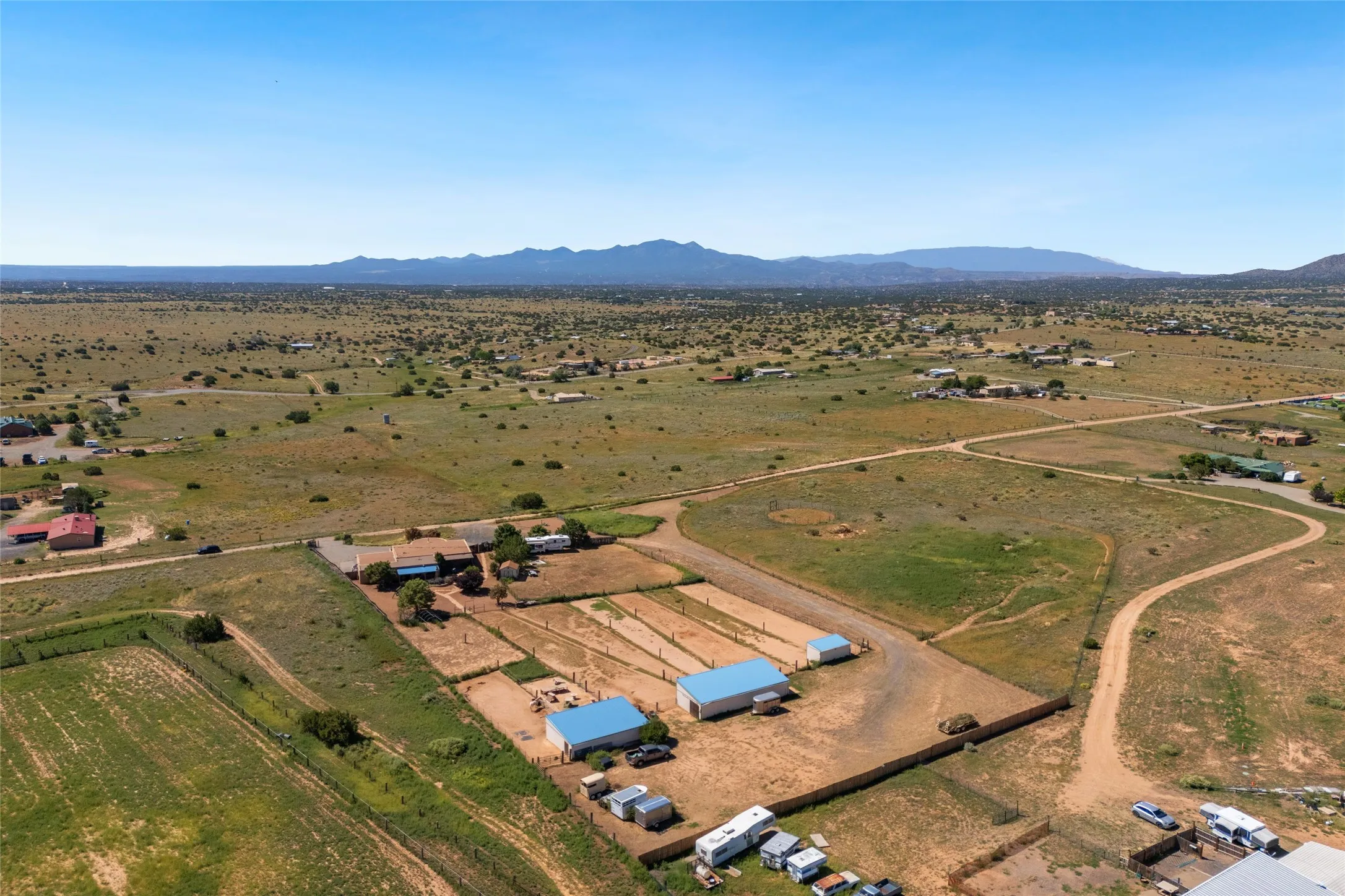 Located on the beautiful Turquoise Trail is this equestrian property with mountain views for delightful country living just a 15 minute drive from Santa Fe. The 3 bedroom, 2 bathroom, 2,645 square foot single level home (no interior steps!) with a bonus room on 5.19 gated and fenced acres offers two living spaces, tile and wood floors (no carpet!), two portals (one with a fireplace), and horse facilities that include 2 barns, stalls with turnouts for 12 horses, tack room, 60 ft round pen, room for arena and additional runs, and solar powered electrified fencing. Step through the front door into a wonderful round living room with woodstove that has floor to ceiling windows that capture southwestern views of the majestic Ortiz and Sandia Mountains. The three bedrooms and kitchen/dining area are off the front living room, and through the kitchen you access a spacious second living area and bonus room that is perfect for an office, studio, or whatever your lifestyle calls for! Additional features include air conditioning via 5 mini splits, attached and insulated 2 car garage, shed, RV electric and water hookups available, and no HOA. Just minutes away are shopping, dining, medical facilities, the Santa Fe airport, and Hwy I-25 access, yet you will enjoy privacy, seclusion, incredible sunsets and sunrises, and jaw-dropping star-filled night skies in this special home. Schedule your private showing today!
