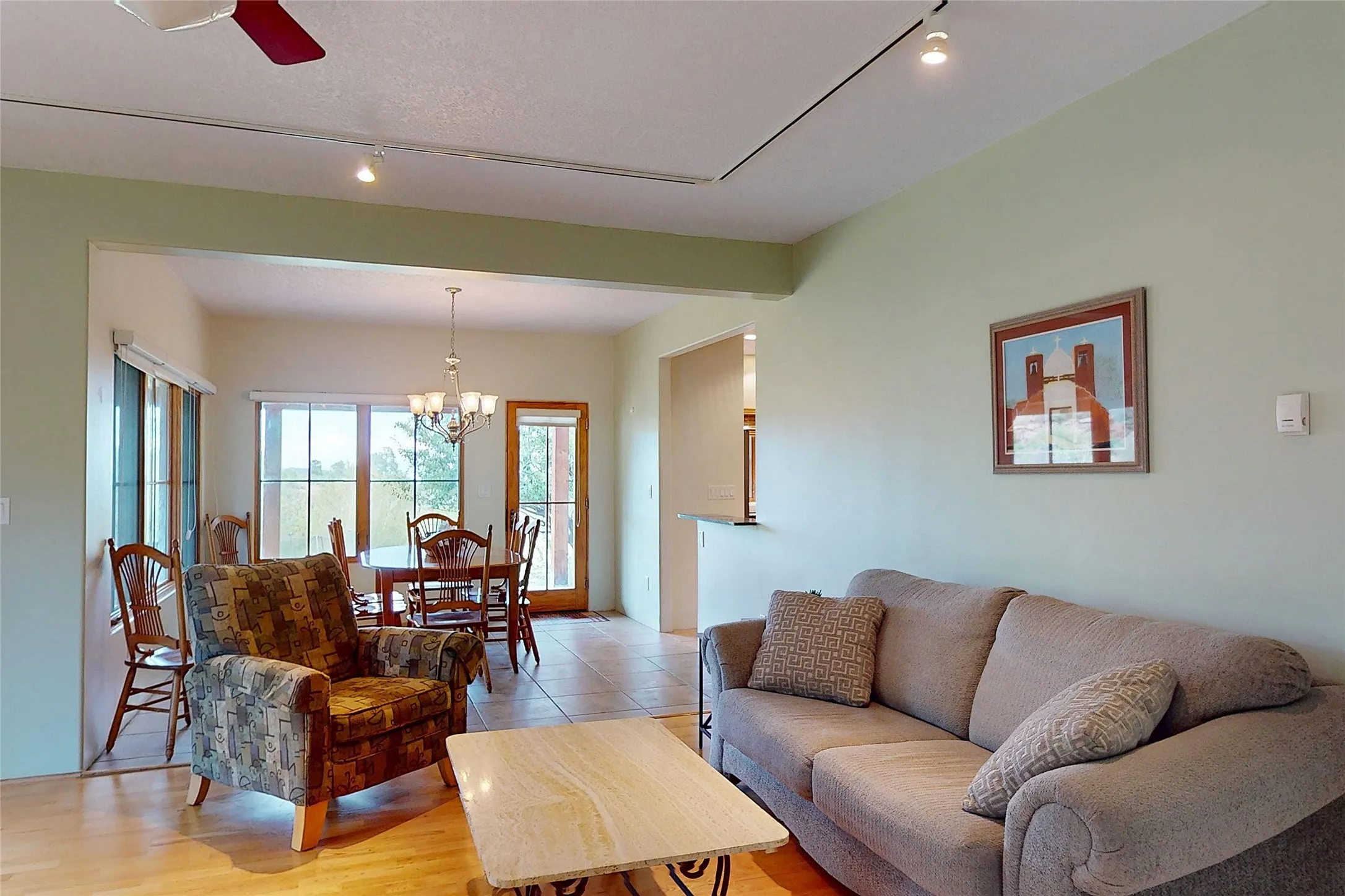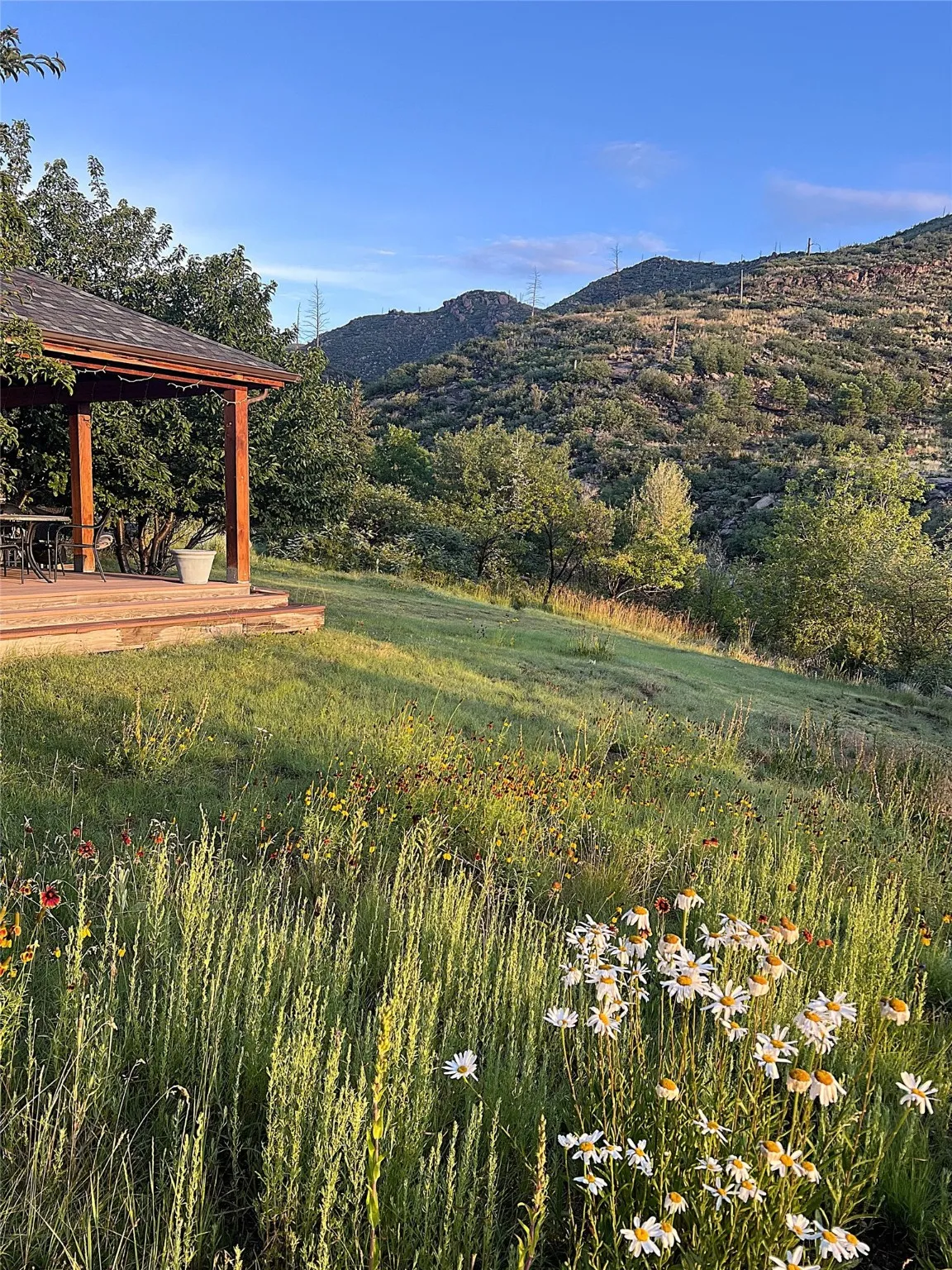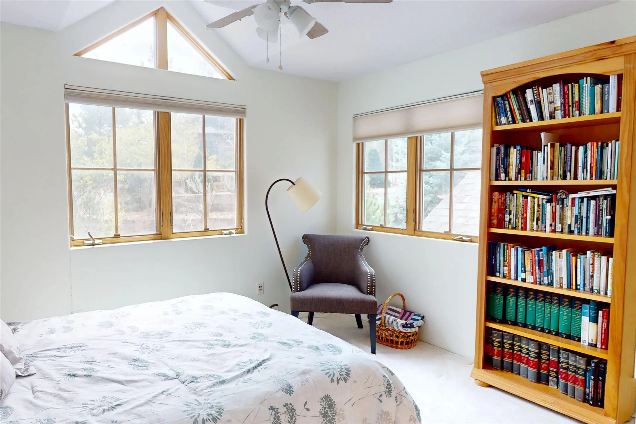 This stunning 4-bedroom, 2.5-bath Quemazon home backs to open space, offering privacy and direct access to the Perimeter Trail. The open floor plan flows seamlessly between the kitchen, dining, and living areas, with easy access to the covered Trex deckāperfect for enjoying mountain and forest views as well as the private backyard. The spacious primary suite includes a private study framed by French doors, dual walk-in closets, and a luxurious en-suite bath with dual sinks and a freestanding tub. Three additional bedrooms and a well-appointed hall bath complete the layout. A walk-out basement with additional living space and a crawl space for storage adds flexibility. Thoughtful details include architectural touches throughout the home, in-floor radiant heat with four zones, WindsorLite windows, six-panel wood doors, ceiling fans in every bedroom and the living room, track lighting, and Kohler fixtures. The kitchen is equipped with a Bosch dishwasher, gas stove/oven, and a newer refrigerator (2022). Major updates include roof replacement in 2009 with a lower-roof update in 2025, and a full stucco renovation in 2019. Outdoors, mature fruit treesācherry, apple, pear, plum, apricot, nectarine, and peachāalong with raspberries, drought-tolerant blue grama grass, and a private front yard with precision-cut stone walls, create a serene retreat. French drains along the west side provide peace of mind. This Quemazon gem blends comfort, thoughtful upgrades, and a premier setting with trails at your doorstep.