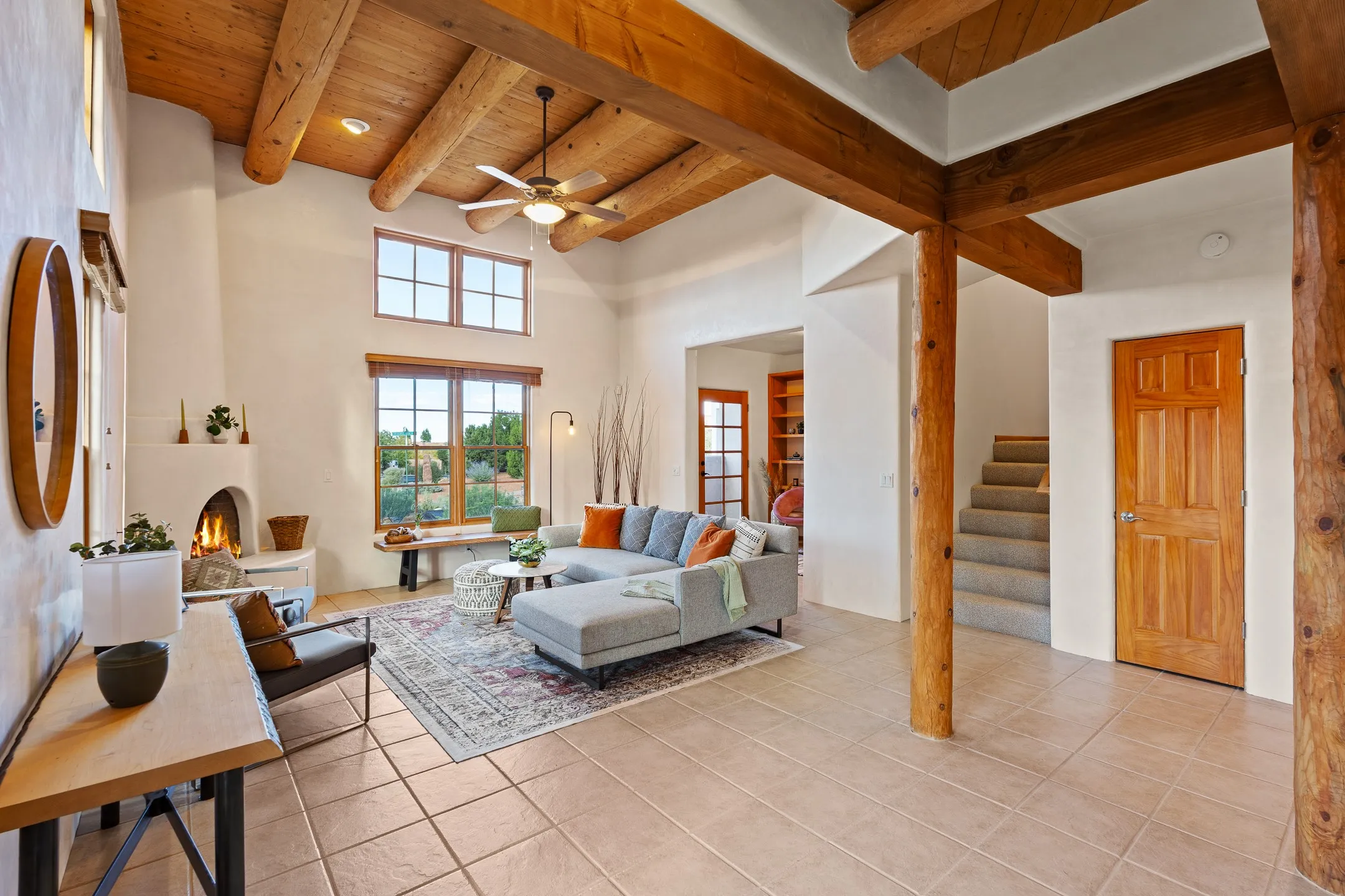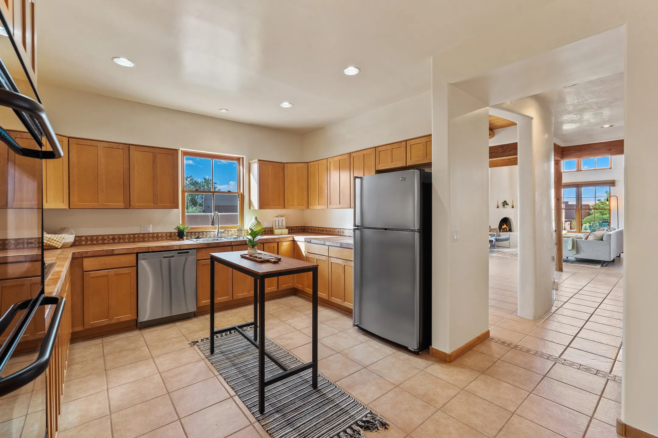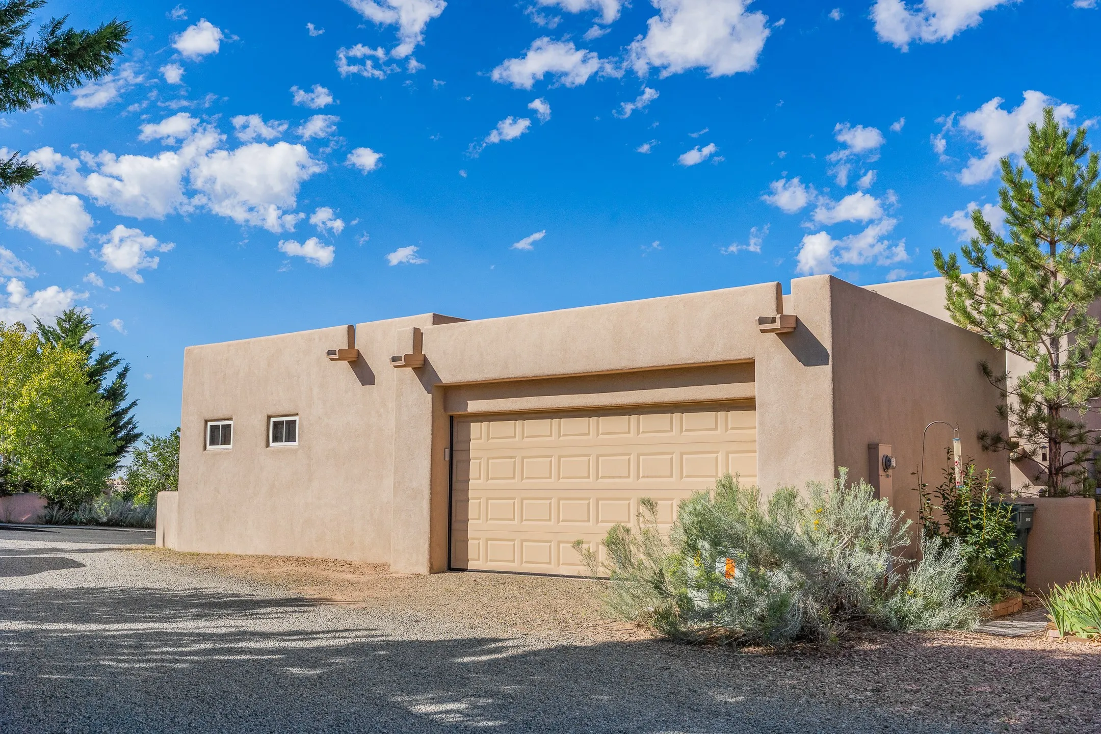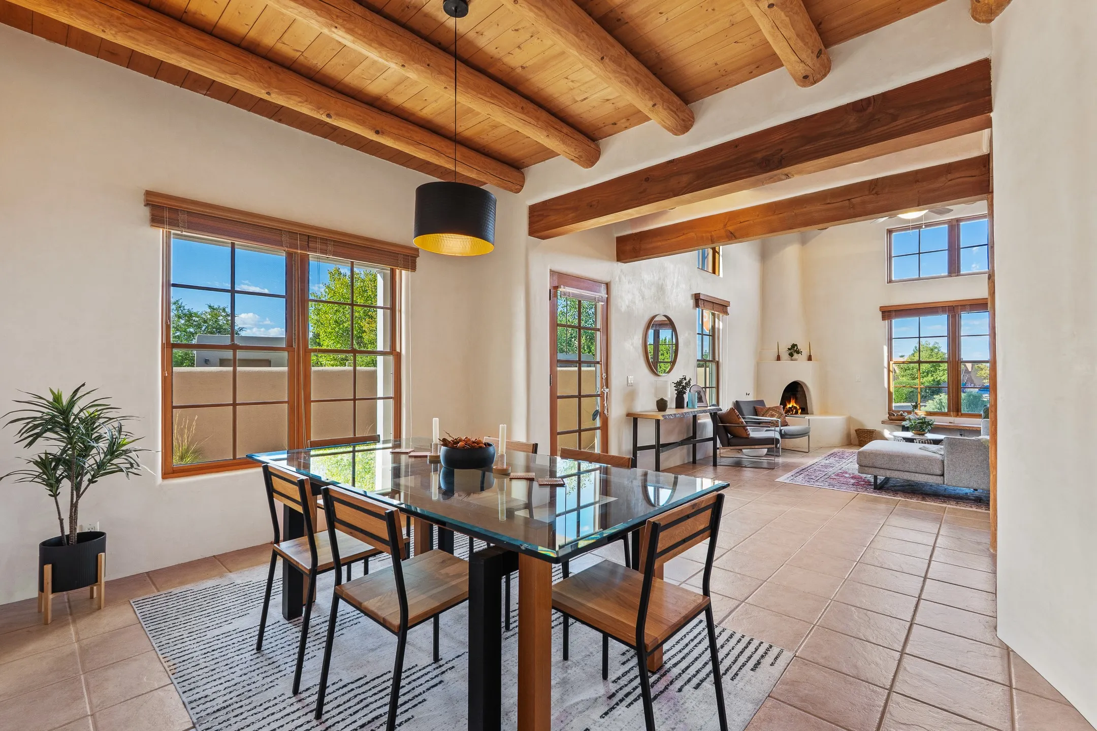 First time on the market in Santa Feās Aldea de Santa Fe community! Built in 2003 by Bruce Thompson, this wonderfully flexible configuration offers a three-bedroom main house and detached casita perfectly suited to serve creative pursuits and hosting-needs. The main homeās central living and dining spaces are adorned with Santa Fe-classics: plaster walls, viga-accented ceilings, and a cozy wood-burning kiva fireplace. Adjacent to the light-filled living room is a private nook, finished with built-in bookcases, that functions effortlessly as an office/study, secondary seating area, or creative space. The kitchen is complete with abundant countertop space, ample cabinetry/storage and an informal dining area. Upstairs, the primary bedroom is a relaxing retreat with its own private deck. Outside, the patio area is a serene setting to unwind and the surrounding yard is well-suited for low-fuss flower and garden beds. The detached 345+/- sqft casita is a work-from-home dream, or a comfortable arrangement for hosting friends and family. Sensibility and style collide in one of Santa Feās vibrant and well-cared for communities. Aldea is an active community with miles of walking trails, a community center and other amenitiesāall just 15 minutes from downtown Santa Fe.