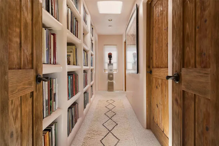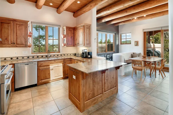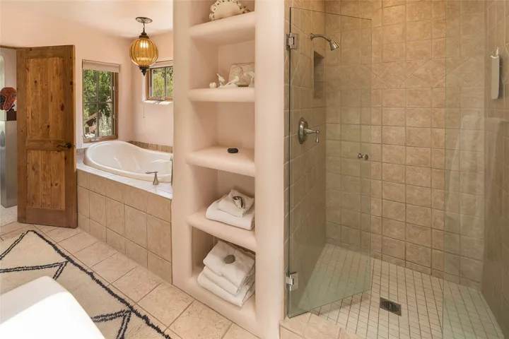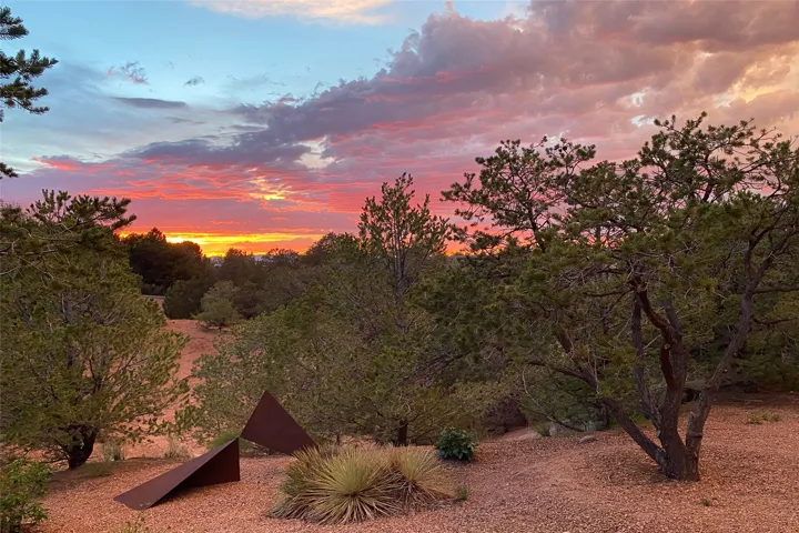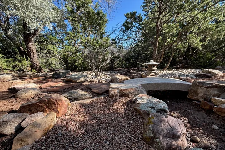 The gourmet kitchen pairs polished granite, rich alder cabinetry, and sleek stainless appliances, while a luminous banco breakfast nook bathes in morning sun. Two master suites provide generous proportions and a serene ambiance, joined by a versatile third bedroom or office. The residence is completely single-level once entered. Outdoors, inviting portals designed for dining and entertaining create natural circulation into the gardens. A variety of fruit trees including peach, plum, cherry, apple and apricot, and a meandering wooded meditation walking path with fountain complete this secluded haven. Secured within La Canteraās gates with a 2-car attached garage, this rare property offers privacy, beauty, and architectural distinction – a world away but an easy stroll to Canyon Roadās world renowned galleries and fine dining including Geronimo, The Tea House, and El Farol.