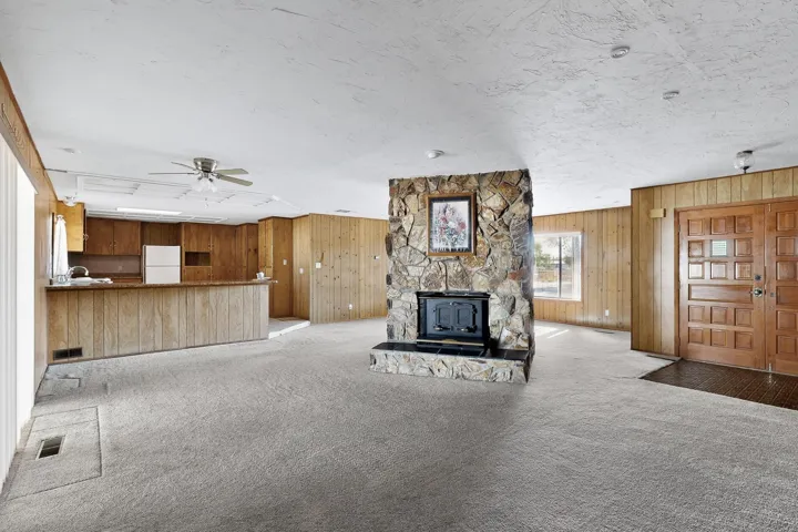 Spacious Los Lunas home with unique features! The open living and dining room is anchored by a double-sided fireplace, creating a warm focal point. The kitchen is generously sized with an island and plenty of room to personalize. Step outside to a covered patio with ceiling fans, perfect for relaxing or entertaining. A separate studio in the backyard adds flexibility for hobbies, work, or guests. This home offers great space and character, ready for your vision and updates.