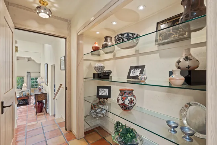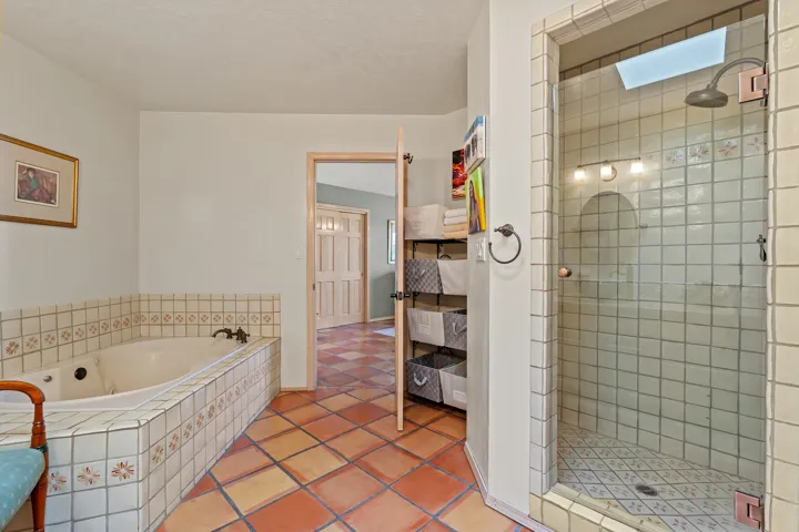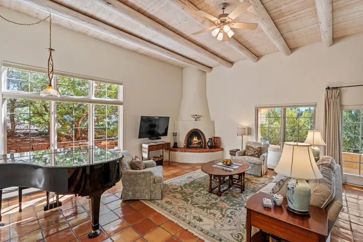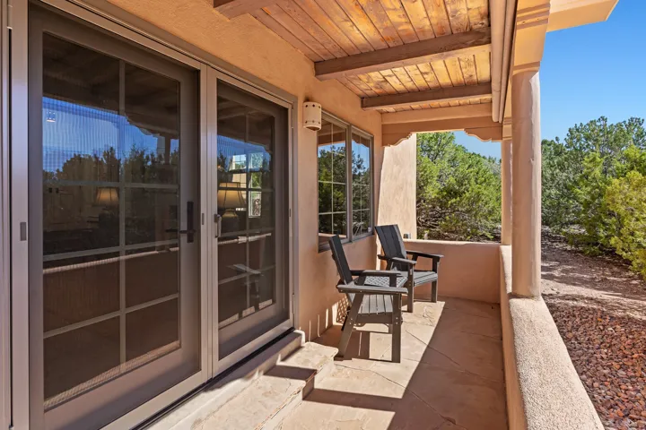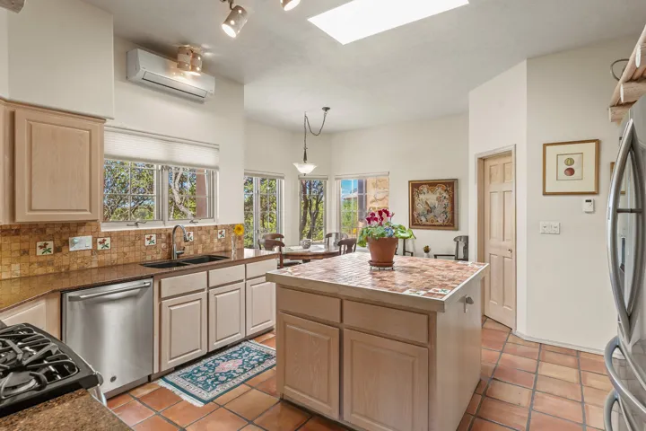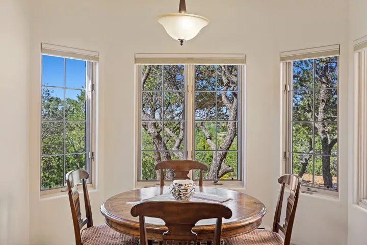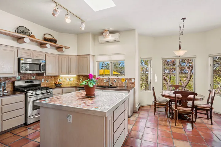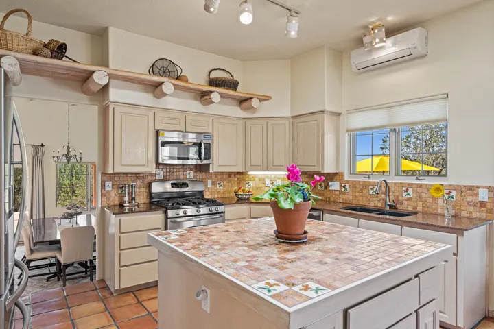 The main living and dining area exudes Southwestern charm with high ceilings, vigas, a lovely wood-burning kiva fireplace, and French doors opening to a wraparound portal. A flagstone patio creates a magical outdoor dining setting to enjoy Santa Feās sunsets and outdoor living. The kitchen, with its inviting breakfast nook, island, and warm regional details, is perfectly suited for both everyday living and entertaining.