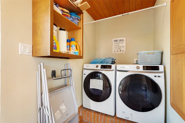 Laundry room with newer Samsung washer/dryer + built-in ironing board