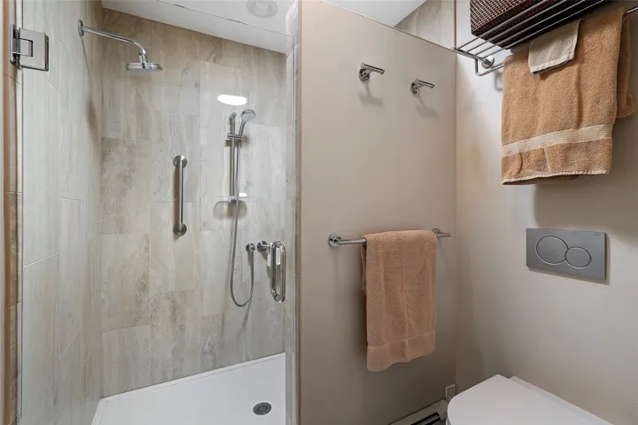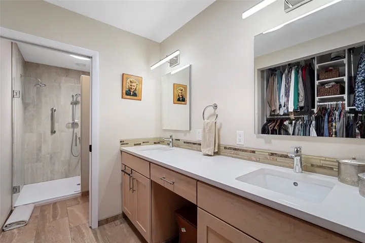 Dual vanity, euro-style toilet, dual shower heads, and custom tile finishes and closet space