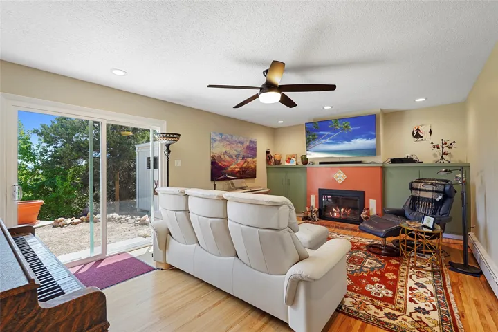Family room with gas fireplace stove (convertible to wood-burning) + patio access