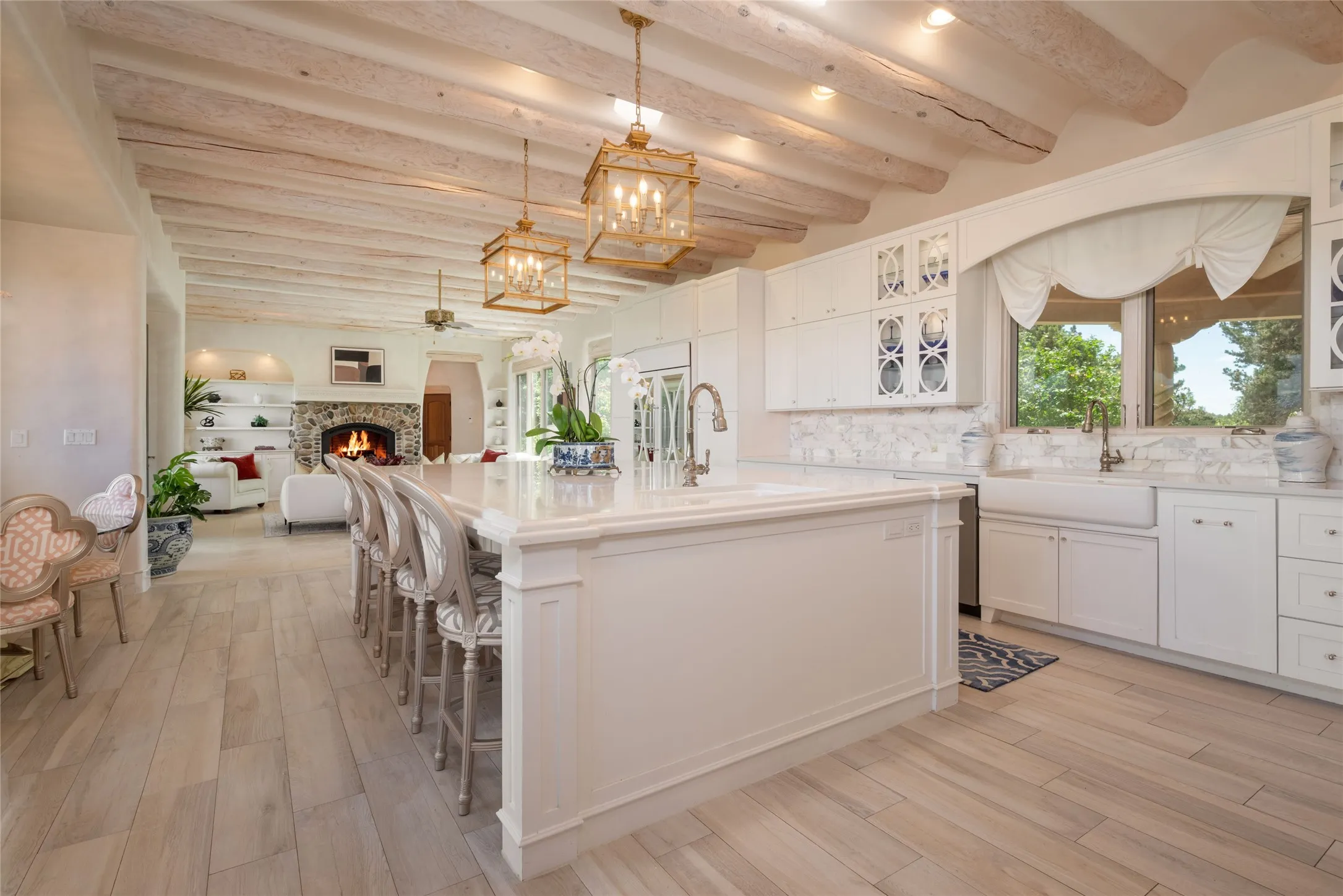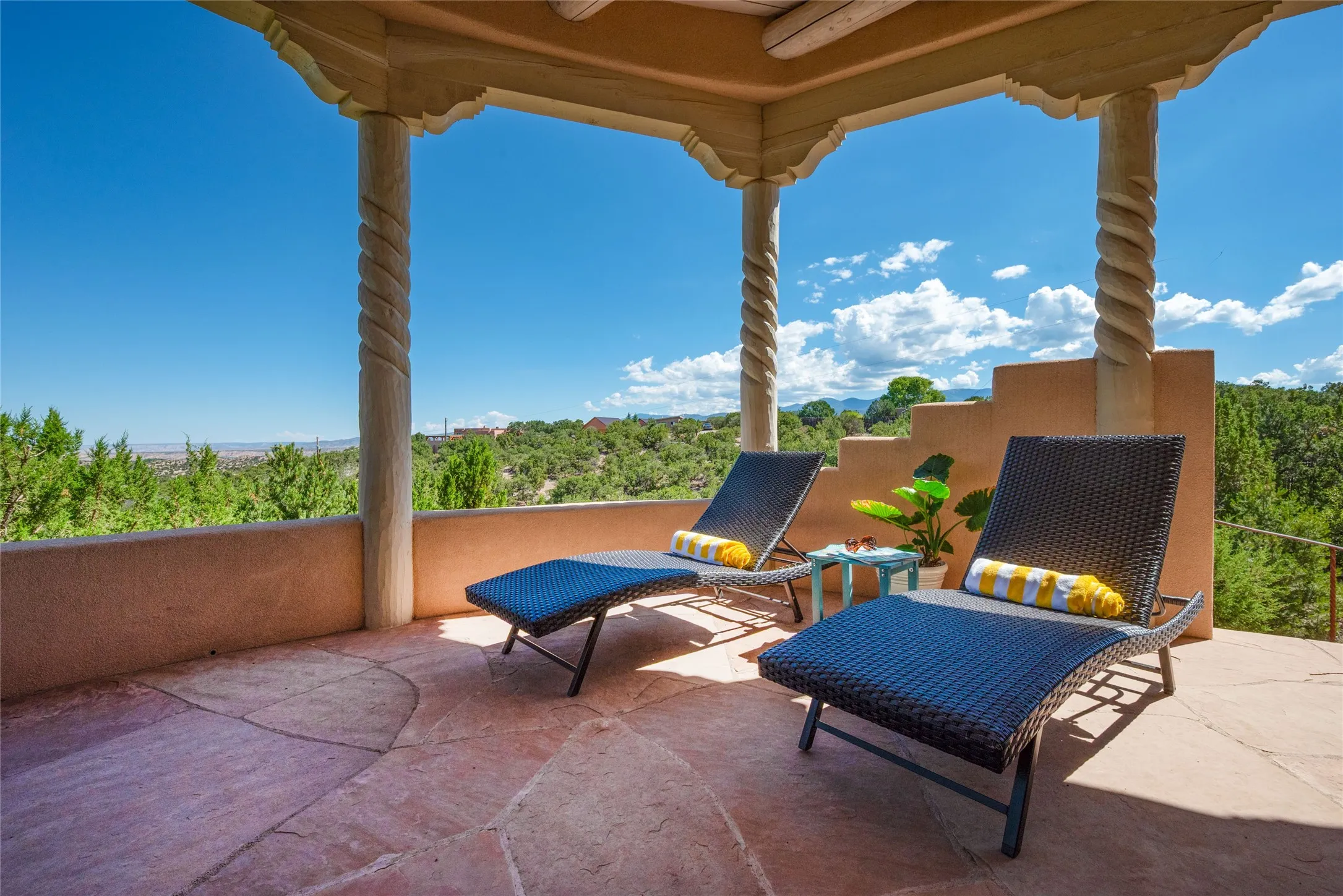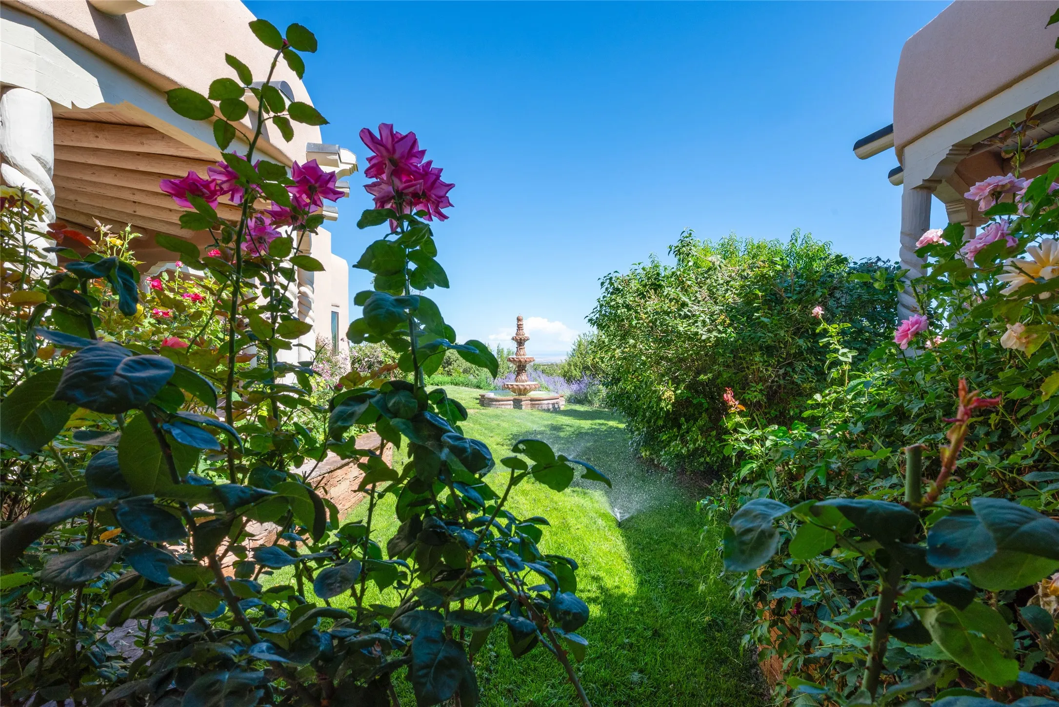 Grand Hacienda Winner and the unrivaled Belle of Tano Road redefines the essence of luxury living. Nestled behind exquisite handcrafted wrought iron gates, you are transported to a serene desert oasis, embraced by the splendor of nature, offering unparalleled privacy and sanctuary from the world. As you enter through handcrafted mahogany and wrought iron doors, the soaring ceilings and diamond plaster walls create an atmosphere of grandeur, while the Italian porcelain floors reflect a commitment to the highest standards of luxury and craftsmanship. Every detail has been meticulously curated for you. The great room, with its endless windows, invites you to bask in the breathtaking views of the sweeping mountains and the enchanting cityscape below, perfectly positioned above the exclusive enclave of Santa Fe. The sprawling estate houses two exquisite primary suites, each featuring spa-like bathrooms with soaking tubs, emperor showers, and ample space to have a powder room lounge, a meditation space, or a fitness area. Each of the four bedrooms is its own sanctuary, complete with fireplace and en-suite facilities, ensuring every guest feels like royalty and that their comfort and privacy are paramount. The gourmet kitchen is a culinary dream featuring custom cabinetry, Wolf range with double ovens and a warming drawer, Sub-Zero refrigerator, and a massive island seamlessly connecting to the outdoor cooking and dining spaces for effortless entertaining. Expansive grounds, nearly three lush acres, adorned with manicured lawns, vibrant rose gardens, and fruit trees, offer an idyllic setting for outdoor gatherings. These luxurious spaces provide not just comfort, but a lifestyle of sophistication. Immaculately maintained and thoughtfully expanded, this sprawling 6,700sq.ft estate is a testament to refined living. This is more than just a home – it is a lifestyle drenched in luxury and elegance. Design that speaks to the most discerning tastes and coveted desires. *Video*