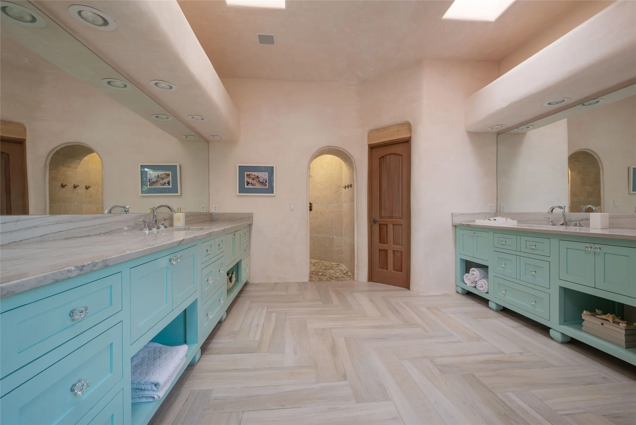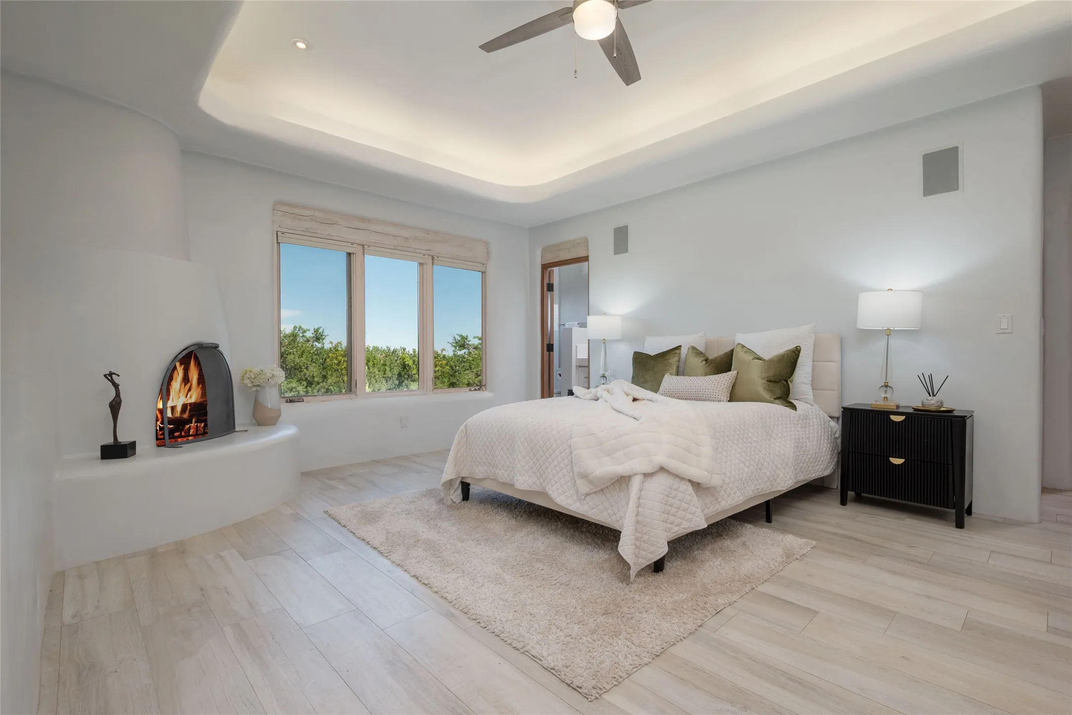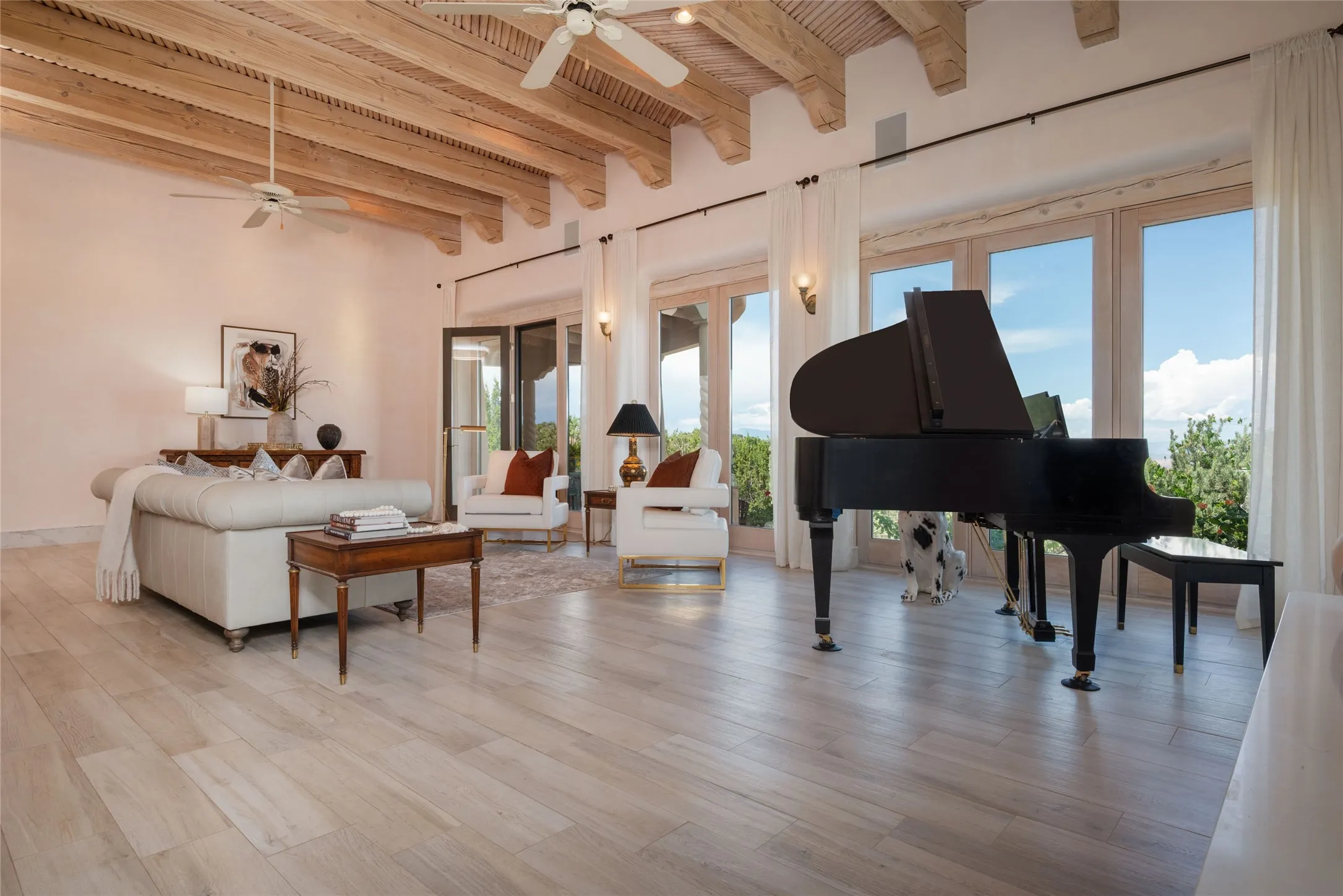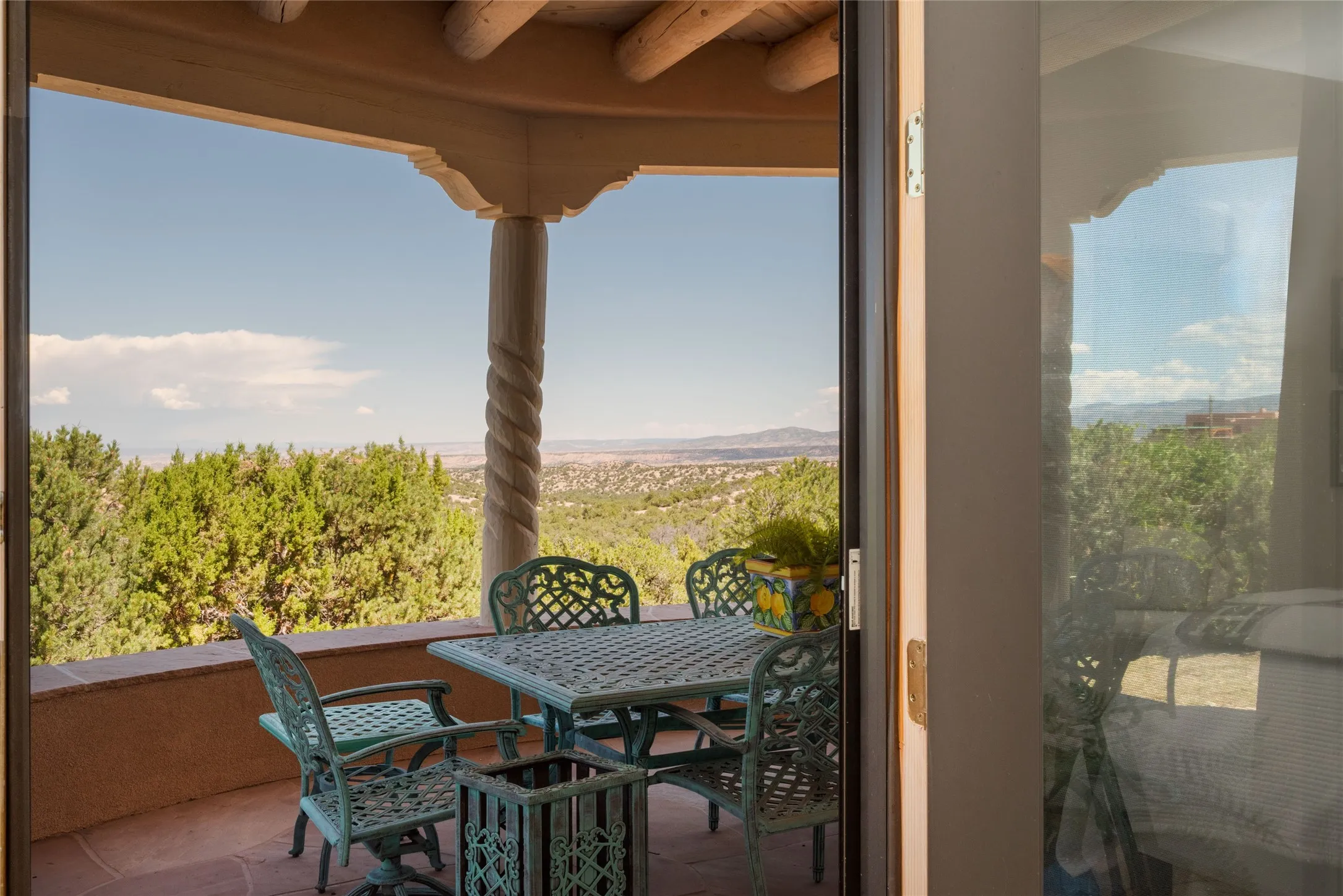 Grand Hacienda Winner and the unrivaled Belle of Tano Road redefines the essence of luxury living. Nestled behind exquisite handcrafted wrought iron gates, you are transported to a serene desert oasis, embraced by the splendor of nature, offering unparalleled privacy and sanctuary from the world. As you enter through handcrafted mahogany and wrought iron doors, the soaring ceilings and diamond plaster walls create an atmosphere of grandeur, while the Italian porcelain floors reflect a commitment to the highest standards of luxury and craftsmanship. Every detail has been meticulously curated for you. The great room, with its endless windows, invites you to bask in the breathtaking views of the sweeping mountains and the enchanting cityscape below, perfectly positioned above the exclusive enclave of Santa Fe. The sprawling estate houses two exquisite primary suites, each featuring spa-like bathrooms with soaking tubs, emperor showers, and ample space to have a powder room lounge, a meditation space, or a fitness area. Each of the four bedrooms is its own sanctuary, complete with fireplace and en-suite facilities, ensuring every guest feels like royalty and that their comfort and privacy are paramount. The gourmet kitchen is a culinary dream featuring custom cabinetry, Wolf range with double ovens and a warming drawer, Sub-Zero refrigerator, and a massive island seamlessly connecting to the outdoor cooking and dining spaces for effortless entertaining. Expansive grounds, nearly three lush acres, adorned with manicured lawns, vibrant rose gardens, and fruit trees, offer an idyllic setting for outdoor gatherings. These luxurious spaces provide not just comfort, but a lifestyle of sophistication. Immaculately maintained and thoughtfully expanded, this sprawling 6,700sq.ft estate is a testament to refined living. This is more than just a home – it is a lifestyle drenched in luxury and elegance. Design that speaks to the most discerning tastes and coveted desires. *Video*