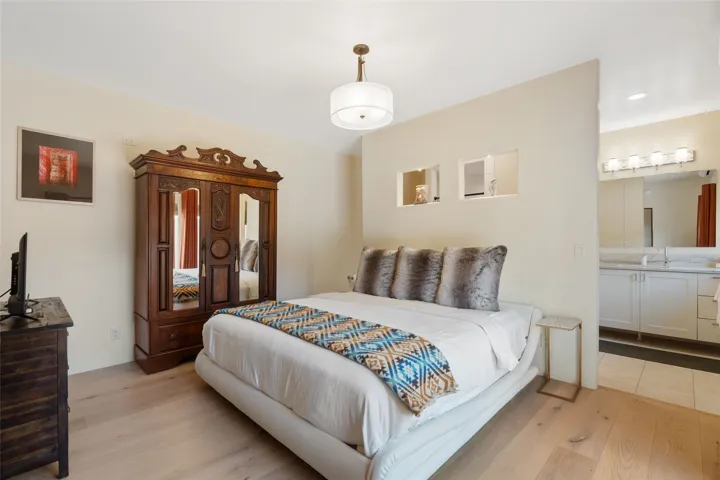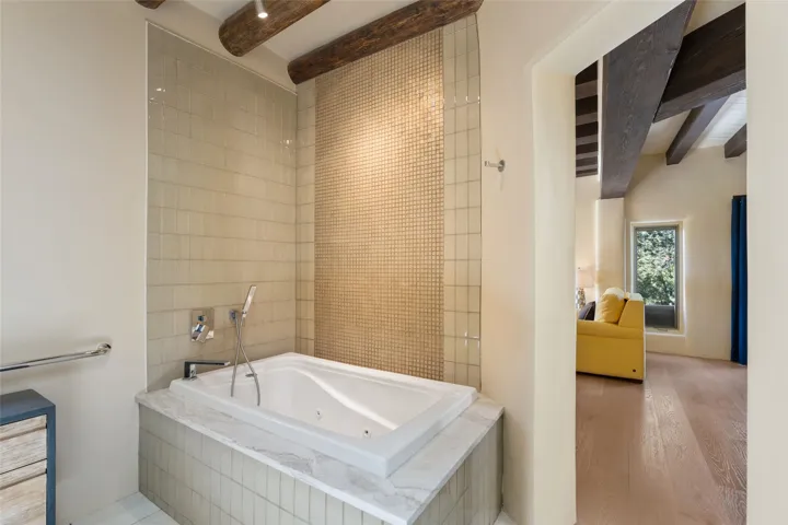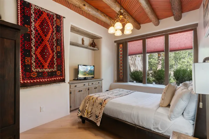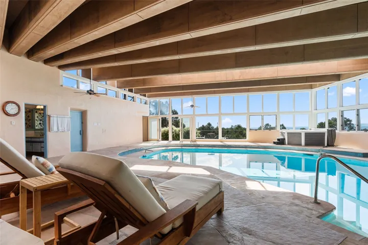 Just a minute off the historic Old Santa Fe Trail in the foothills of the Sangre de Cristo mountains, there resides a spectacular expression of design and architecture. This totally remodeled adobe/frame and stucco home sits upon 1.98 maturely treed and landscaped acres. Exquisitely constructed in a traditional Pueblo design, the 3 bedroom/3 bath, 3,900 +/- sq.ft. main home was designed with a timeless attention to detail, from the siting of the home to the hand plastered walls, vigas with cedar planking, and cascading wood floors throughout. Lovingly upgraded and maintained, the home has several primary suite options with each their own lavish and spa-like bathrooms. An open concept living/dining area is bathed in natural light with a dramatic gas fired fireplace centering the room opposite a wall of disappearing glass doors, ideal for year round entertaining on the deep portal. The large gourmet kitchen area offers a free and easy experience for those looking to entertain or who enjoy an upscale culinary experience. A nearby oversized 2-car garage has additional storage space and shelving. A detached 1 bedroom/1 bath, 1,189 +/- sq.ft. guesthouse is separated from the main house, with its own private outdoor entertaining area and hot tub. The traditional design continues in the guest house, complemented with Saltillo tile floors, vigas and a full kitchen, perfect for guests or an additional rental opportunity. A grand pool room with another hot tub completes the property with its own bathroom, and a separate studio space nearby. A wraparound deck, just off the pool room, has breathtaking western, sunset views, easily viewable while lounging in relaxation from the inside or outside. The property is just a 5 minute drive to the famous Harryās Roadhouse Restaurant or The Club at El Gancho, all on paved and maintained roads. Both the main house and guest house have grossed superlative rental income since ownership with the furnishings available for purchase ideal for those looking for an exceptional investment opportunity property. Function and creativity blend in perfect unison with nature in a fantastic Santa Fe location.