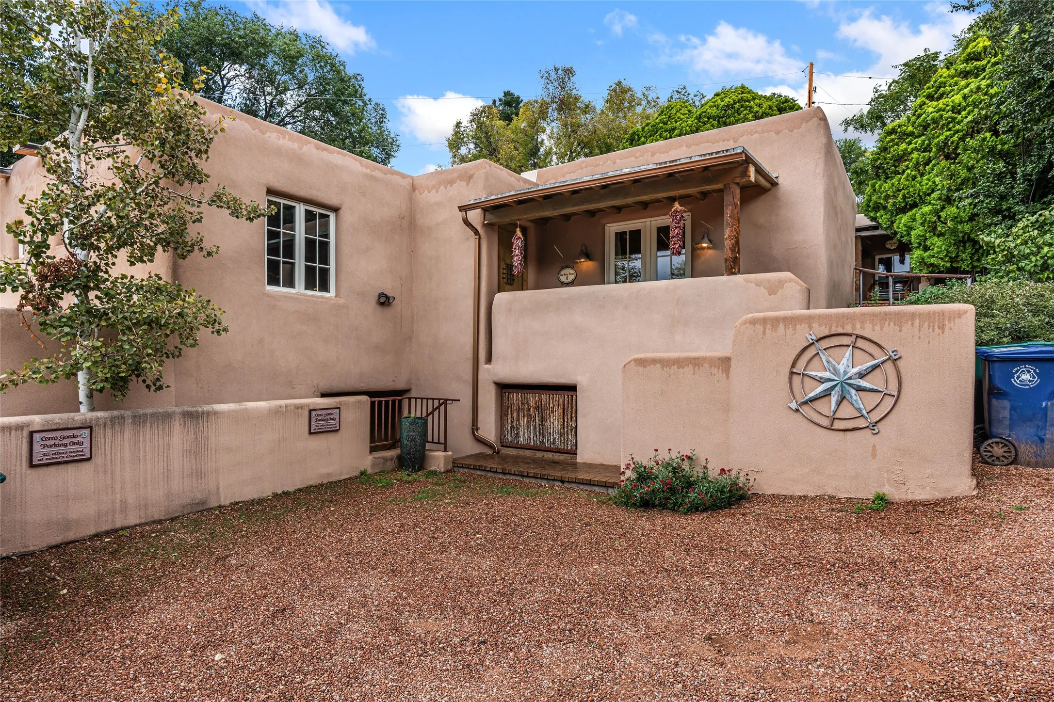 Los Perales is a pear tree covered hillside in the historic district, corner of Palace Avenue and Cerro Gordo with three beautiful units designed and built by internationally renowned architect Michael Mahaffey. Great location, wonderful finishes! This lovely Unit B includes two well separated bedrooms and baths that flank the central living areas with gorgeous hand, troweled plaster walls; lovely pickled high, beamed ceilings; tumbled travertine marble baths; private, lovely, entertaining courtyards outside. The intelligent floor plan is elegant and livable! There is plenty of parking and the property is an easy stroll to the plaza, Canyon Road, the river, and the museum District. Walk home in the moonlight in 3 minutes from The Compound, Geronimo, and El Farol!