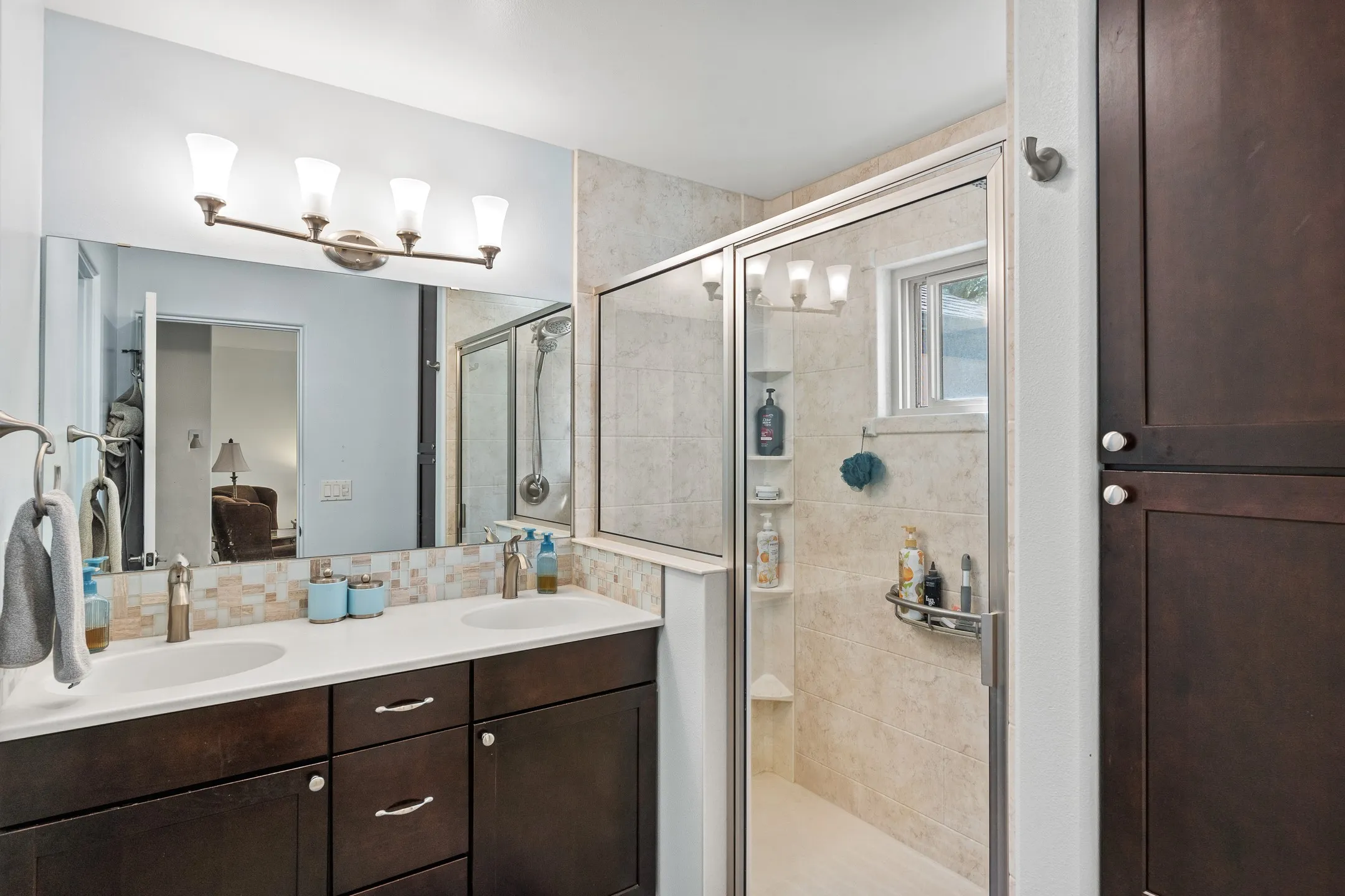 Upstairs youāll find the primary suite featuring a walk-in closet and en suite bathroom. The en suite bathroom features dual vanities and a generously sized walk-in shower. Two guest bedrooms and a full bathroom complete the upper level.