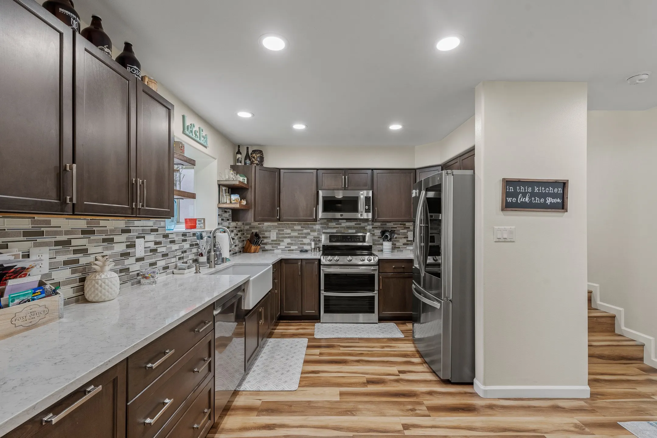 An updated kitchen rounds out the first floor and features stainless steel appliances, a glass tile backsplash, generous cabinet space and a dining area that leads to the back patio area.