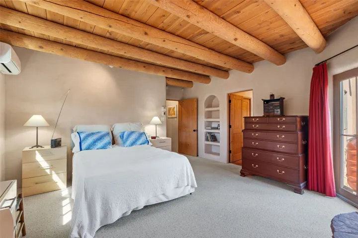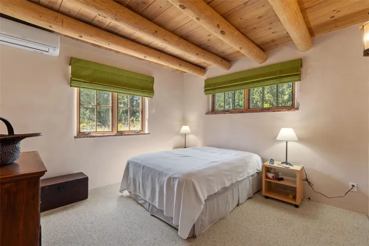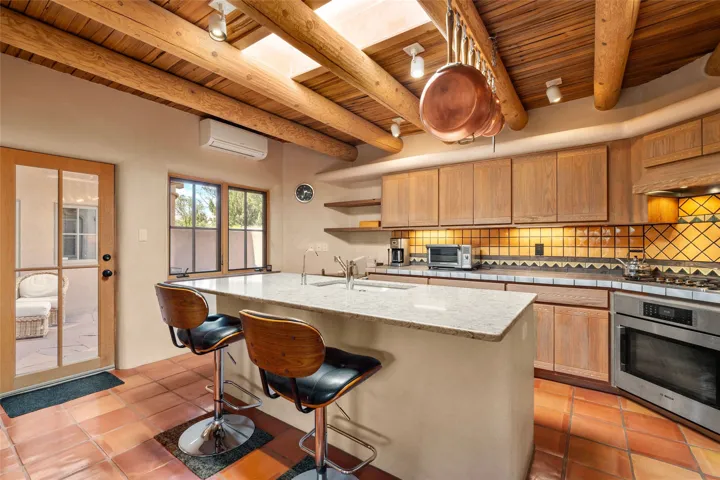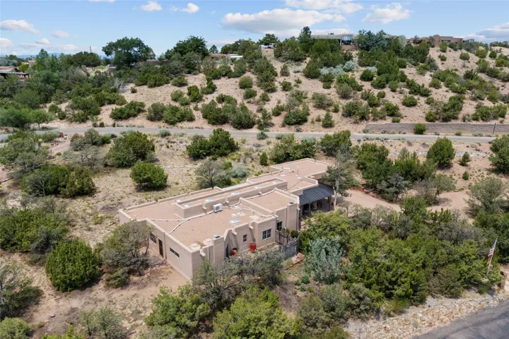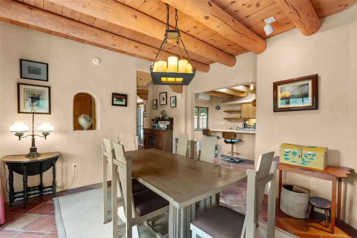 Prime Northside 3-bedroom, 2.5 home sited amidst Aspen and PiƱon trees with stunning views of the Sangre de Cristo Mountains. This single-level residence features no interior steps. Embracing the iconic Santa Fe style, the home showcases Saltillo tile floors, banco seating, and elegant plaster walls, complemented by traditional vigas and latillas. Two kiva fireplaces add warmth and character. The separate dining area offers captivating views of the Sangres, creating a delightful backdrop for mealtime. The updated kitchen is designed with a large island for casual seating and French doors that open to a covered patio, ideal for outdoor dining or relaxation. The primary suite features its own kiva fireplace, along with a separate office or exercise space and an outdoor patio. Additionally, the home includes a two-car garage with extra storage, enhancing convenience. Surrounded by natural landscaping, this property offers a tranquil setting while being just under two miles from the vibrant heart of downtown Santa Fe.