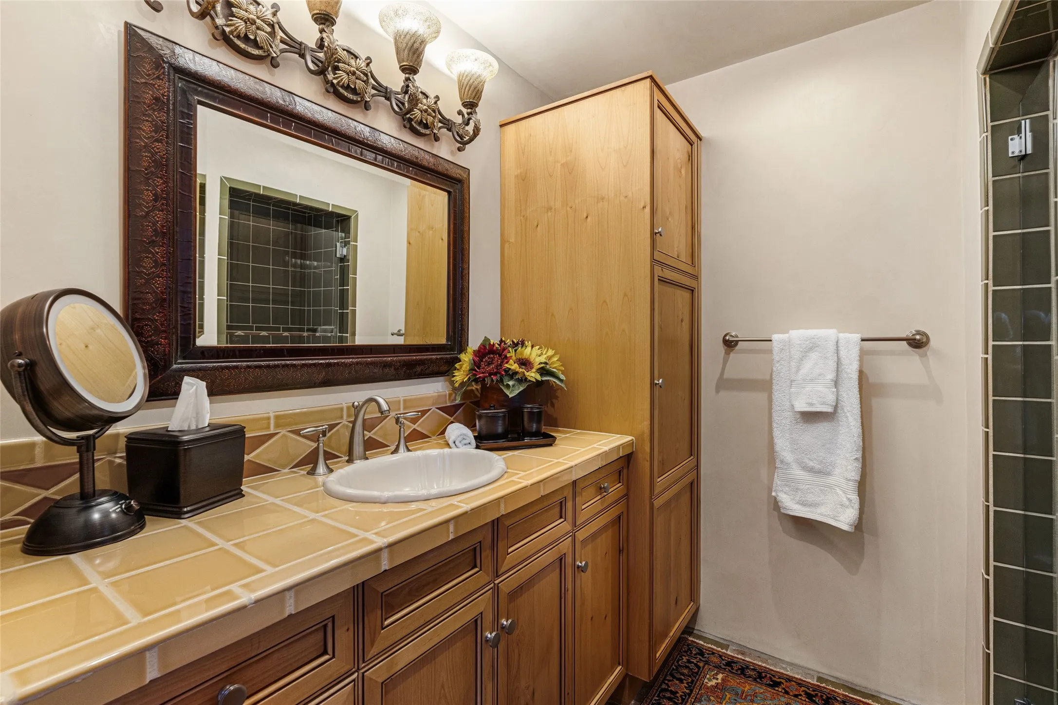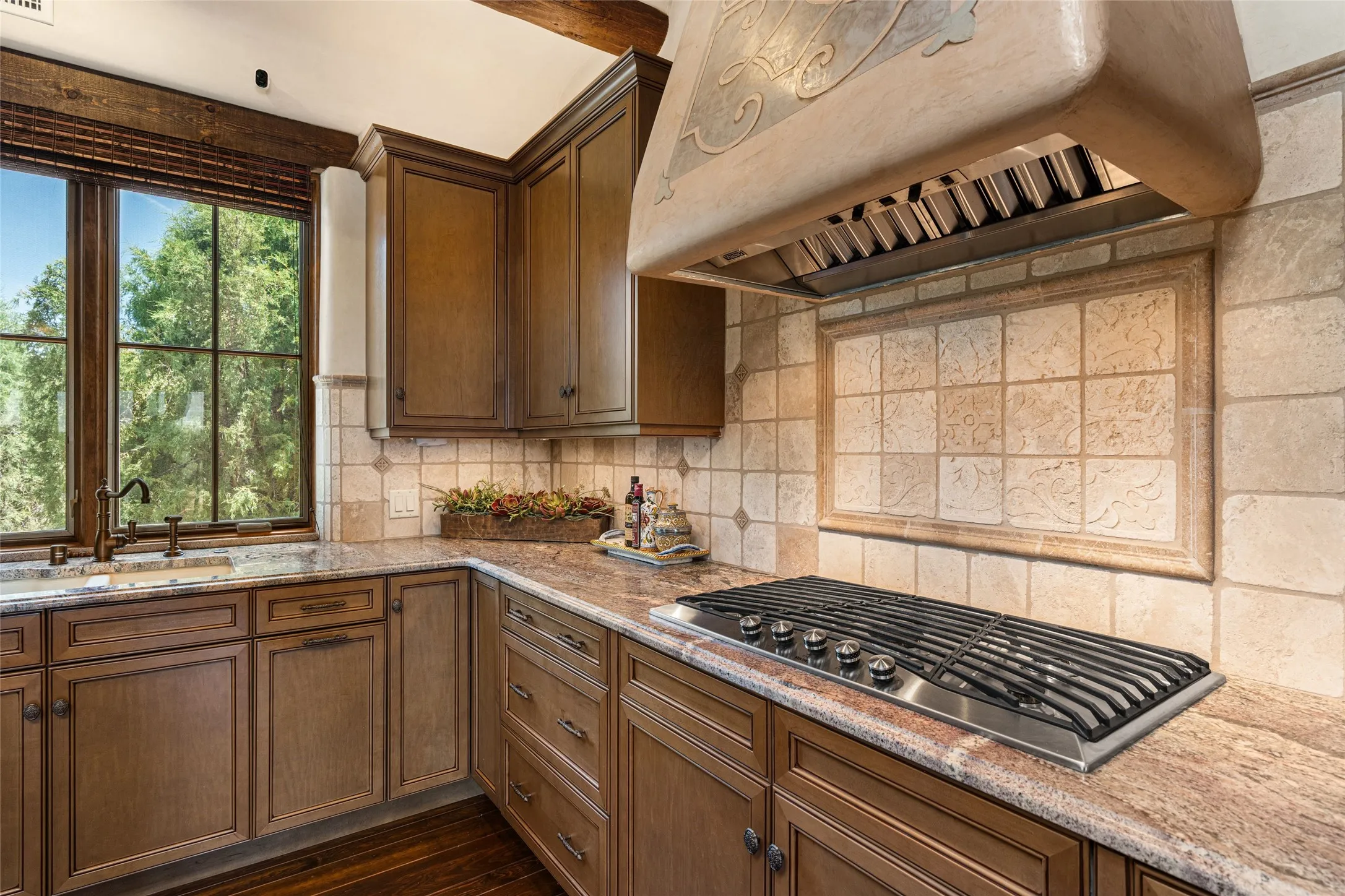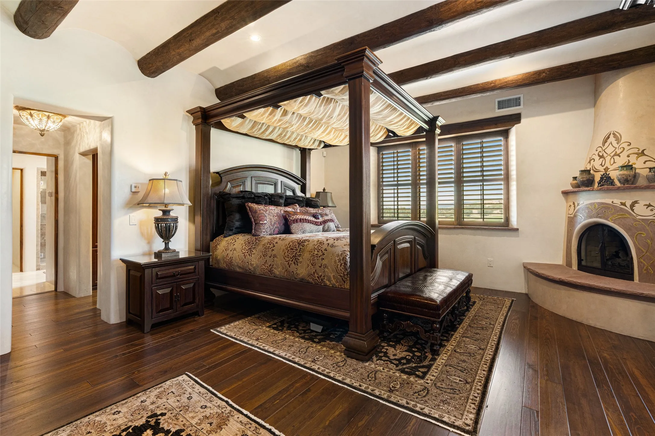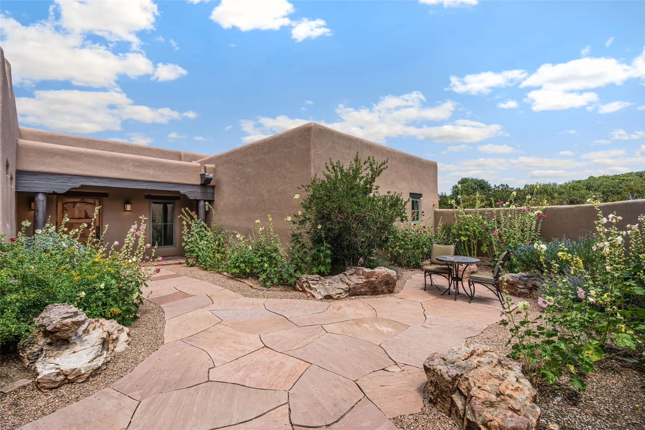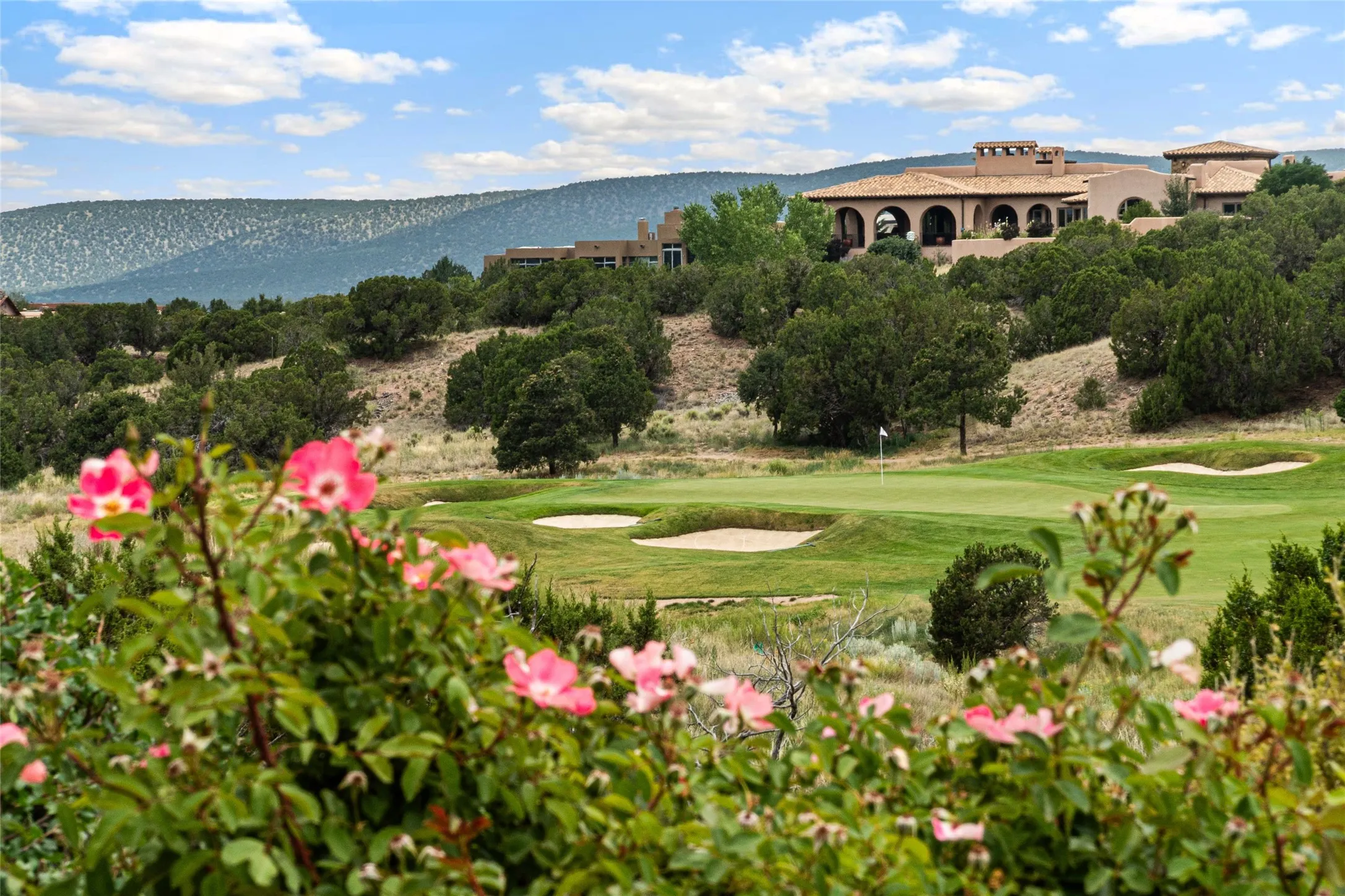 This home is the epitome of Refined Santa Fe Elegance, with 4 Bedrooms, 4.5 baths, 4 Fireplaces, No Steps and panoramic views of Sandia Mountain & the Fourth Fairway of the Sunset Golf Course, at the end of a cul-de-sac in Gated Las Campanas. An expansive hallway for artwork features 2 sets of French doors that open to the wrap-around portal for dining & relaxing which extends to the Living Room, also showcases the golf course view. The Gourmet Kitchen includes Viking appliances, an over-size island with prep sink, menu-planning desk & Butlerās Pantry with wine cooler. The Main Bedroom suite offers a luxurious Spa Bath with large shower & whirlpool tub plus a walk-in closet worthy of a designer retail store. Bedroom Two is sequestered from the Main and has an en-suite bath. Bedroom Three with en-suite bath is adjacent to the Main and currently used as an office. Bedroom Four offers total privacy, as an attached Casita with en-suite bath & mini-kitchenette. The expansive brick Portal off the gallery hall includes a built-in BBQ & impressive fireplace, providing the perfect venue for entertaining, dining, relaxing or savoring the panoramic golf course & Sandia Mountain views. The Two-car Garage has eliminated garage clutter, with 29 feet of handsome cabinets plus a power wall to store bicycles, skis & other outdoor equipment. Come see why this 4-Bedroom home with Golf & Mountain views is the perfect embodiment of elegant Santa Fe resort living.