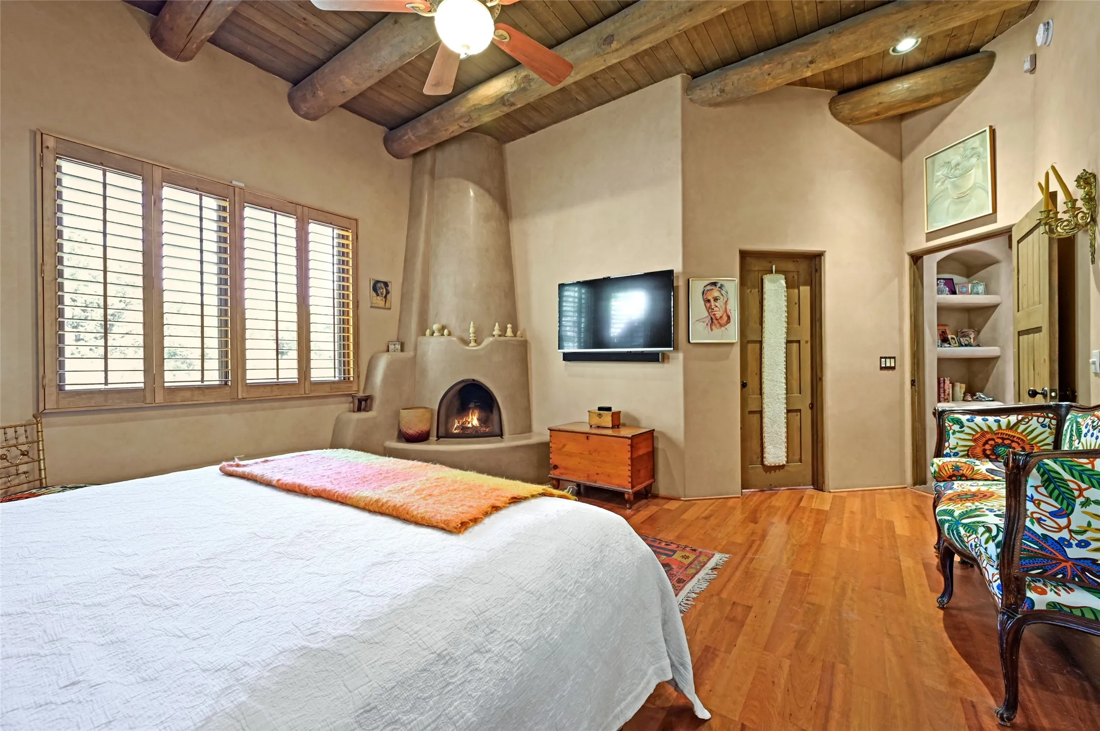 A sophisticated single level home on Santa Fe’s Northside. Nestled on a generous lot just minutes from the plaza, this 4 bedroom home boasts high ceilings with brick and wood floors. The 3 bathrooms include a generous soaking tub and steam shower. The gourmet kitchen is large with a breakfast sitting area, high end appliances and ample storage for the cook in the family. 2 fireplaces and diffused natural light are not only attractive, but make for light and bright living spaces. The outdoor living features a private patio and Jacuzzi hot tub. The grounds are professionally landscaped and the backyard is fully enclosed. This home has an attached 2 car garage.