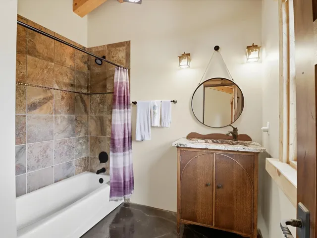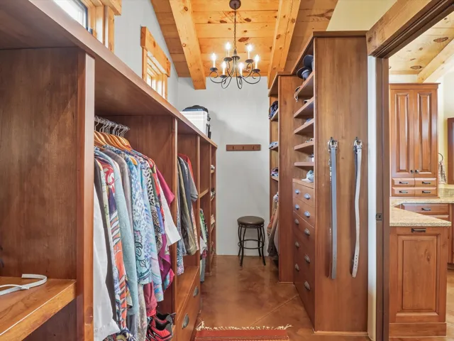 Interior features include concrete radiant-heated floors, wood vigas, and a chefās kitchen with 2 ranges, dishwasher, wine cooler, built-in refrigerator, rainforest quartz island, copper hood and backsplash, and a large pantry. A built-in china hutch adds to the custom design.