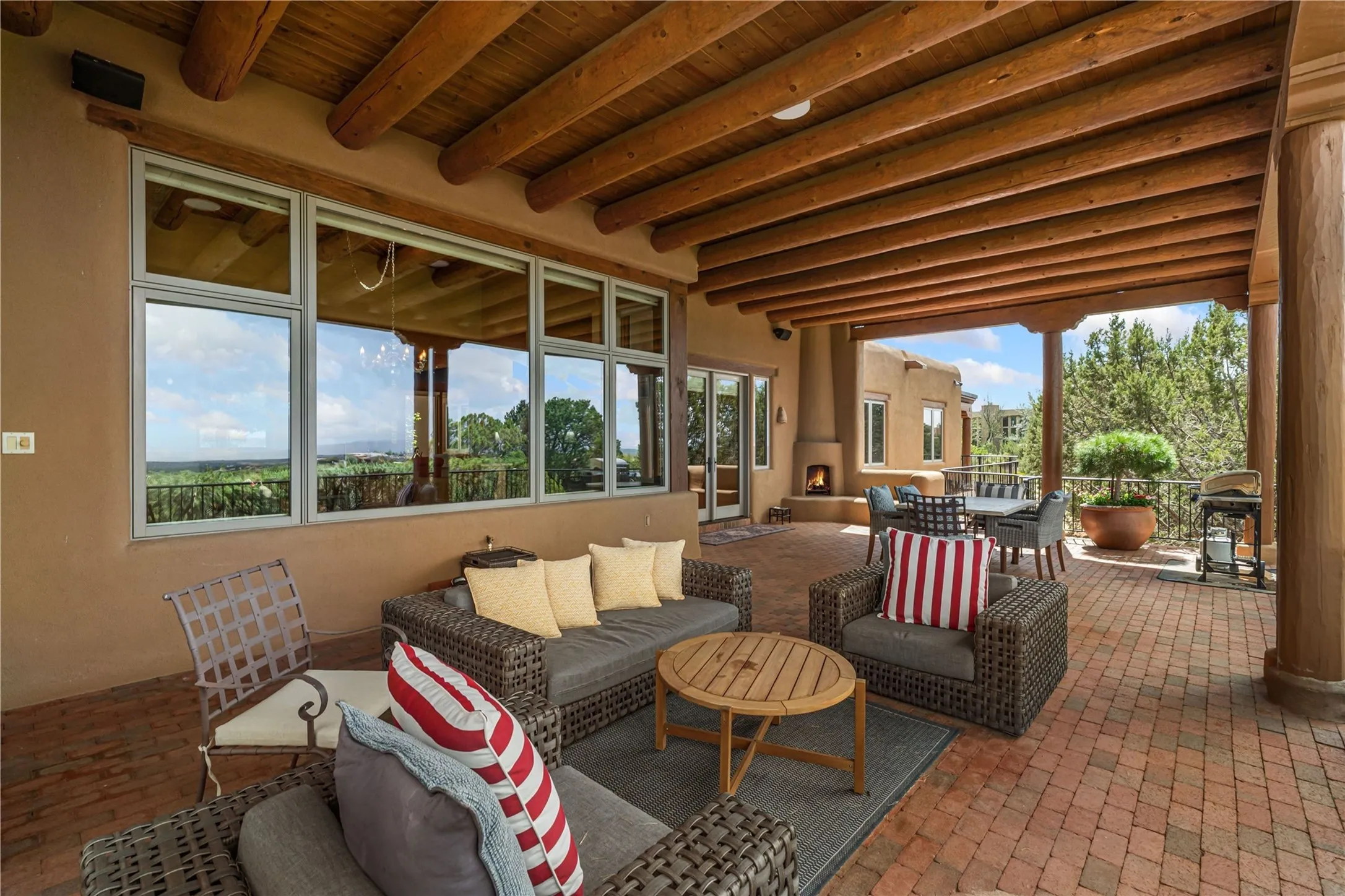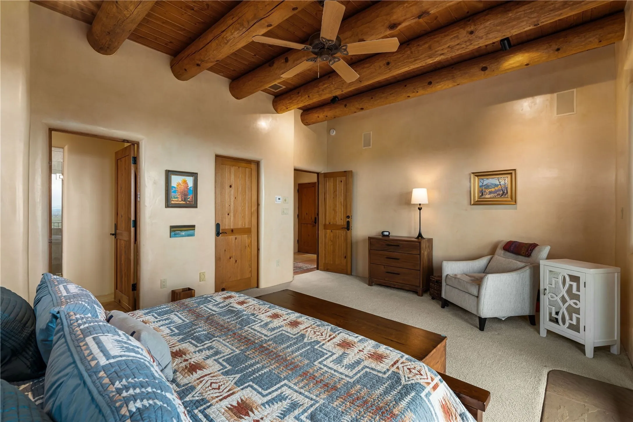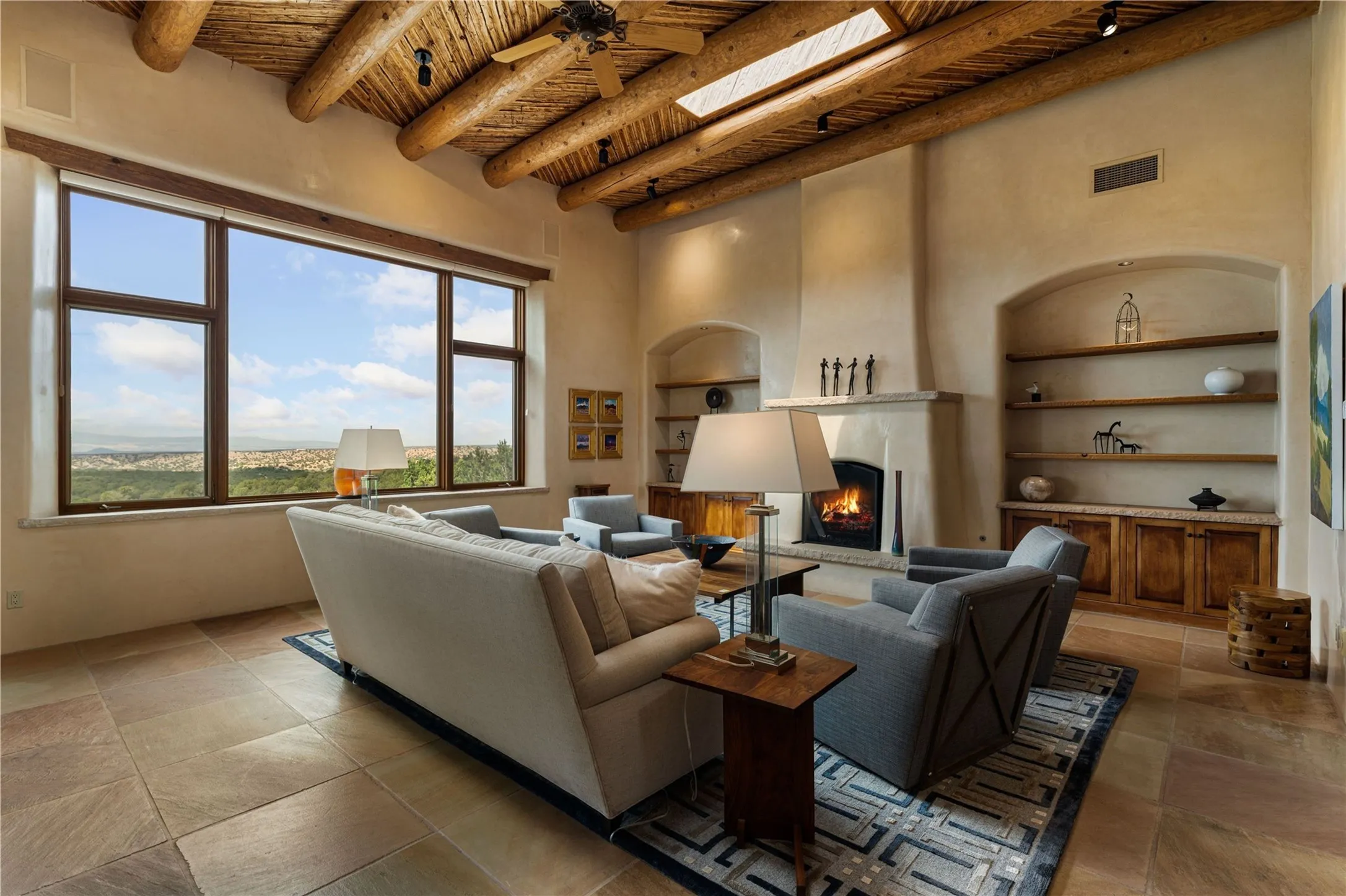 Tucked high up in Las Campanas on a generous 2.4-acre lot, this gorgeous Kim Dressel pueblo-style home is all about views, vibes, and space to breathe. From the moment you stroll through the professionally landscaped courtyard, youāll feel the magicāunobstructed vistas of the Jemez Mountains and sunsets thatāll make you stop mid-sentence just to stare. Inside, itās a custom masterpiece. Think flagstone floors, hand-hewn beams, and those classic vigas that give it that warm, earthy soul. The ceilings and walls? Absolutely stunning, with textures and treatments that make every room feel like a work of art. Natural light pours in through expansive skylights, bouncing off the hand-troweled plaster walls and stone floors, creating that signature New Mexican glow. The chefās kitchen is a showstopperātop-tier appliances, loads of granite counter space, and a butlerās pantry thatās ready for your next dinner party or midnight snack run. And if youāve got guests (or just want a little extra privacy), the attached casita is a sweet bonus: separate entrance, kitchenette, and all the cozy charm. Youāll find two primary suites plus two additional bedroom suitesāone even has its own mini kitchen and sitting room, perfect for long-term guests or multi-gen living. Whether youāre hosting a formal gathering or kicking back in the informal living spaces, this home flows effortlessly. Over 1,000 square feet of private outdoor space to soak in the views, sip your morning coffee, or toast the sunset. With its perch on one of the highest lots in the area, youāll enjoy peace, privacy, and those jaw-dropping Northwest views over untouched land. This isnāt just a houseāitās a lifestyle. Come see it, feel it, fall in love.