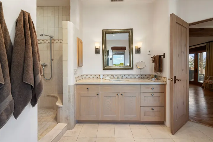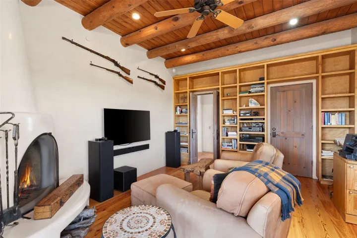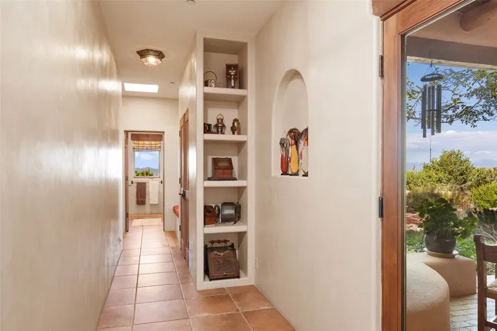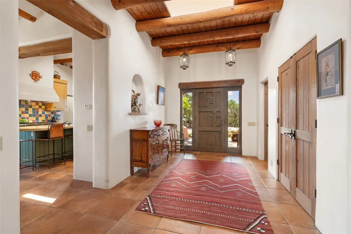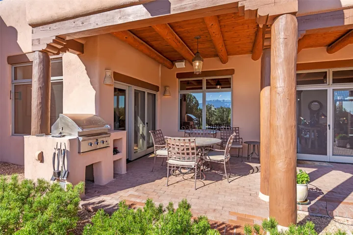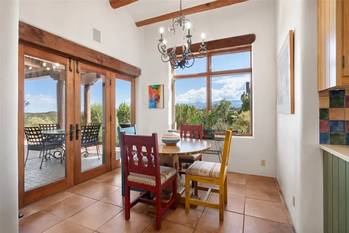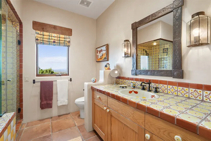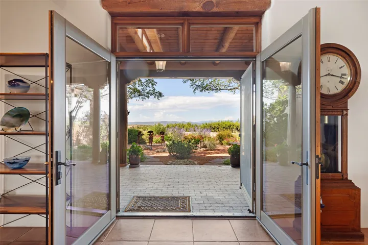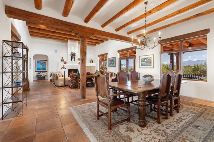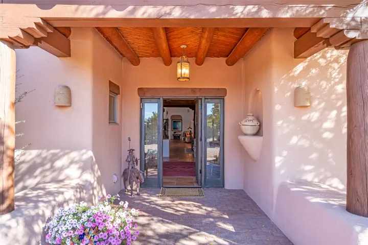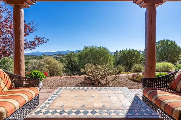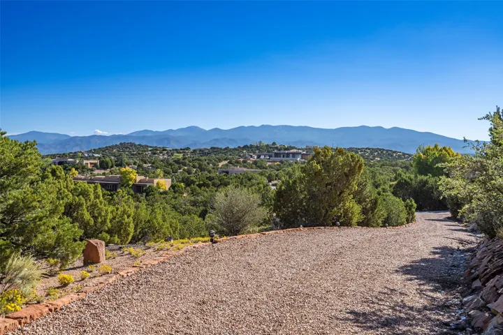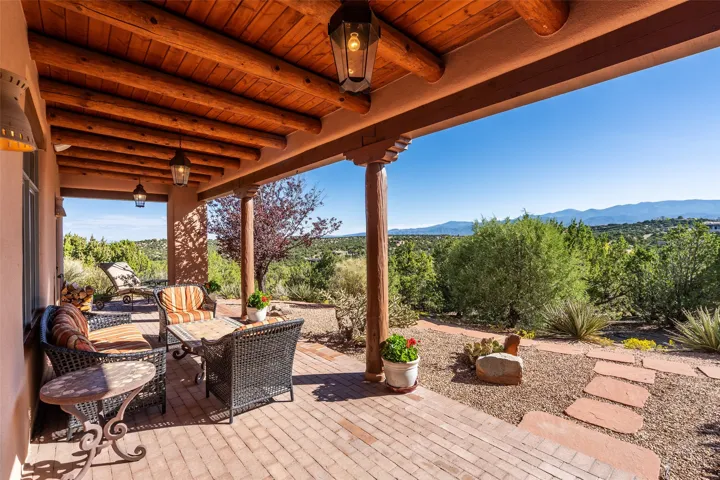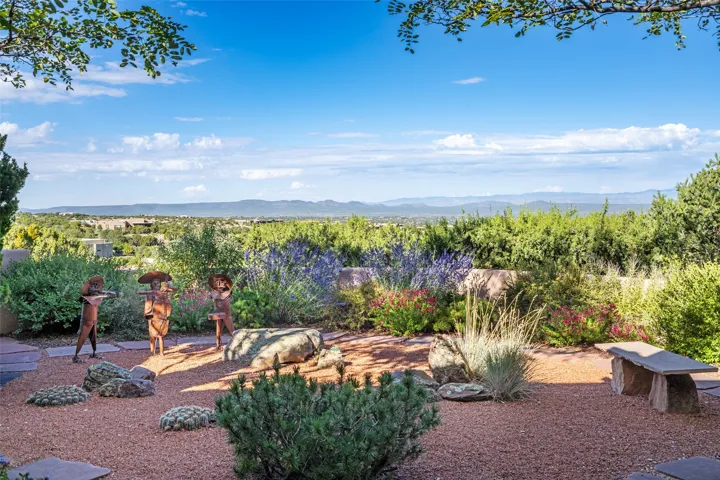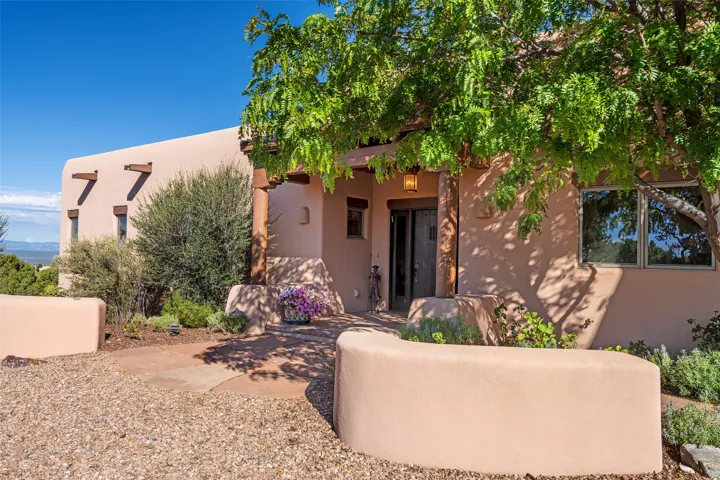 SWEEPING VIEWS OF BOTH EASTERN AND WESTERN MOUNTAIN RANGES ON AN ELEVATED LOT IN SUNDANCE ESTATES WHERE THE NIGHT SKY IS JUST AS BEAUTIFUL AS THE DAY. Designed by Richard Martinez to be a haven with warm architectural accents and superb Santa Fe touches. Set in the coveted Sundance Estates neighborhood, this stunning 3-bedroom, 3-bath home embodies timeless Santa Fe style. Absolutely full of natural light, this 3,351 sqft residence sits on 2.5 acres of mature landscaping, offering peace, privacy, and natural beauty. Inside, traditional vigas, beams, and coved ceilings are paired with creamy plaster walls, wood and tile floors, and radiant heating throughout. Four wood-burning fireplaces anchor the warm and inviting living spaces, while the gourmet kitchen is a delightful and colorful place to cook together or just cozy up with a cup of coffee and the newspaper. It features high-end appliances, and scads of counterspace and storage. Formal and informal dining areas, and seamless flow to outdoor dining patios give this residence high appeal for entertaining. The primary suite offers serenity with breathtaking views, while guest accommodations have their own wing and are equally welcoming with views and privacy. Outdoor living is elevated with multiple patios, a hot tub, and manicured grounds designed for relaxation and entertaining. A 3-car garage and additional driveway parking for 5 vehicles provide convenience. The third bay of the garage was built as a fabulous studio space and could be an art studio, gym, yoga spot, crafts room – you name it! This property is a masterful balance of traditional craftsmanship and modern comfort – an exceptional haven for refined easy Southwestern living.