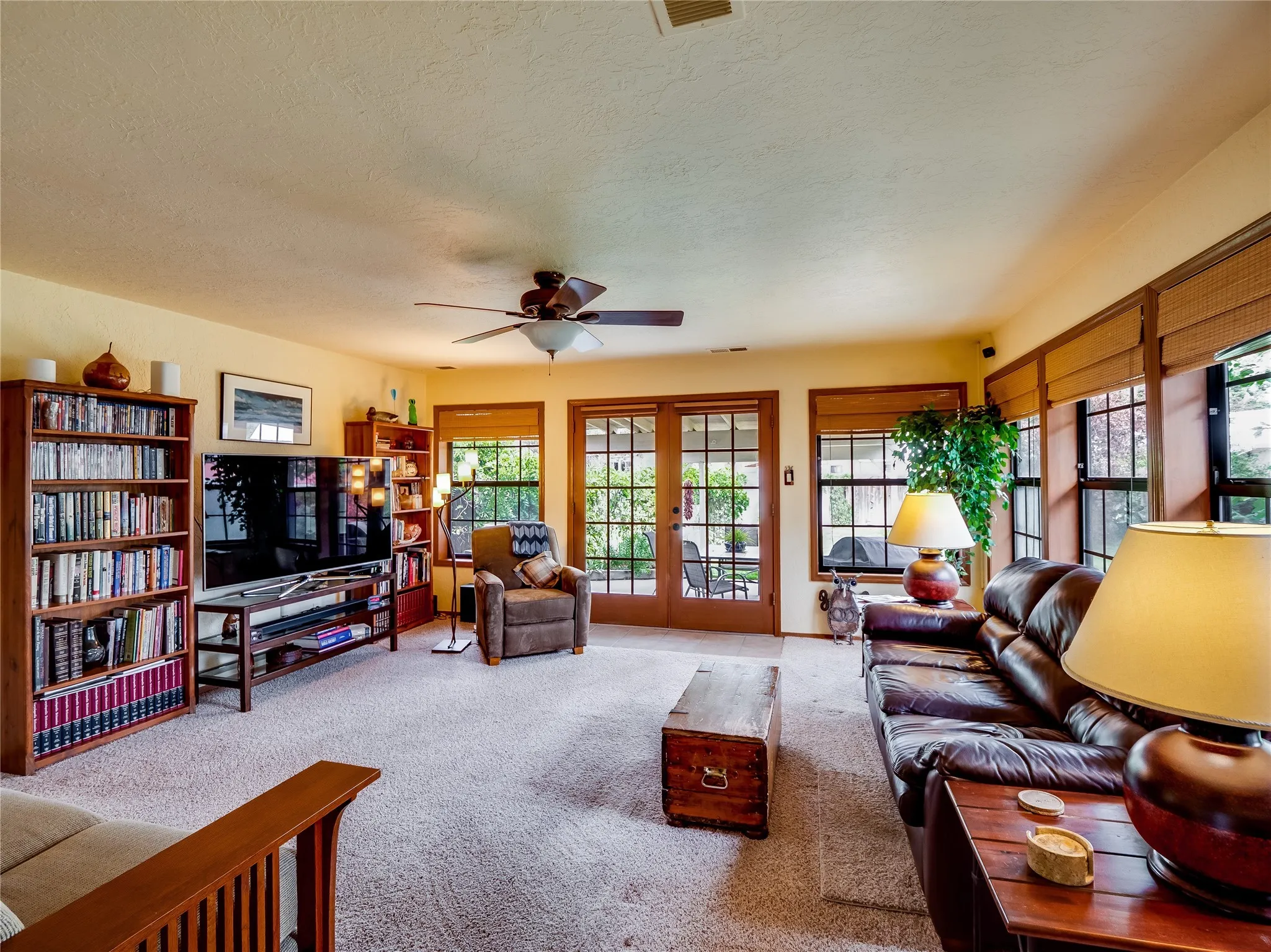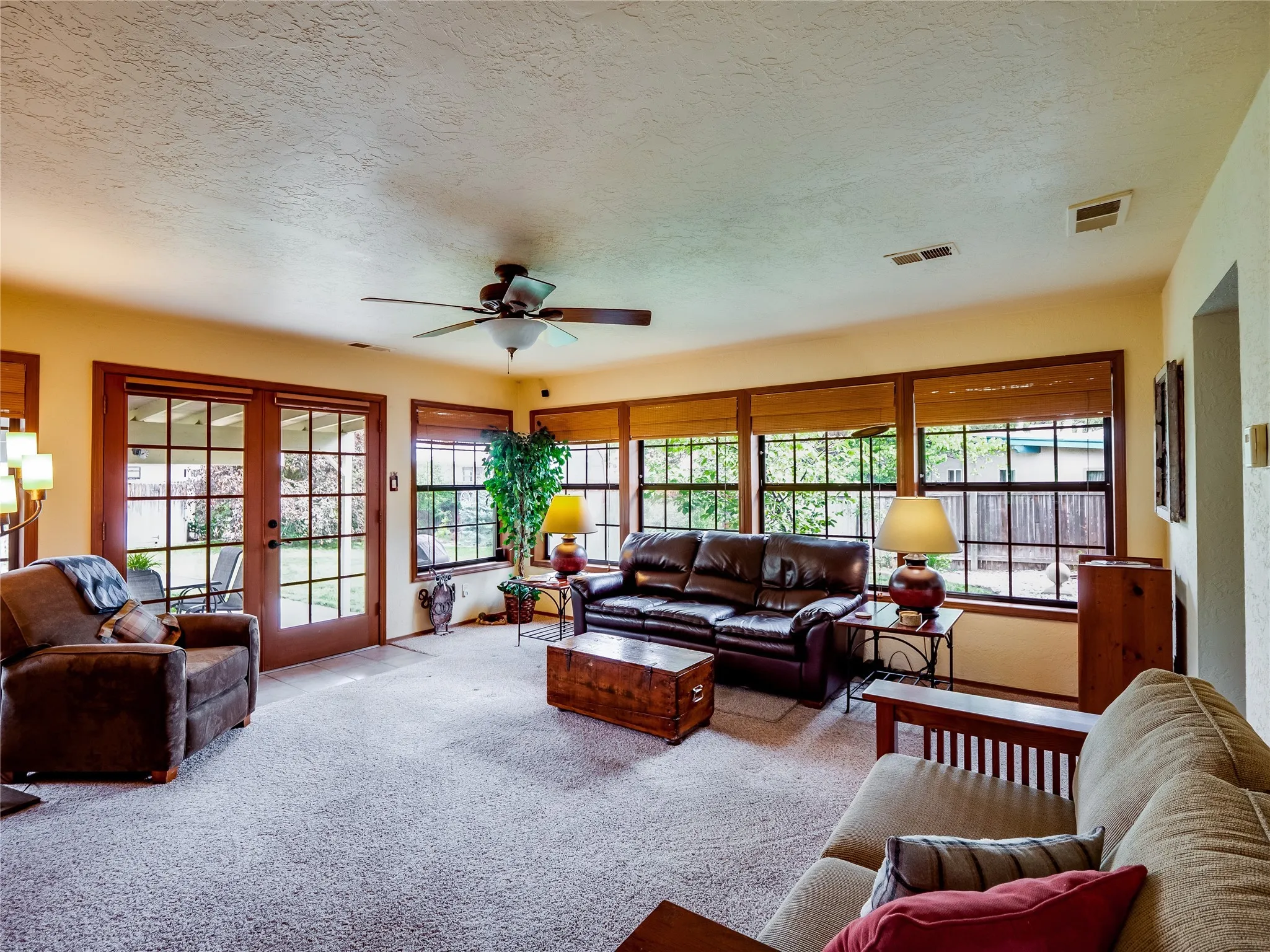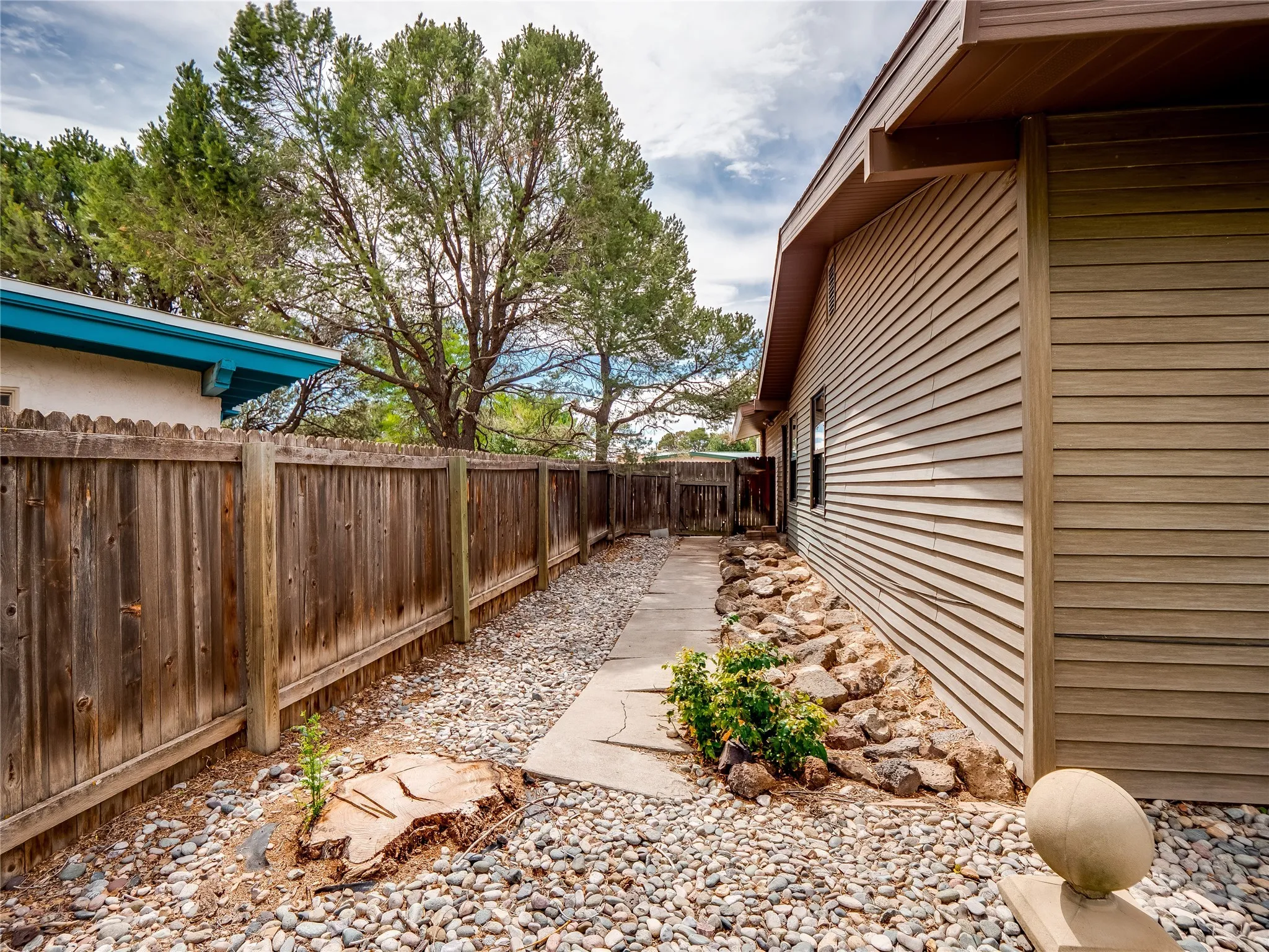 Tucked behind mature trees and shrubs for added privacy, this charming ranch-style home in White Rock offers comfort, functionality, and a serene setting. Step inside through the tiled front entrance hallway, where graceful arched doorways guide you into the spacious living room. Here, a wall of windows overlooks the front yard, filling the space with natural light, while a stove-insert fireplace creates a warm and inviting centerpiece. At the heart of the home is the cozy dining room with tile flooring and a convenient pass-through to the kitchen, making gatherings and meals easy to enjoy. The modern kitchen is beautifully updated with sleek wood cabinets accented by chrome hardware, black granite countertops, and stainless steel appliances, providing ample storage and workspace. Toward the back of the home, the bright family room becomes the perfect retreat, with expansive windows and French doors that open to the covered patio. There is a small space off the Family Room that’s perfect for a small home office. There’s two generously sized guest bedrooms and a full guest bath complete with a single sink vanity and a glass-enclosed tiled shower/tub. The large primary bedroom offers comfort and convenience with its en-suite bath, featuring a tiled walk-in shower and single sink vanity. A laundry room is located near the front of the home, as well as direct access to the two-car garage. Step outside to your private oasis. Thoughtfully landscaped with manicured flower beds, lush grass lawns, and mature shade trees, it provides both beauty and functionality. The covered patio is perfect for barbecues and outdoor dining, while the open lawn offers space for play or gardening. Situated in a peaceful neighborhood and close to local parks and scenic trails, this home combines privacy with modern convenience in a desirable location. Take a tour today and discover the warmth and charm this home has to offer!