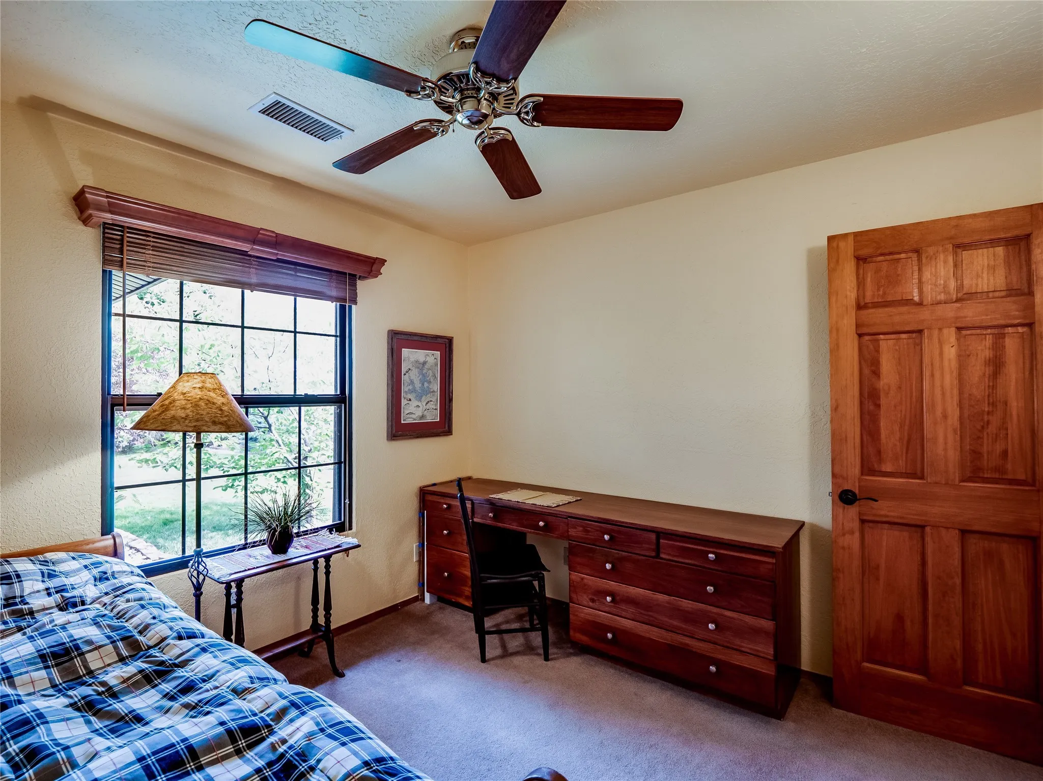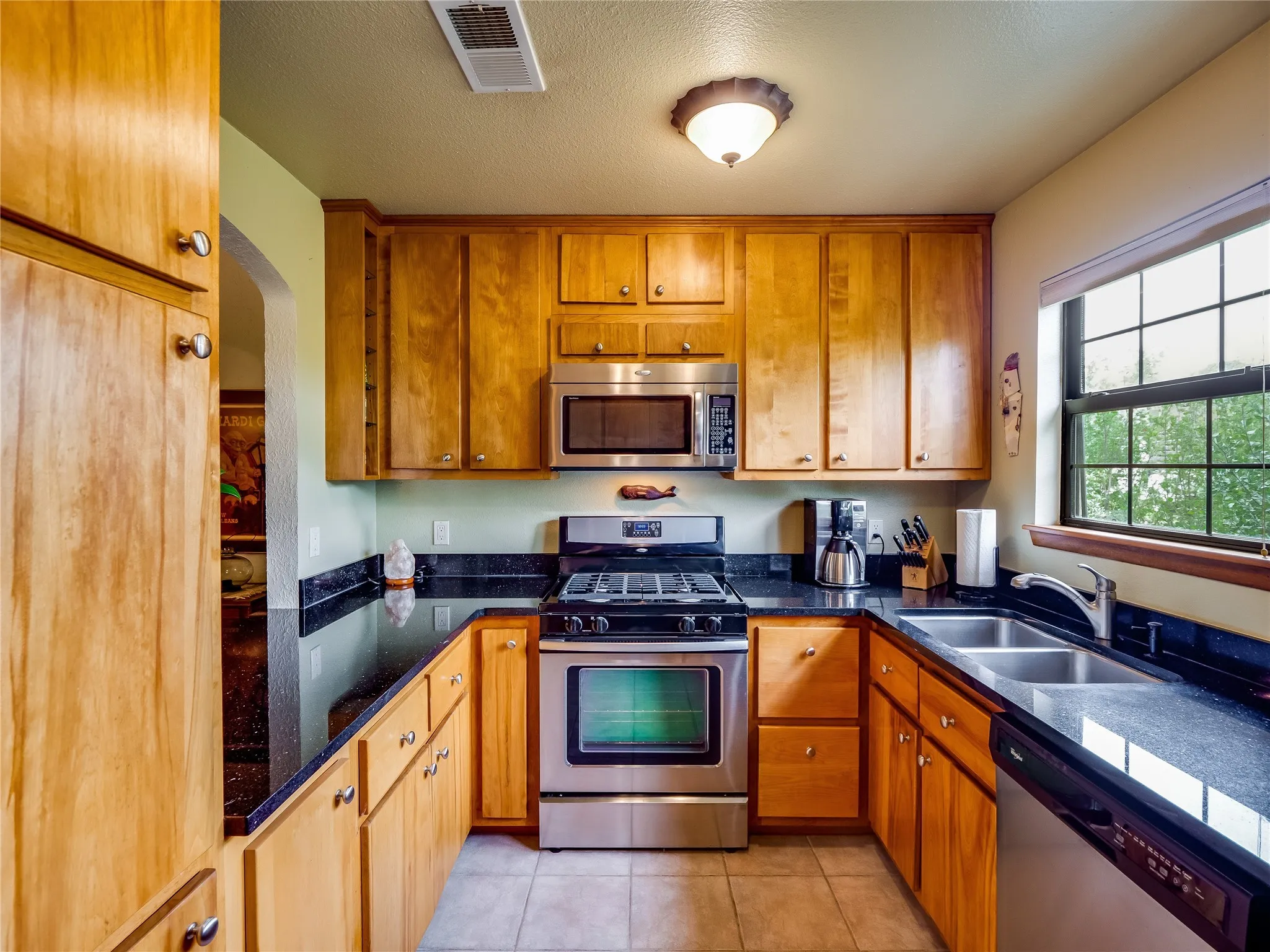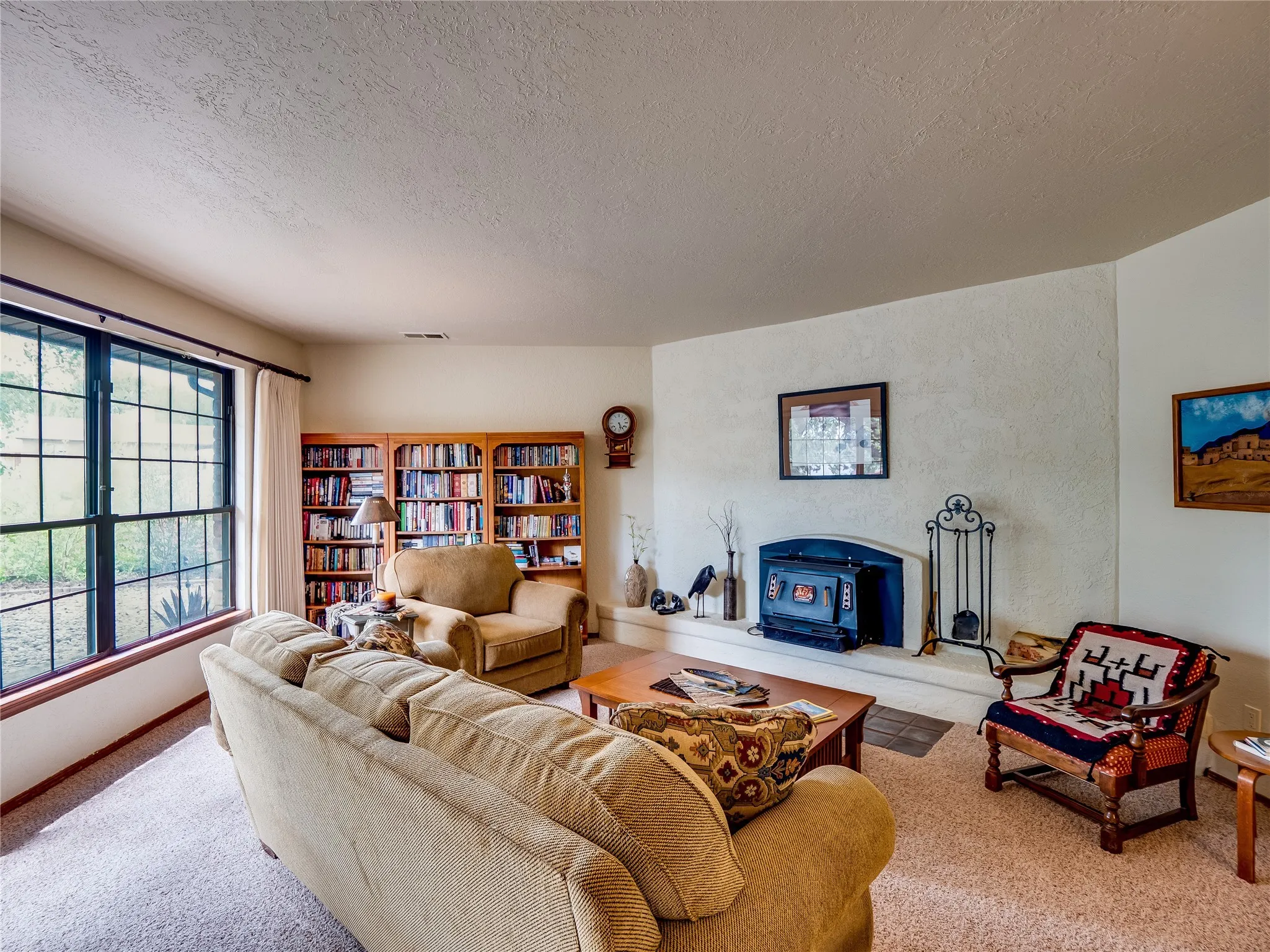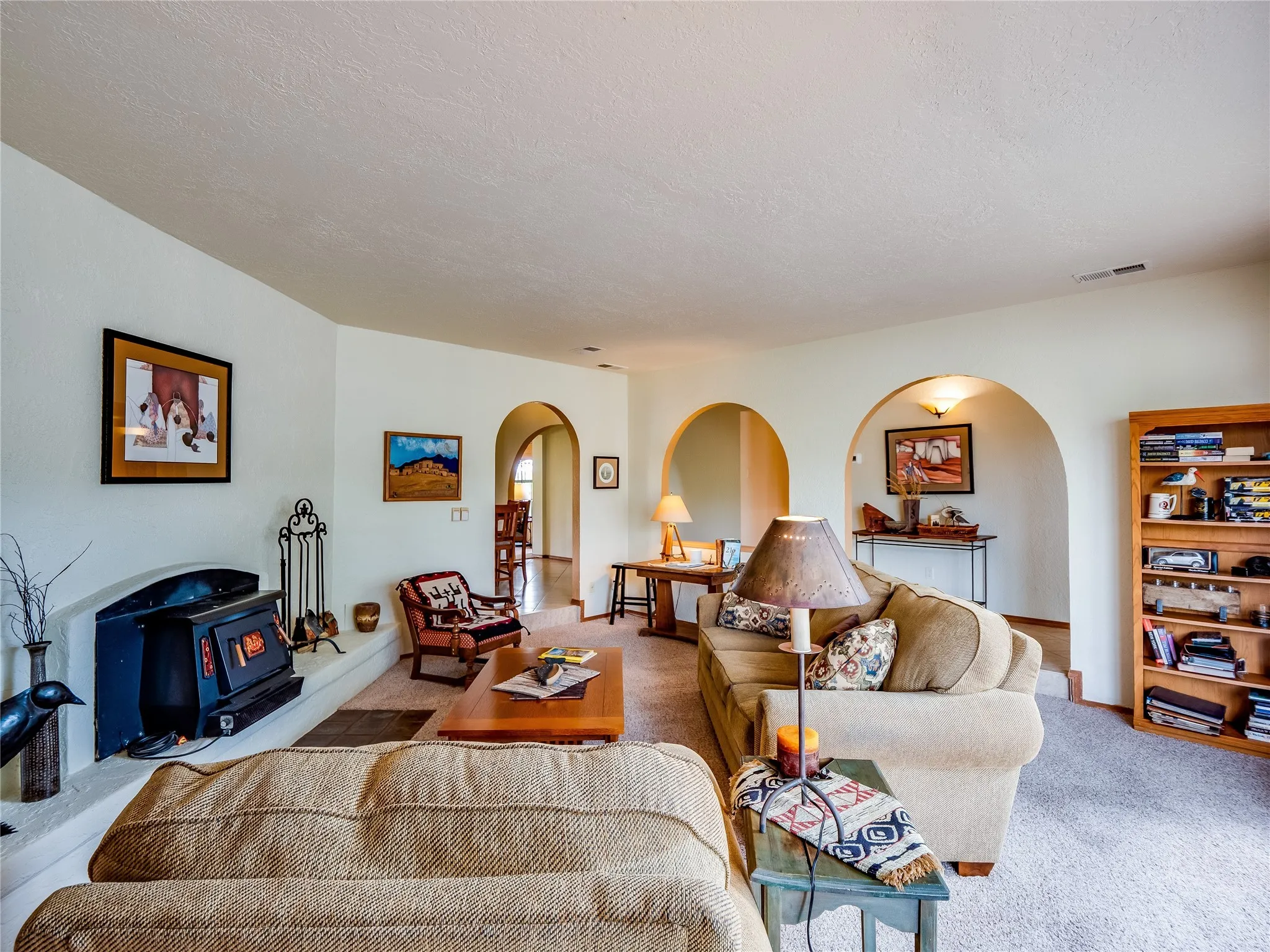 Tucked behind mature trees and shrubs for added privacy, this charming ranch-style home in White Rock offers comfort, functionality, and a serene setting. Step inside through the tiled front entrance hallway, where graceful arched doorways guide you into the spacious living room. Here, a wall of windows overlooks the front yard, filling the space with natural light, while a stove-insert fireplace creates a warm and inviting centerpiece. At the heart of the home is the cozy dining room with tile flooring and a convenient pass-through to the kitchen, making gatherings and meals easy to enjoy. The modern kitchen is beautifully updated with sleek wood cabinets accented by chrome hardware, black granite countertops, and stainless steel appliances, providing ample storage and workspace. Toward the back of the home, the bright family room becomes the perfect retreat, with expansive windows and French doors that open to the covered patio. There is a small space off the Family Room that’s perfect for a small home office. There’s two generously sized guest bedrooms and a full guest bath complete with a single sink vanity and a glass-enclosed tiled shower/tub. The large primary bedroom offers comfort and convenience with its en-suite bath, featuring a tiled walk-in shower and single sink vanity. A laundry room is located near the front of the home, as well as direct access to the two-car garage. Step outside to your private oasis. Thoughtfully landscaped with manicured flower beds, lush grass lawns, and mature shade trees, it provides both beauty and functionality. The covered patio is perfect for barbecues and outdoor dining, while the open lawn offers space for play or gardening. Situated in a peaceful neighborhood and close to local parks and scenic trails, this home combines privacy with modern convenience in a desirable location. Take a tour today and discover the warmth and charm this home has to offer!