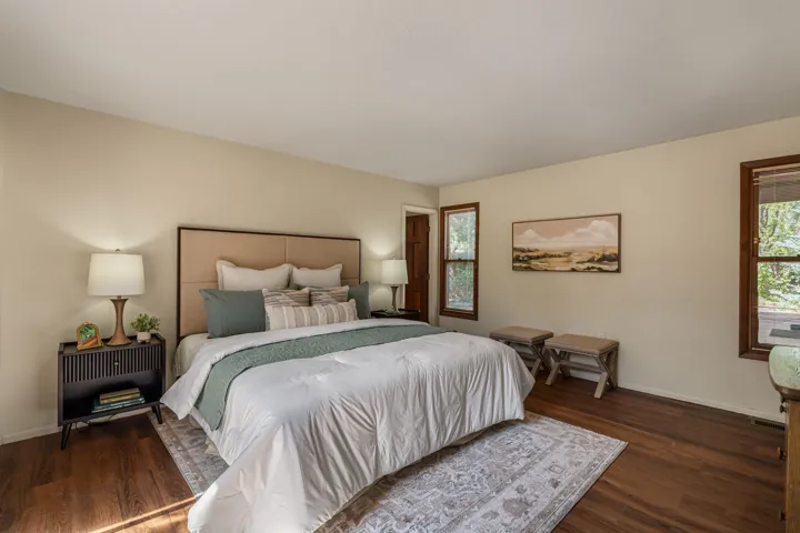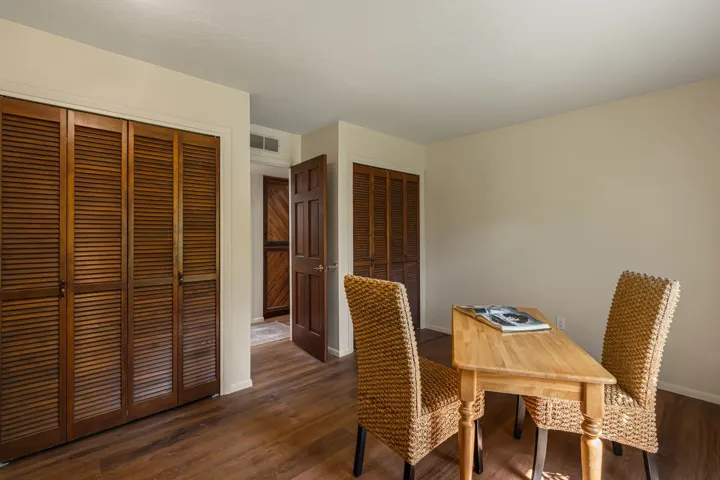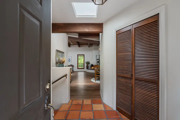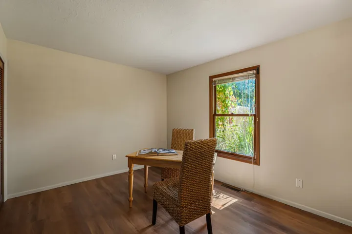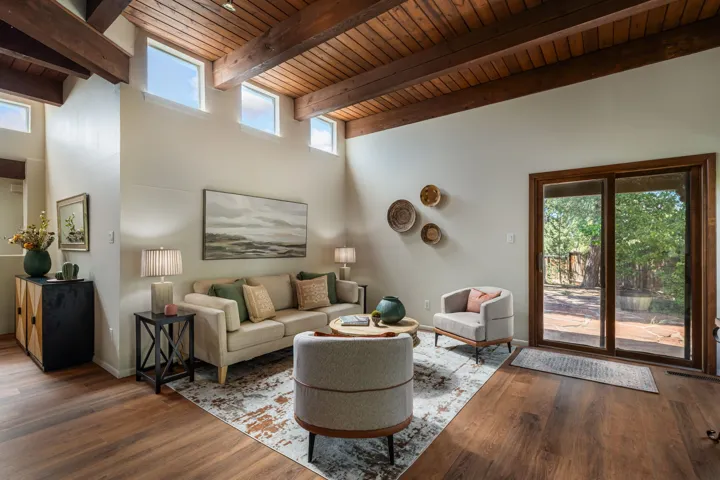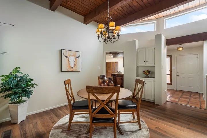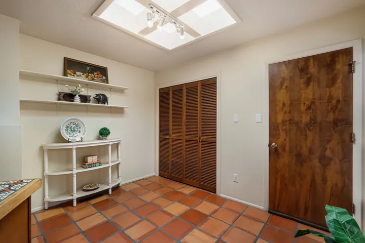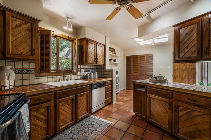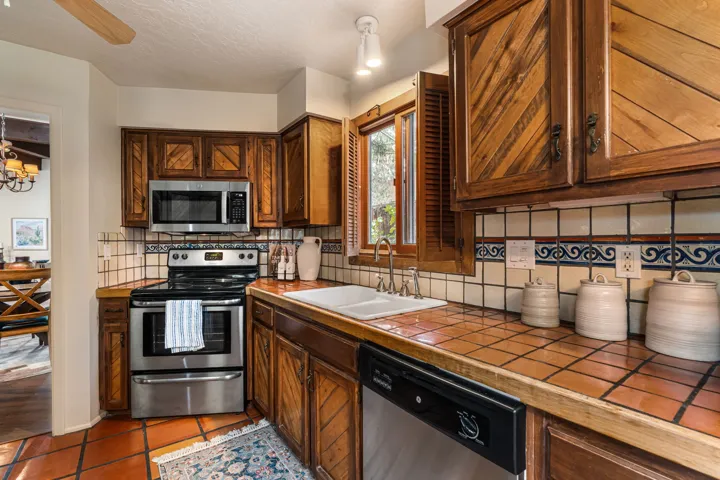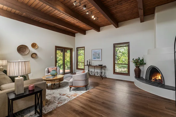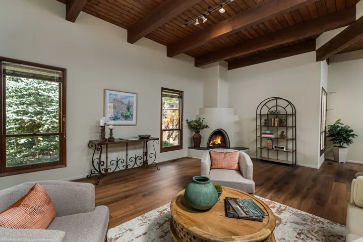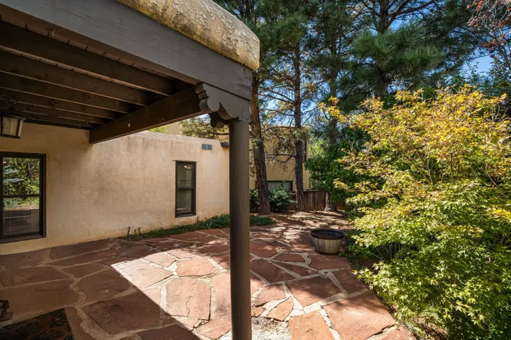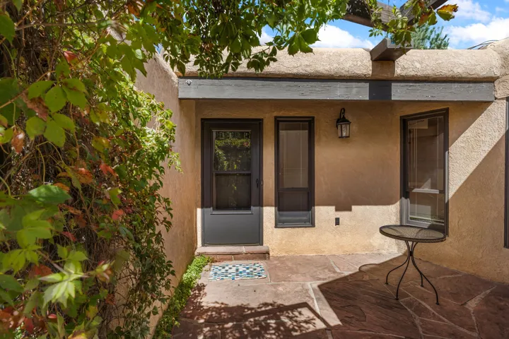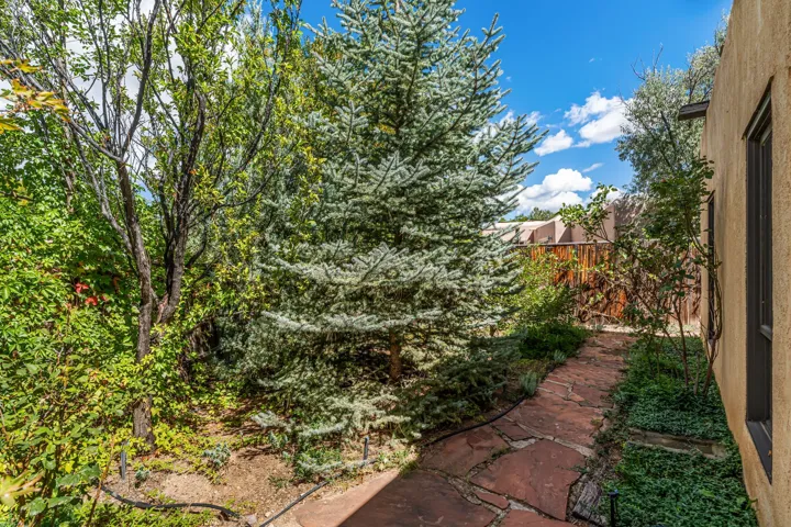 Welcome to this beautiful, single-level home in the quiet interior of Park Plazas, one of Santa Feās most desirable neighborhoods. The spacious living and dining room is filled with natural light from clerestory windows with diffusers, and features a wood-burning corner Kiva fireplace with stone banco as well as sliding doors that open to a lovely flagstone patio and lush outdoor retreat. The kitchen offers matching, all stainless appliances, colorful Mexican tile counters, and a generous breakfast nook with a large skylight that connects conveniently to the two-car garage. The primary suite includes sliding doors to a private enclosed patio, a spacious walk-in closet, and an ensuite ¾ bath, while the second bedroom has two closets and the guest bath features a Talavera sink and skylight. Outdoors, the property delights with fruit treesāincluding apricot, plum, nectarine, and cooking cherriesāalong with grapevines, roses, and abundant plantings, all on a timed drip irrigation system. Stately evergreens line the west side of the yard in a graceful semi-circle, creating both beauty and privacy. With newer flooring throughout, fresh paint, forced-air heating, and refrigerated air conditioning, this home is move-in ready. Park Plazas residents enjoy miles of walking trails, a community garden, playground, basketball and tennis courts, and an off-leash dog parkāall just minutes from Santa Feās shopping, dining, and cultural attractions.