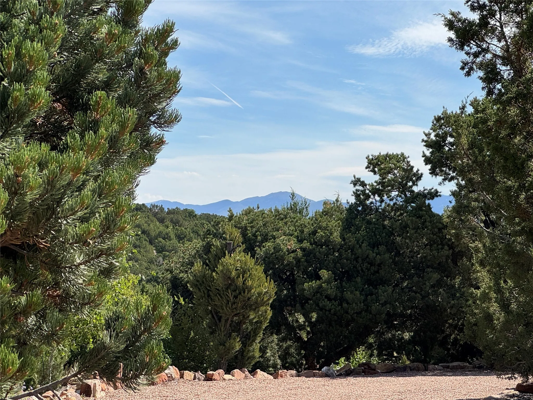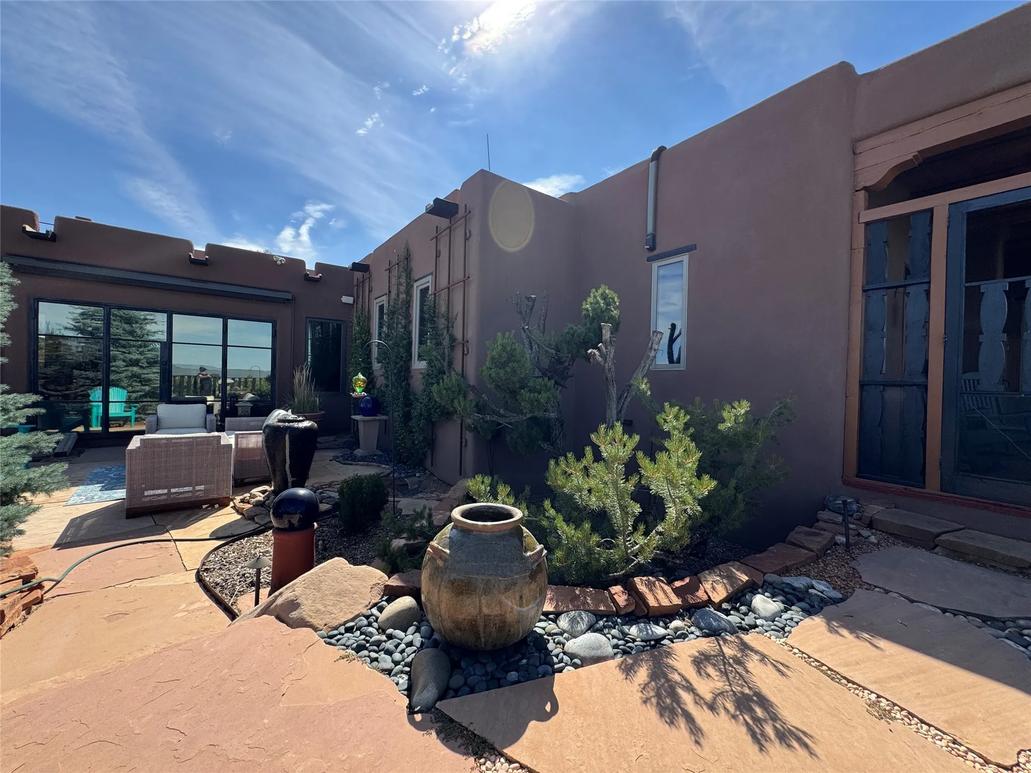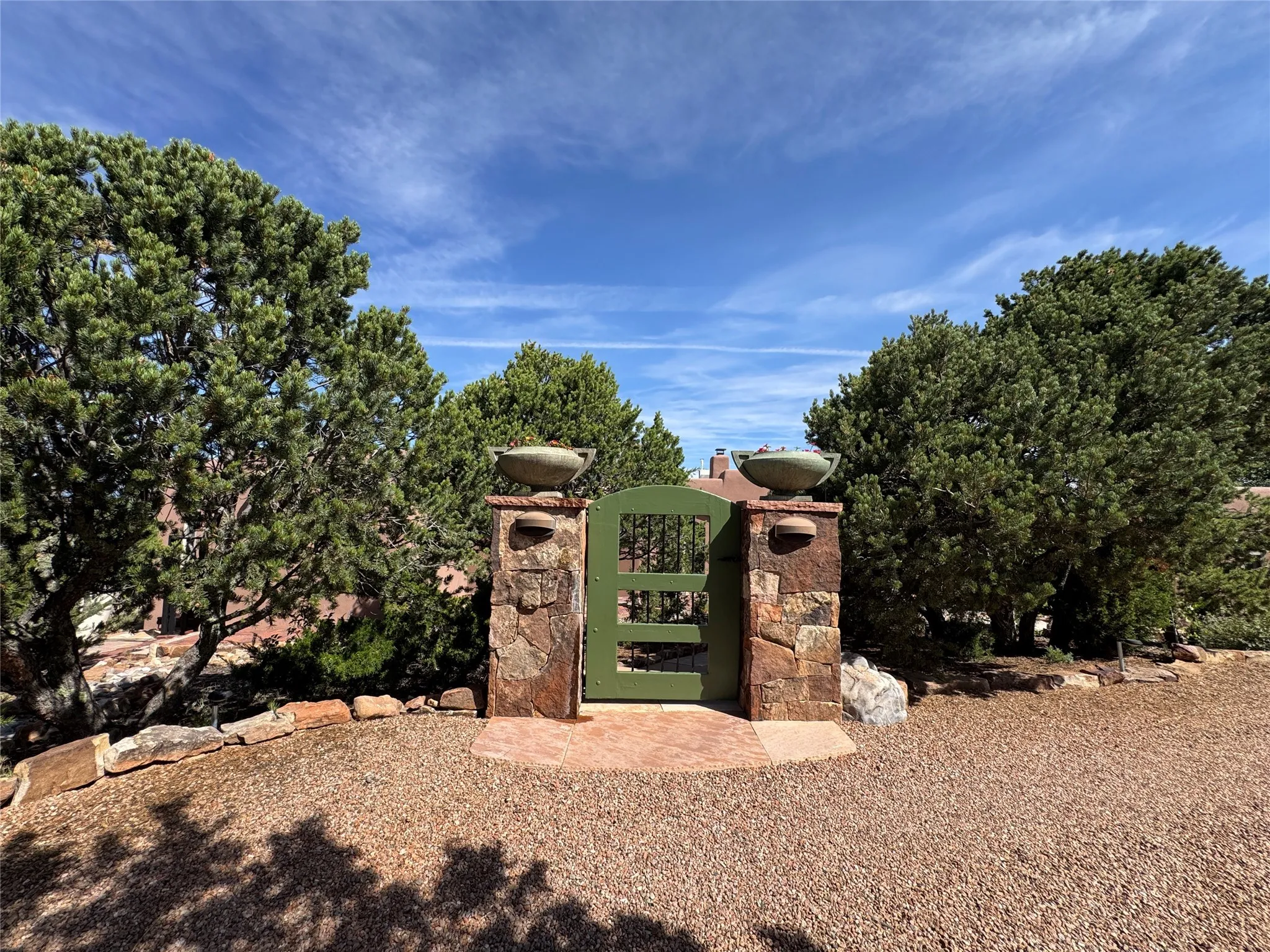Come discover the beauty of 67 Vallecito Road. This dreamy Santa Fe home is on 3.5 acres with great mountain views only 10 minutes outside of Santa Fe. The home has 3 bedrooms plus a flex room that could be used as an office or additional bedroom with a closet and wood burning kiva fireplace. Other custom features include: Radiant in-floor heating, metal clad insulated wood windows, Italian Tile and Berber Carpet, custom crafted wood interior doors, 3 brick paved portals, viga ceilings with herringbone pine decking and latillas, and 6 custom designed masonry fireplaces. Check out the exquisite chef’s kitchen with a large kitchen island, Wolf gas stove, large refrigerator with built-in wine cooler. The interior doorways with scalloped carved archways, and thick recessed wall and nichos give a warm and unique feel to this Northern New Mexico home. The living room and dining rooms flow together nicely and both have doors leading to the outside portals that wrap around the back of the house. There is a dreamy walled patio with a private garden off the dining room that includes a goldfish pond with waterfall, perfect for cozying up with a good book or stargazing at night. The main bedroom also features a fireplace, large soaking tub with mountain views and it’s own private portal with a peaceful water feature perfect for relaxing with that first cup of coffee in the morning. An 1800 gallon cistern system catches the rain water draining off the roof, providing water for the irrigation system throughout the yard. E/V charger in garage. Come see and experience this peaceful, high desert oasis with some of the most beautiful sunsets in the Southwest!