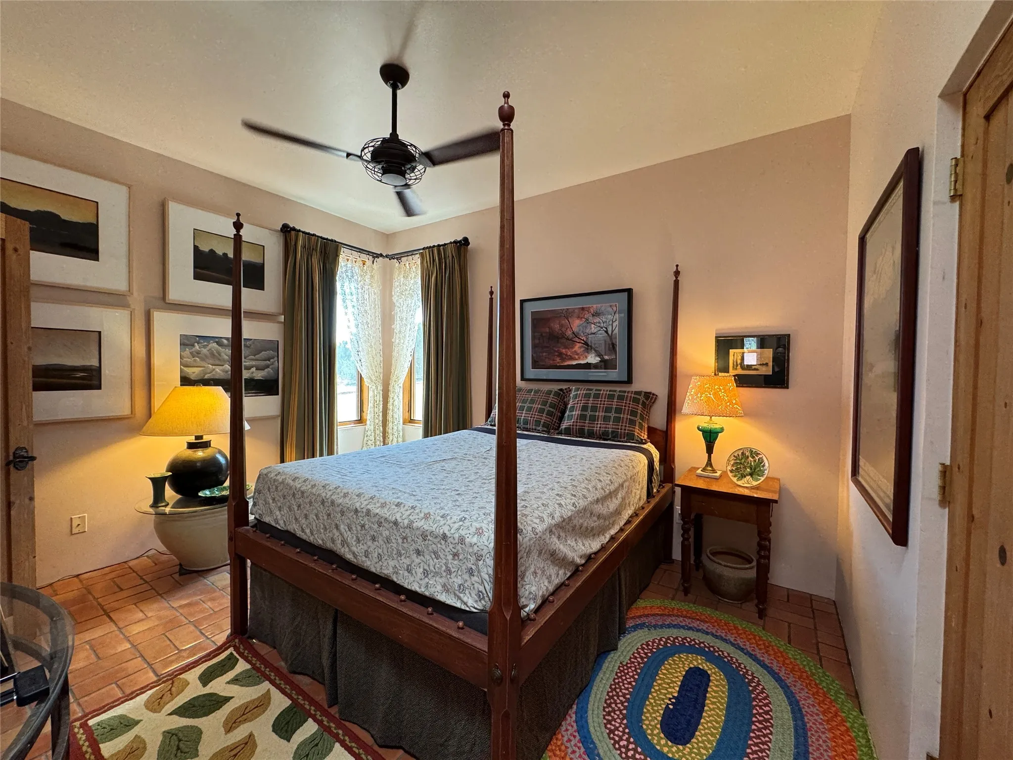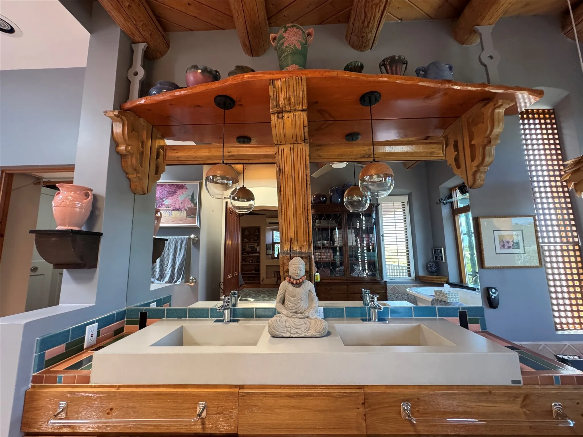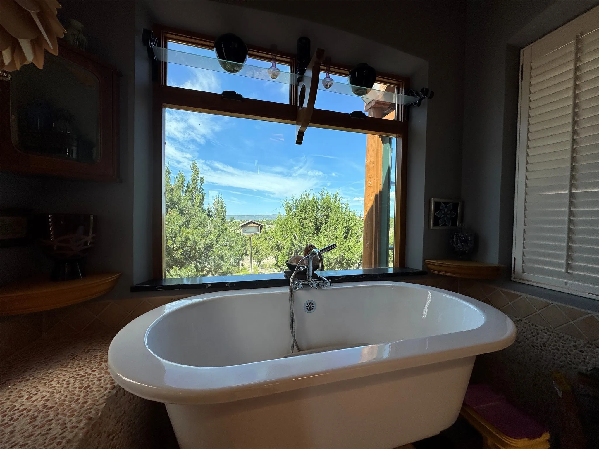 Come discover the beauty of 67 Vallecito Road. This dreamy Santa Fe home is on 3.5 acres with great mountain views only 10 minutes outside of Santa Fe. The home has 3 bedrooms plus a flex room that could be used as an office or additional bedroom with a closet and wood burning kiva fireplace. Other custom features include: Radiant in-floor heating, metal clad insulated wood windows, Italian Tile and Berber Carpet, custom crafted wood interior doors, 3 brick paved portals, viga ceilings with herringbone pine decking and latillas, and 6 custom designed masonry fireplaces. Check out the exquisite chef’s kitchen with a large kitchen island, Wolf gas stove, large refrigerator with built-in wine cooler. The interior doorways with scalloped carved archways, and thick recessed wall and nichos give a warm and unique feel to this Northern New Mexico home. The living room and dining rooms flow together nicely and both have doors leading to the outside portals that wrap around the back of the house. There is a dreamy walled patio with a private garden off the dining room that includes a goldfish pond with waterfall, perfect for cozying up with a good book or stargazing at night. The main bedroom also features a fireplace, large soaking tub with mountain views and it’s own private portal with a peaceful water feature perfect for relaxing with that first cup of coffee in the morning. An 1800 gallon cistern system catches the rain water draining off the roof, providing water for the irrigation system throughout the yard. E/V charger in garage. Come see and experience this peaceful, high desert oasis with some of the most beautiful sunsets in the Southwest!