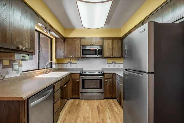 Welcome to the sought after community of Valle del Sol with excellent proximity to The Plaza and Ft. Marcy Park and Recreation Center. Bring you creative vision and contractor to this 3 bedroom, 2 1/2 bath with tremendous views of the Sangre de Cristo Mountains and Santa Fe. Two bedrooms downstairs both with ensuite bathrooms. One bedroom on main level better used as an office or den and power room. Brand new TPO roof with 10 year transferrable warranty. Property sold it’s current condition and priced to sell!