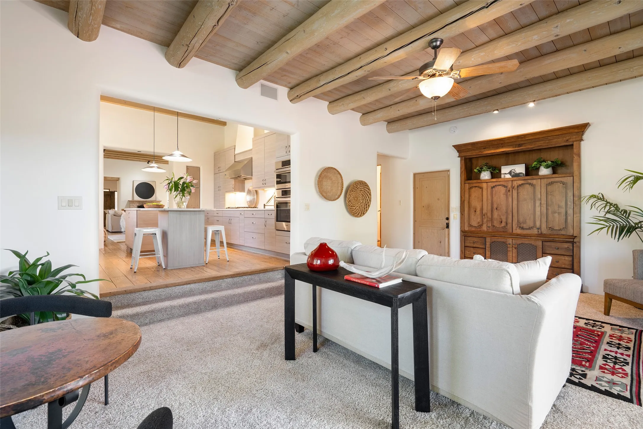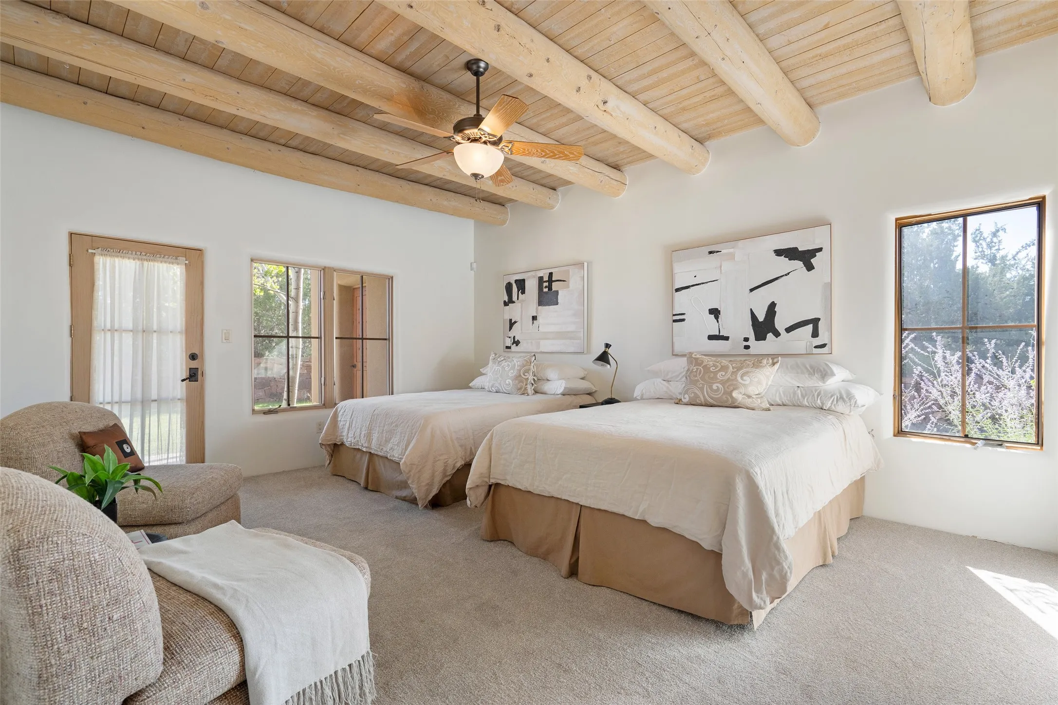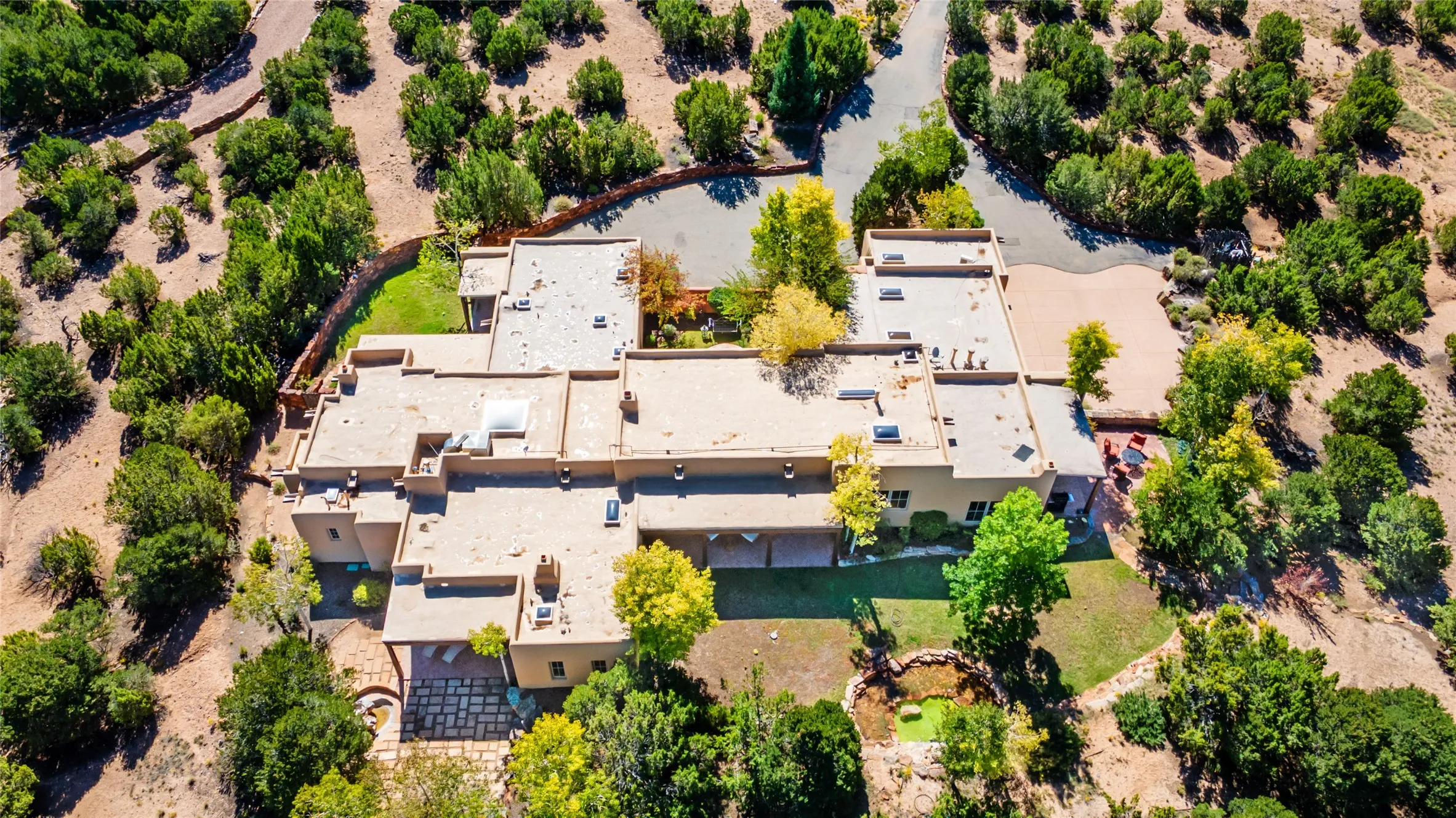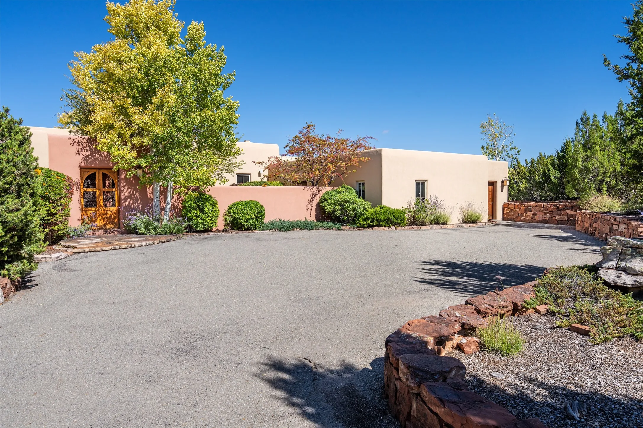 SERENE & PRIVATE SANTA FE ESTATE. Nestled on over 2 acres in one of Santa Fe’s premier communities, this 4 bedroom, 4.5 bath home offers an elegant blend of scale and comfort. Thoughtfully designed for both grand entertaining and easy day-to-day living. A light filled great room with a fireplace anchors the home, while patios off nearly every room invite seamless indoor/outdoor living. The recently remodeled kitchen will delight culinary enthusiasts, and a finished office space – converted from one of the 3 garage bays – adds flexibility for today’s lifestyle. The private guest addition features its own living room and en-suite, complemented by two additional guest suites each with private baths. Outdoors, a long driveway leads to two lush courtyards filled with grass flowers, trees, and shrubs, Multiple apple trees and two tranquil water features enhance the serene setting. Despite its generous footprint, the home maintains a warm, welcoming feel, filled with natural light and surrounded by native landscaping for privacy. Just minutes from downtown Santa Fe and with easy highway access, this property offers the best of Southwestern living – spacious, secluded, and perfectly situated. *This home is being sold as-is, where is*