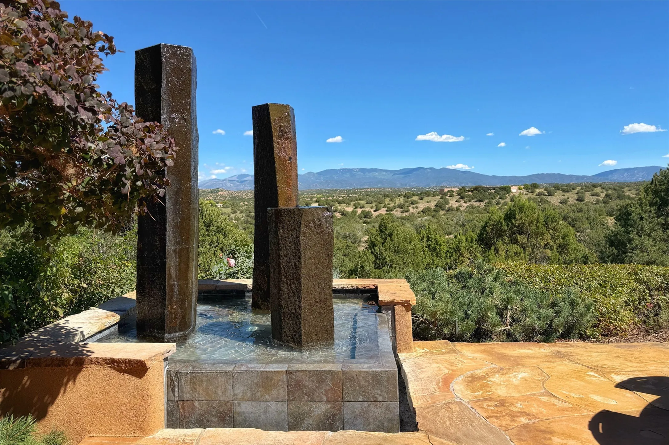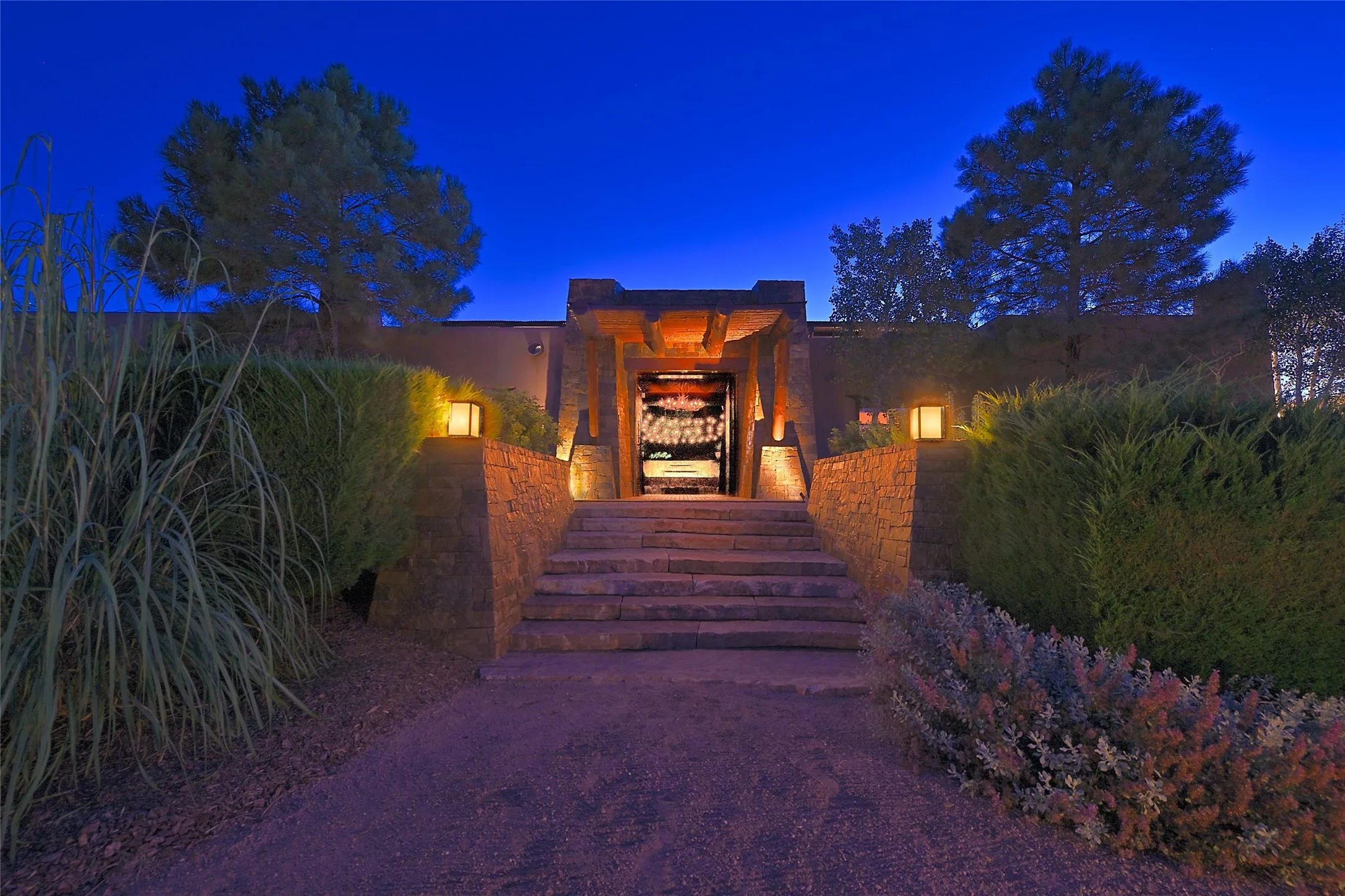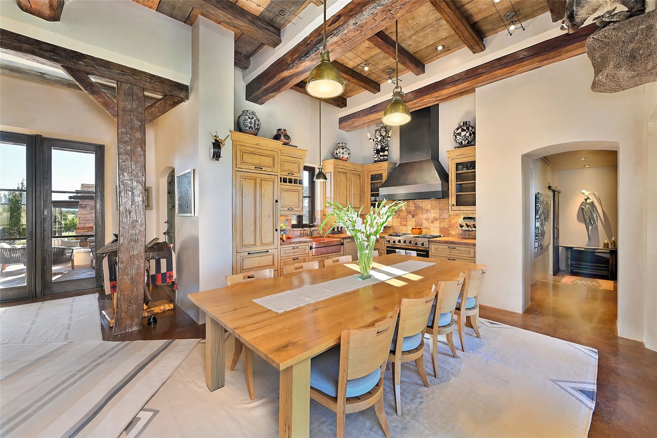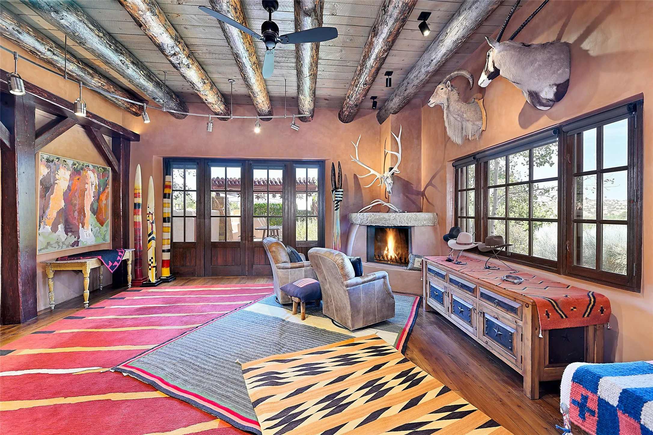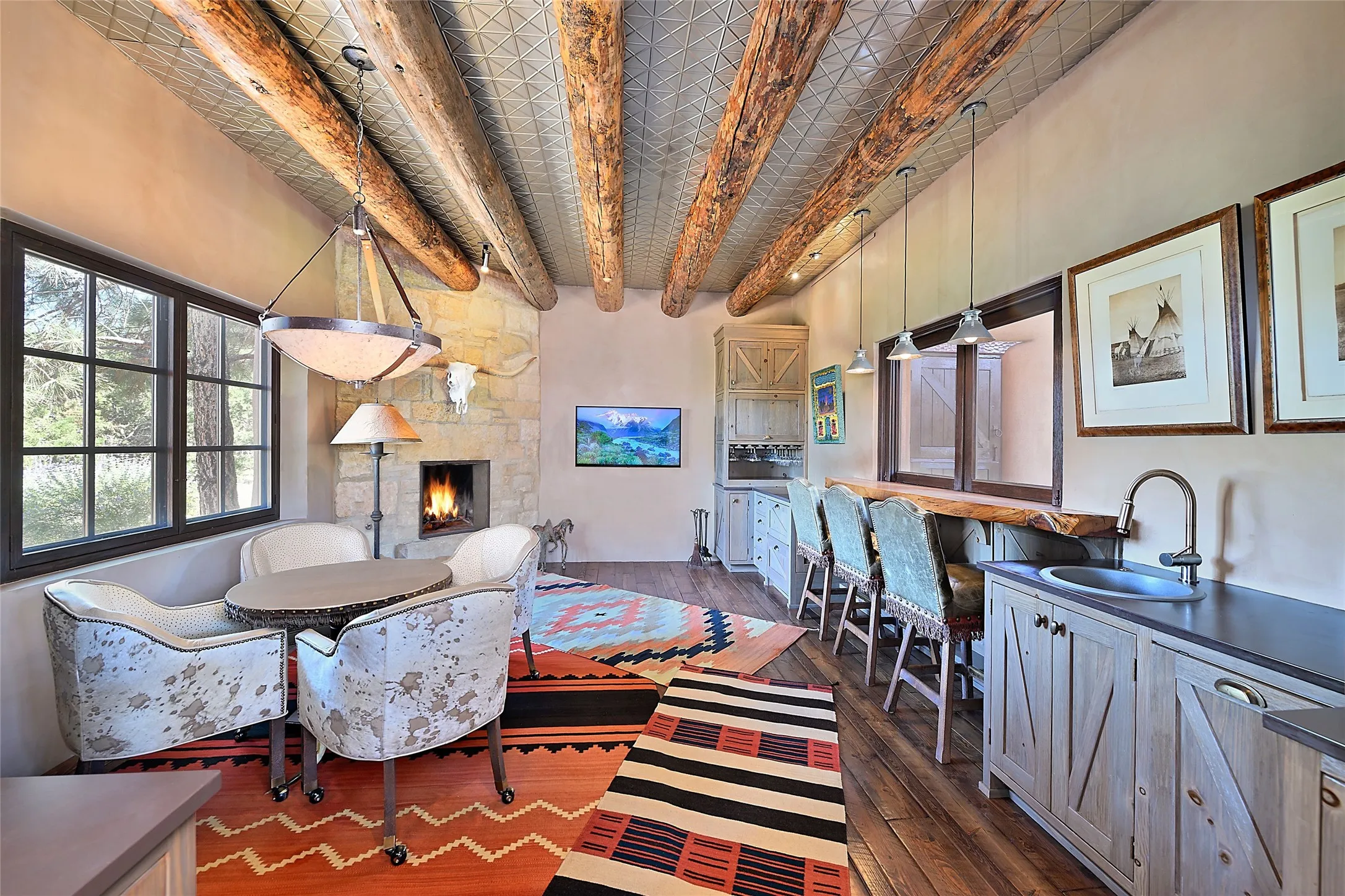Designed by Steven Samuelson Studio, the residence and guest compound exude rustic elegance, with a soaring great room anchored by a dramatic stone-and-copper fireplace, and an expansive infinity patio that seems to float above the desert horizon. The outdoor chefās kitchen, complete with wood-fired pizza oven, invites unforgettable gatherings beneath New Mexicoās endless skies. Two spacious bedrooms and a private guest suite ensure comfort and hospitality for family and friends.