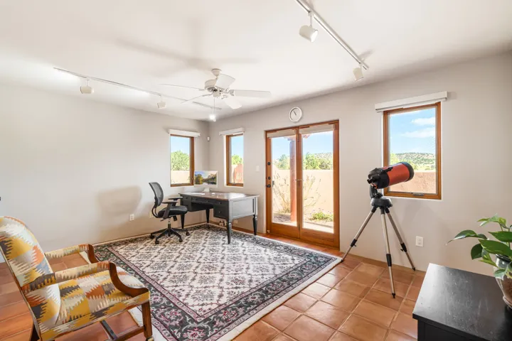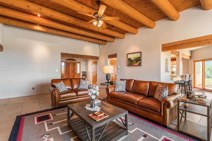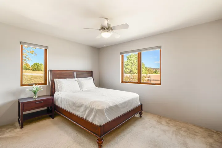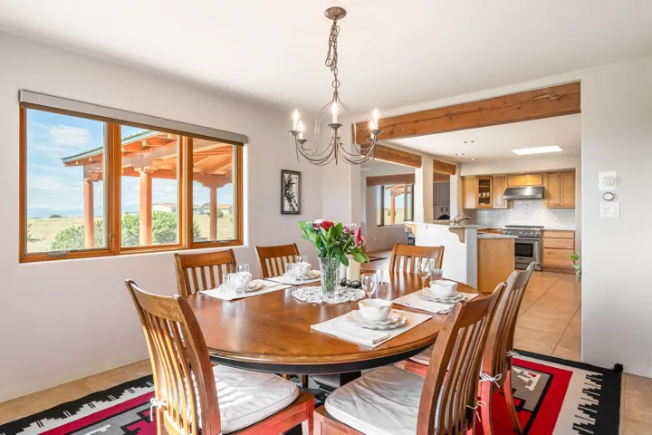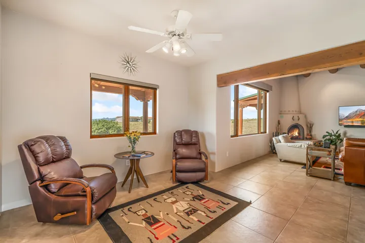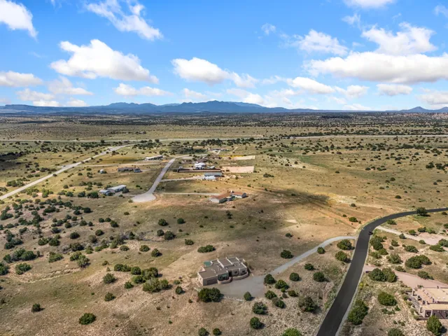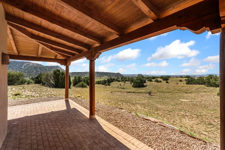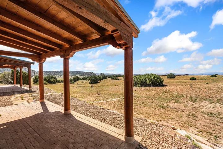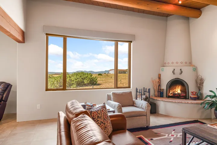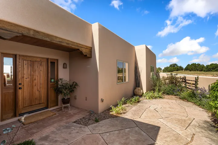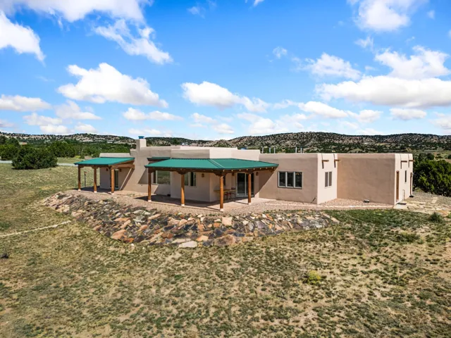 RARE OFFERING IN SPIRIT WIND RANCH! This single-level, passive-solar beauty offers long-range mountain views and privacy. Sited on 5 acres overlooking the Galisteo Basin, Sandia and Ortiz mountains. Radiant heat tubing is WIRSBO. Wonderful kitchen has Taj Mahal counters, bar with seating, two pantries, high-end stainless steel appliances and seating area. Living area has beautiful viga ceilings and wood-burning kiva fireplace. Primary bedroom has a gas fireplace and doors to rear portal. Bath has double sinks, jetted tub, separate shower and walk-in closet. Spacious office/studio space with en-suite 3/4 bath and separate entrance. Property has been pre-inspected and all repairs have been made. Inspection report available on request. Walled front courtyard is on drip with freshly painted gate. Proper laundry with sink and storage. Insulated blinds are all on a remote. Oversized and finished 2-car garage. NO KITEC. NO STEPS. Whole house water filtration – Aguasana. HOA has contract with Farrellgas for reduced rates. Septic has been inspected and lot corners are flagged.